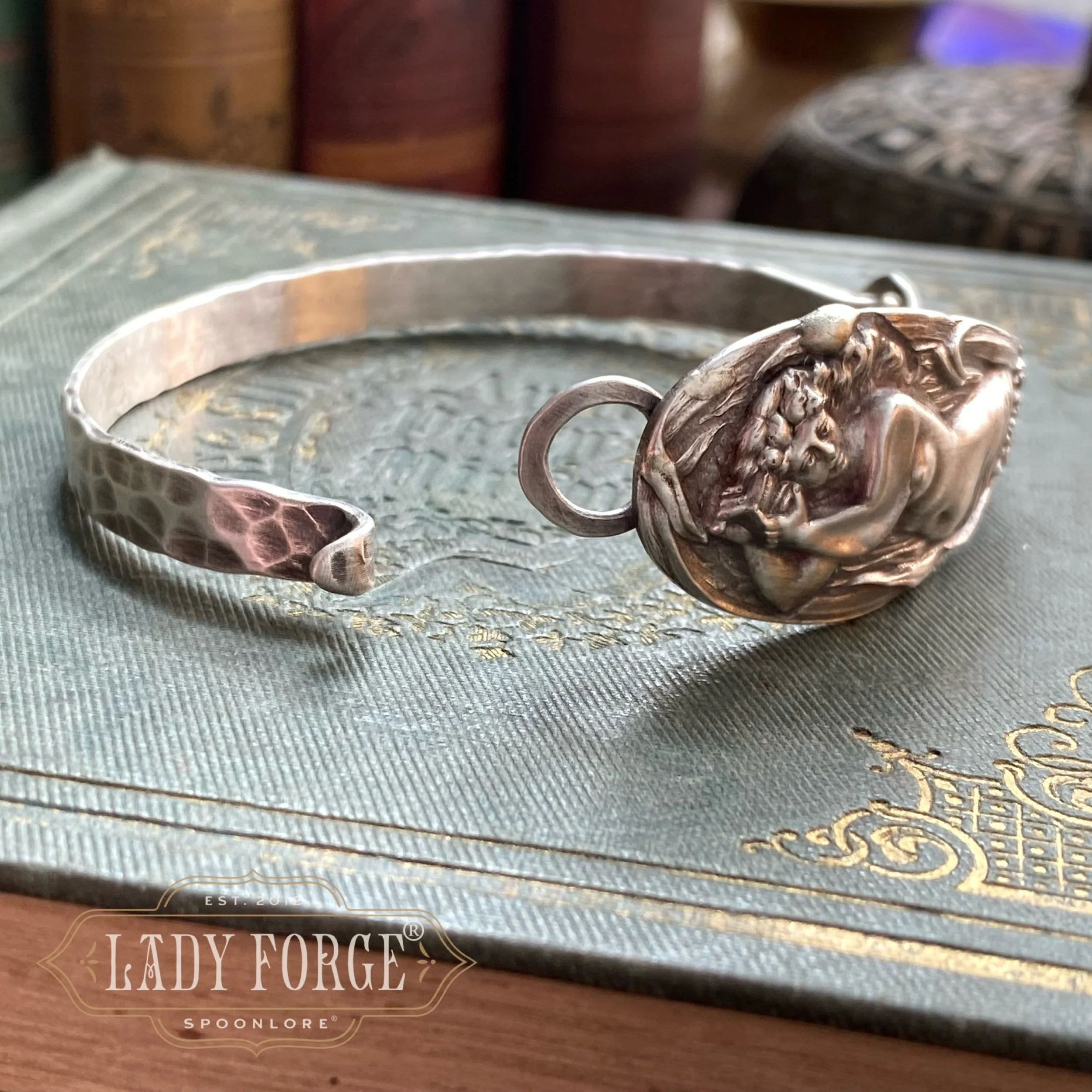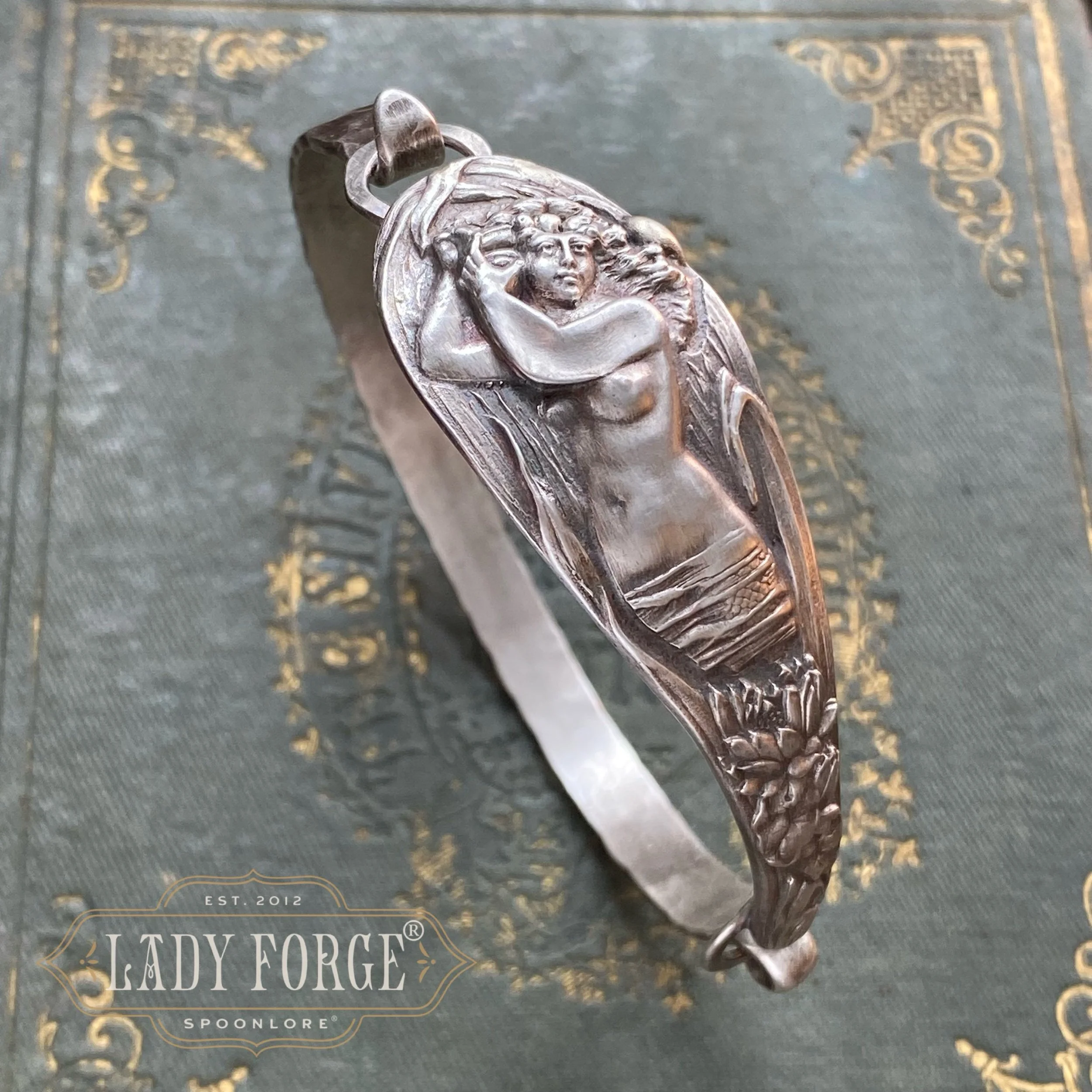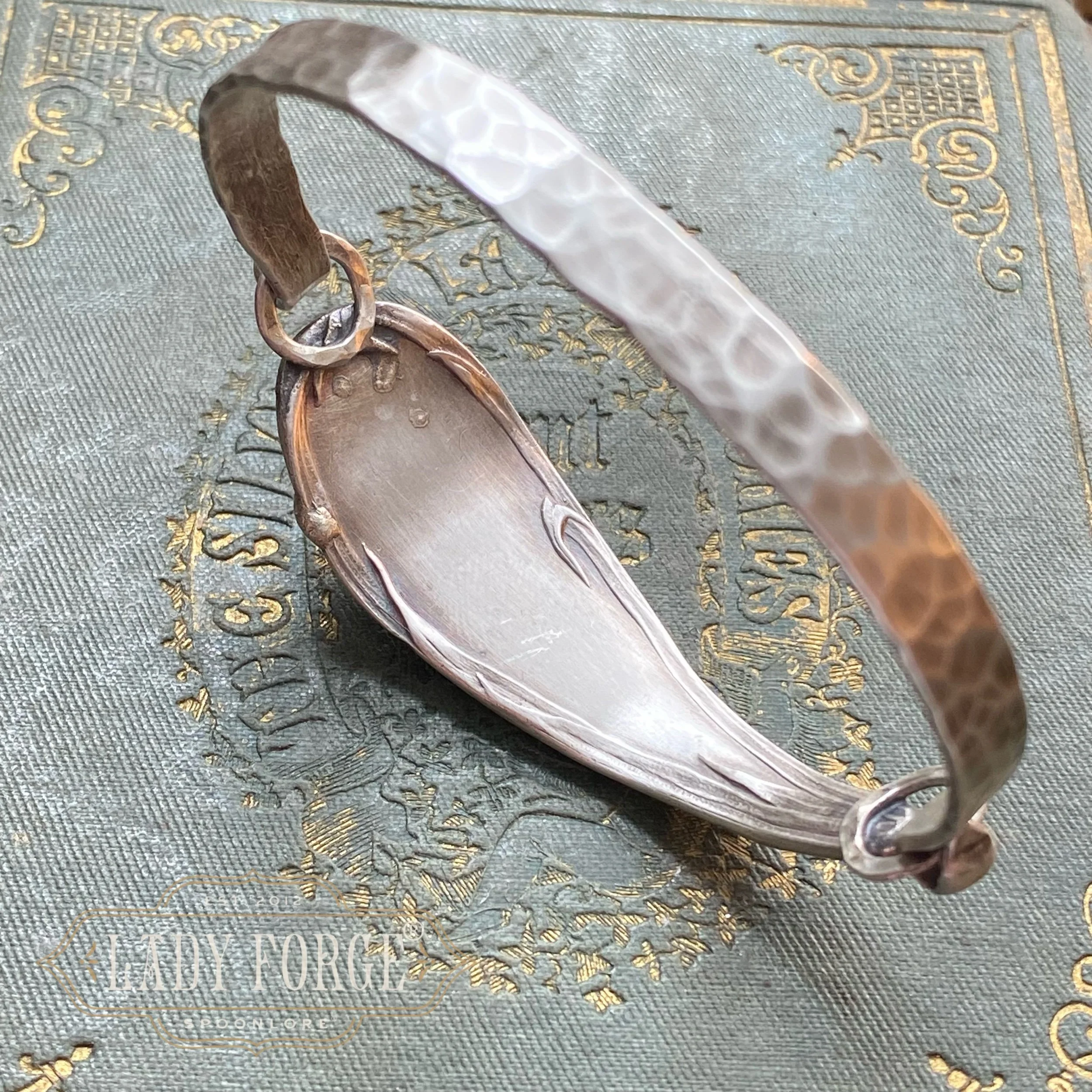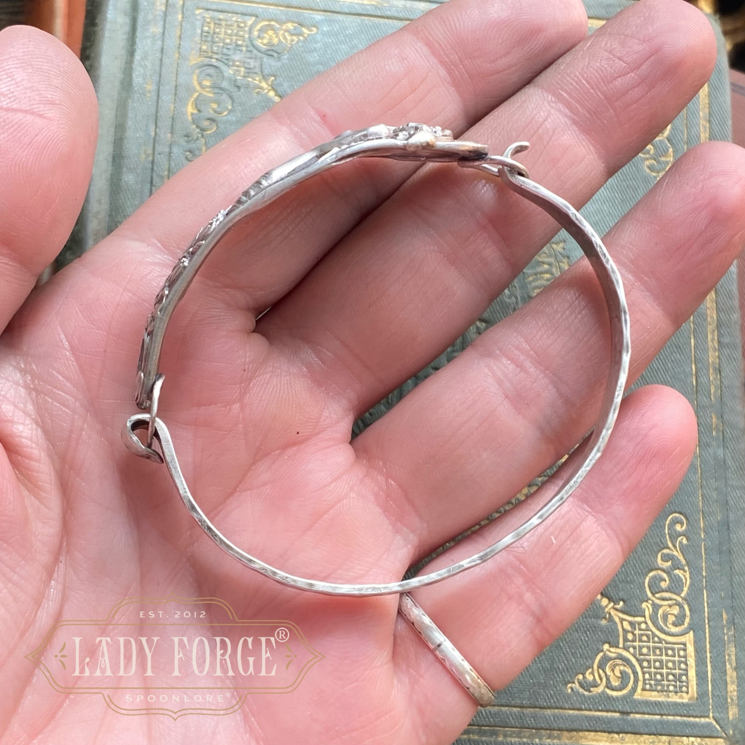 Each Lady Forge Spoon Bangle is hand formed using the portion of the spoon handle with the most design, and is paired with a hand-fabricated sterling silver band that forms the underside of the bracelet which opens and closes on one side. Therefore, the bracelet doesn’t feel too heavy or bulky, and should not rotate on the hand if correct wrist measurements are given (let me know in the order notes)