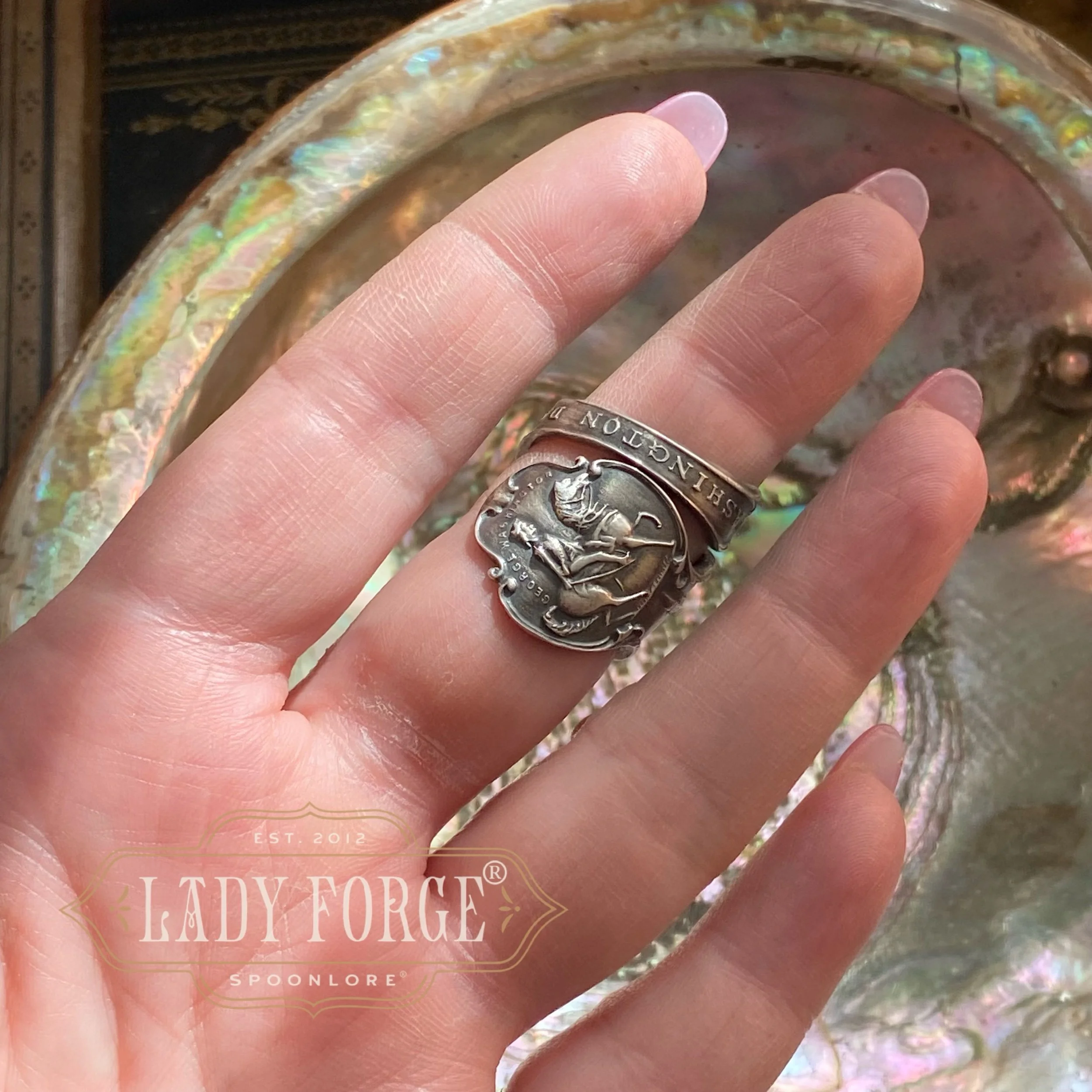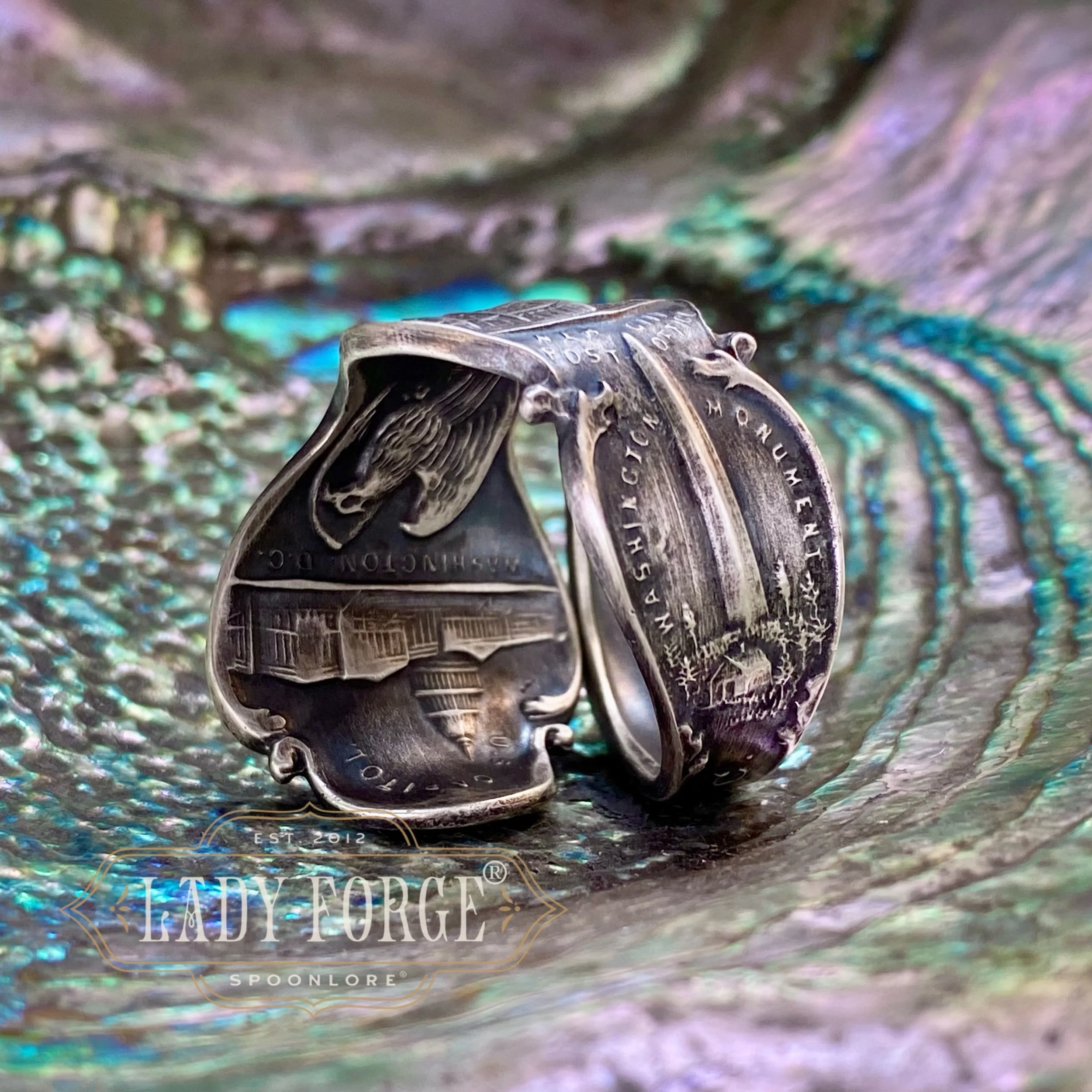 This sterling spoon ring was made from the Washington DC pattern designed by the and in own American maker (unmarked) between 1890-1920