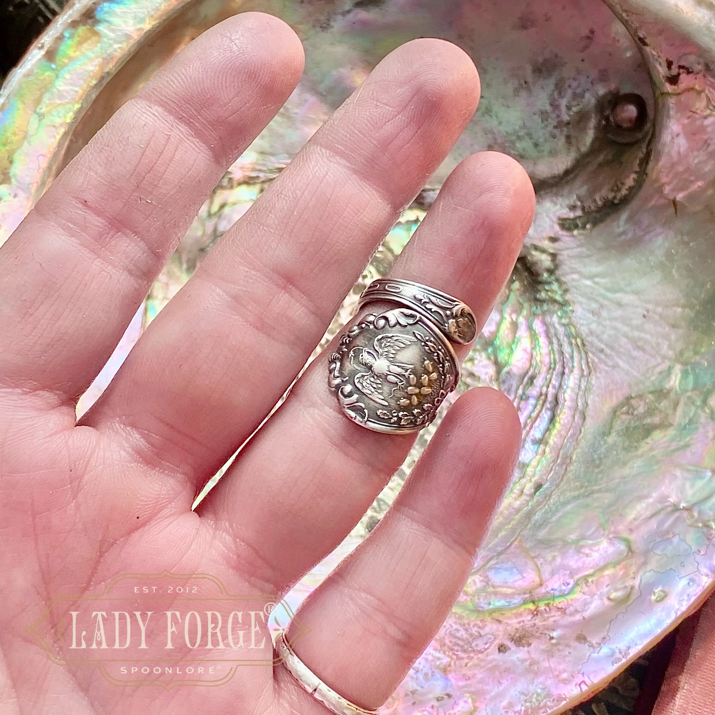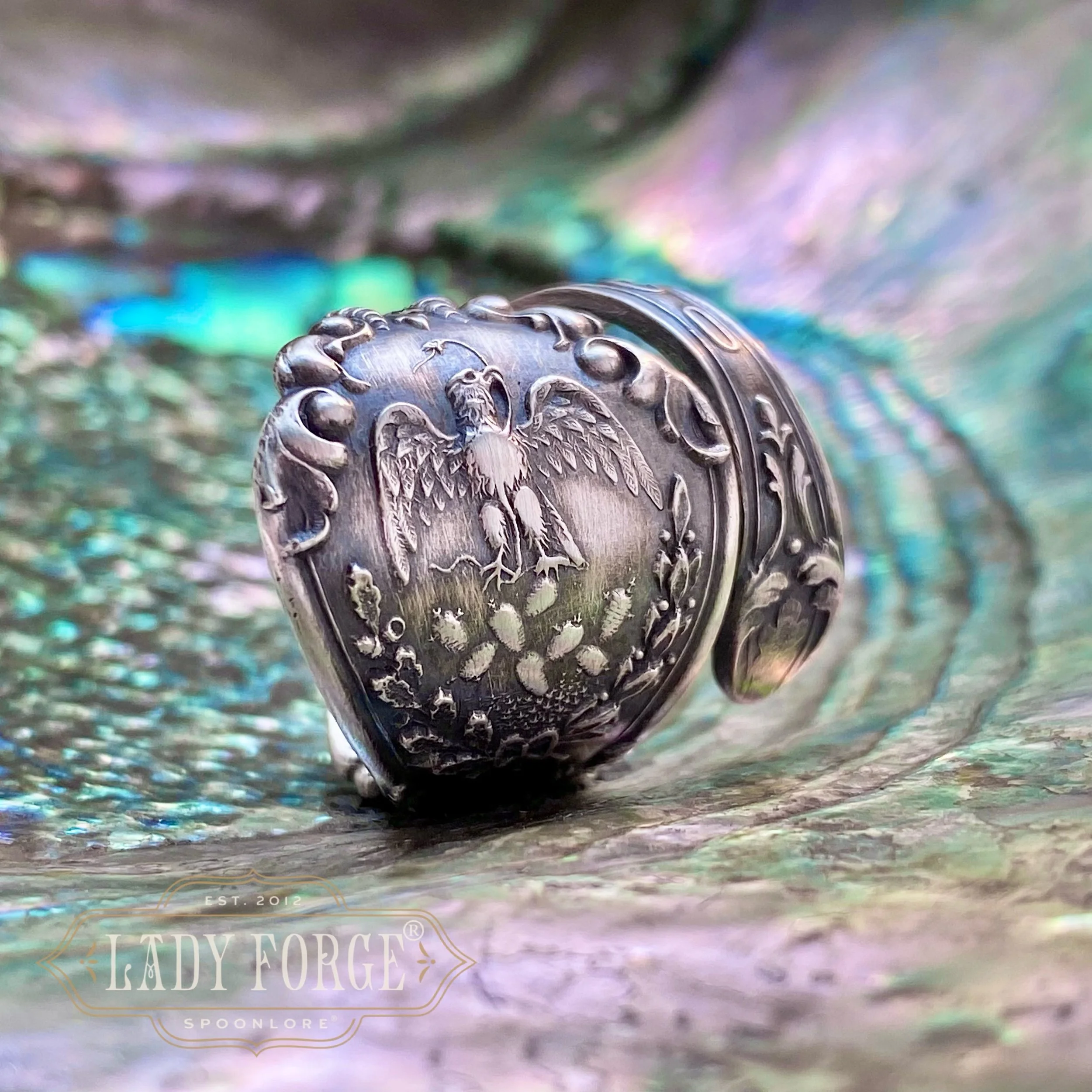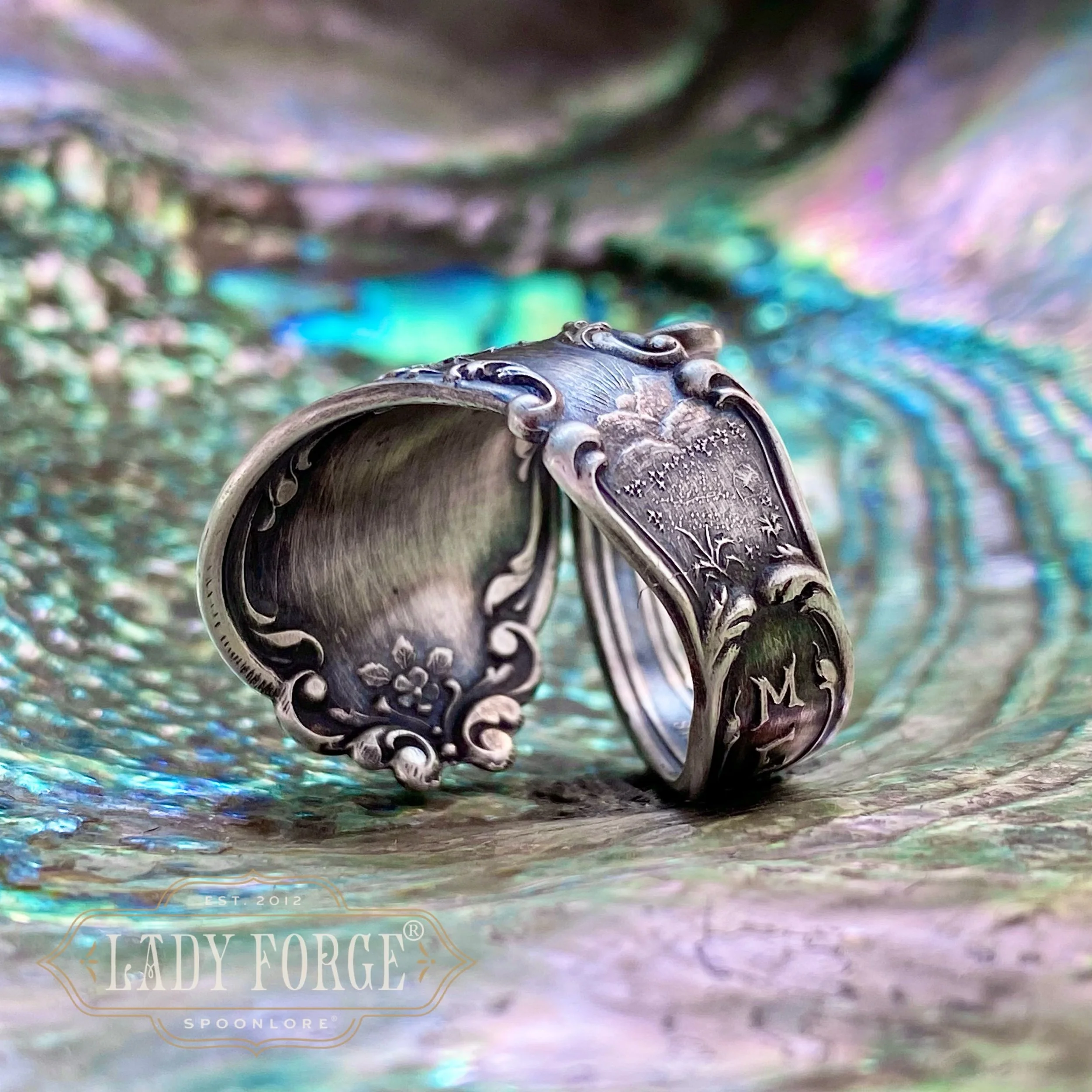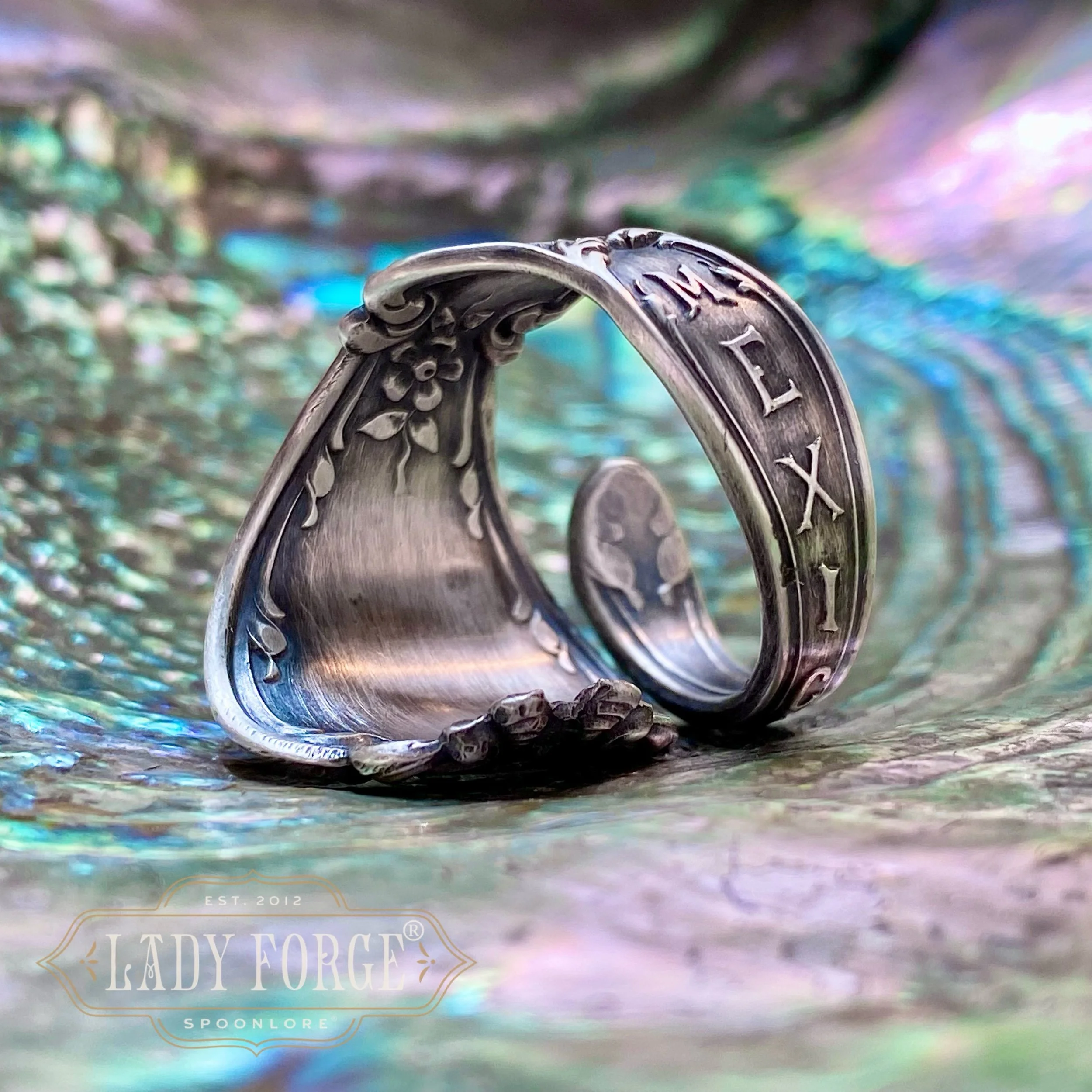 This sterling spoon ring was made from the Mexico pattern designed by the Baker Manchester Co between 1890-1920