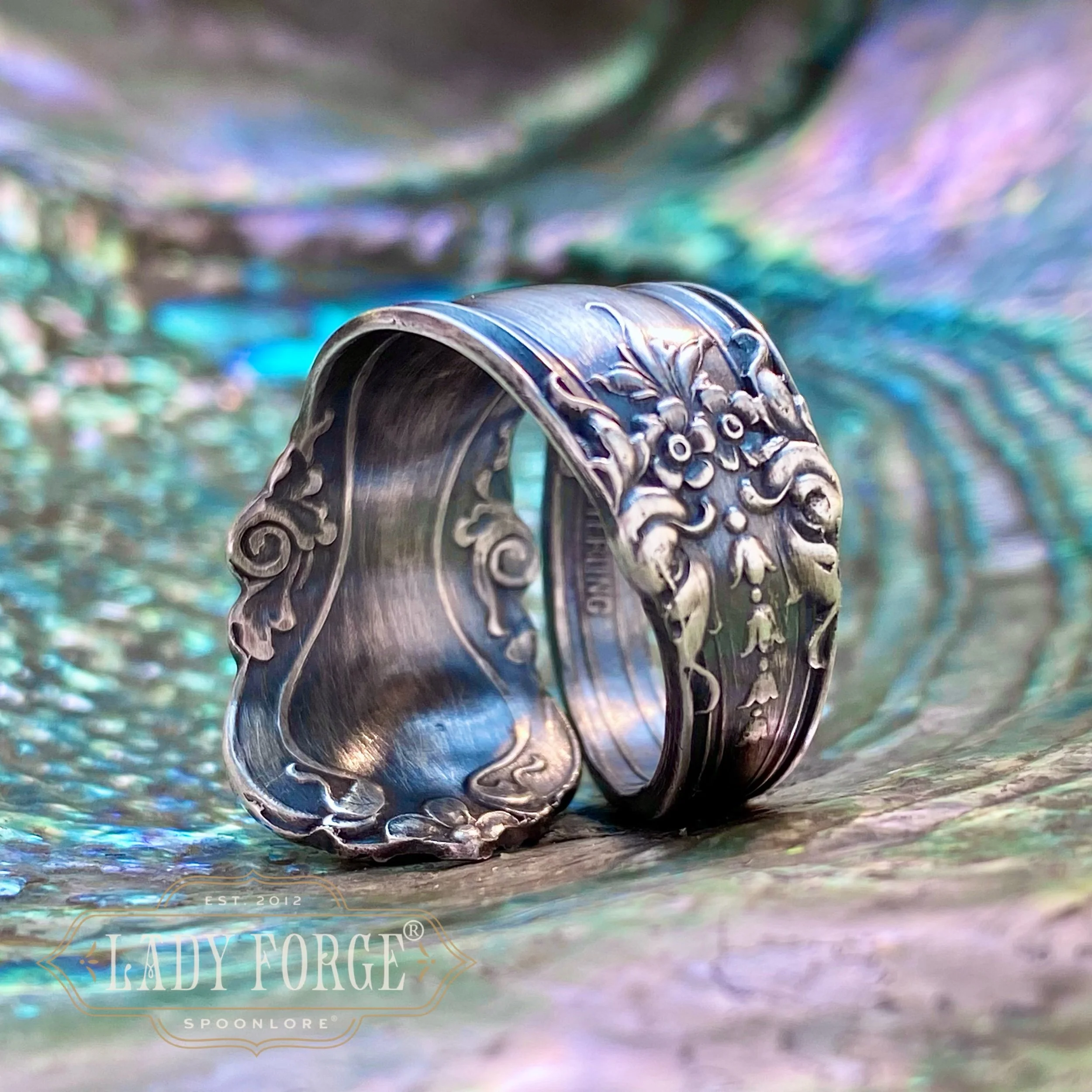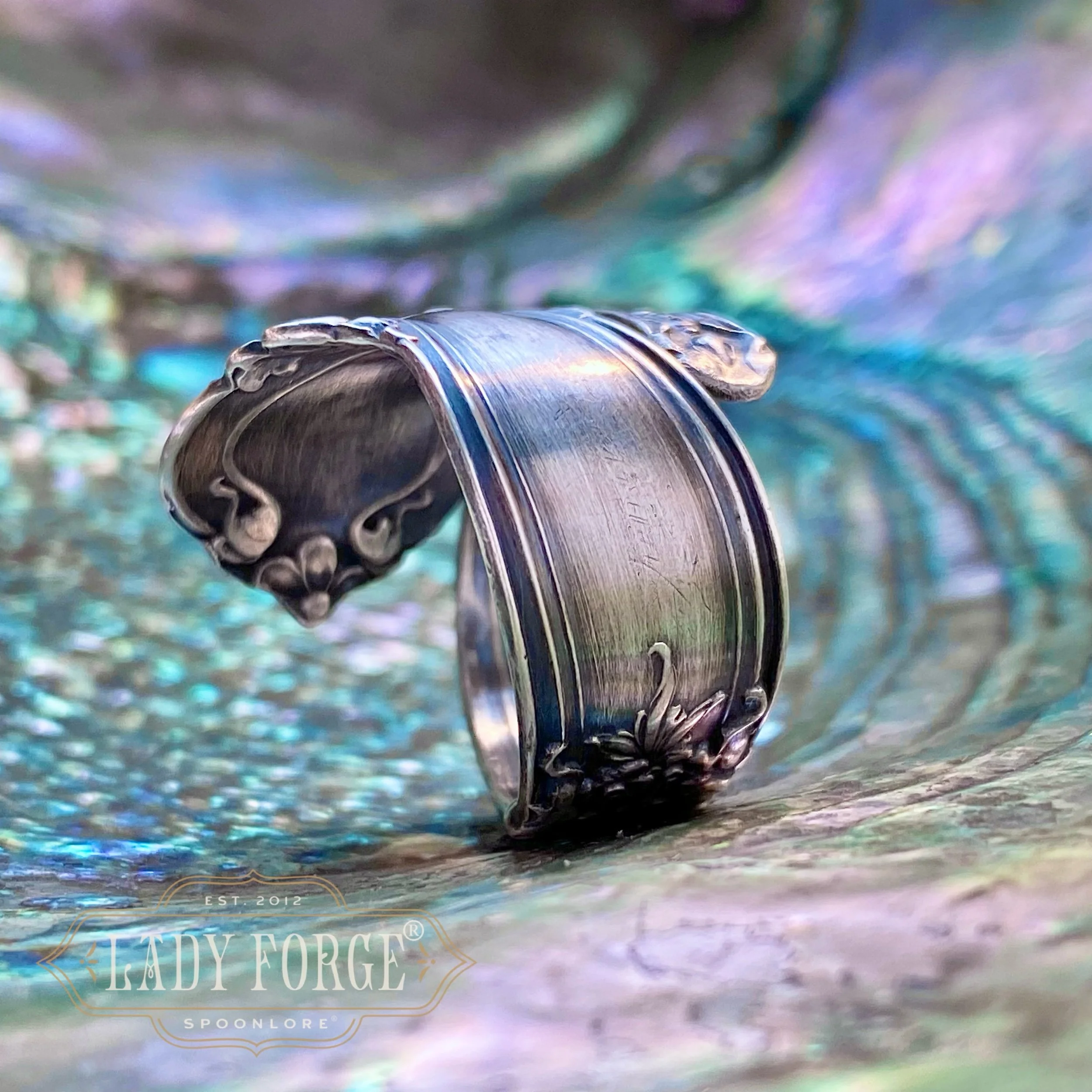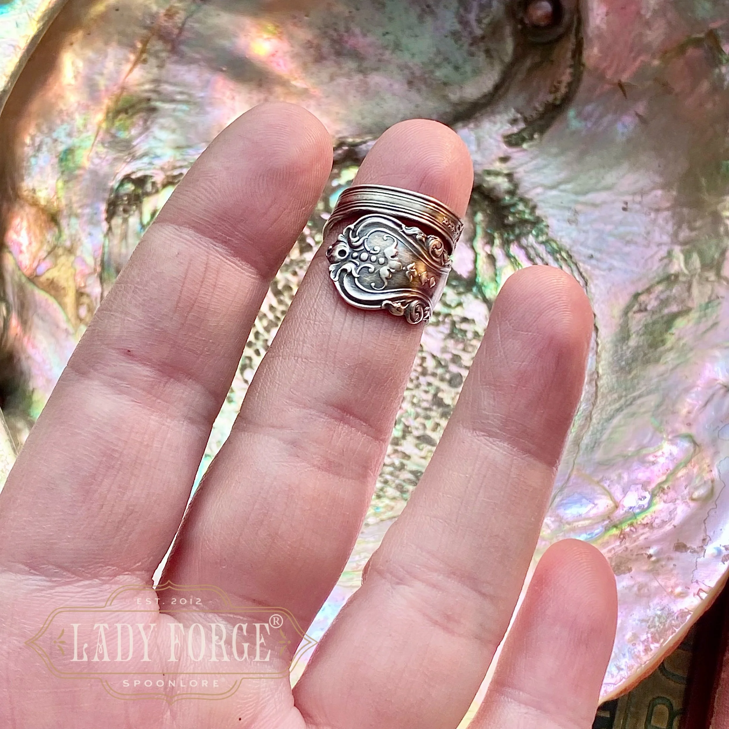 This sterling spoon ring was made from the Emperor pattern designed by the Wendell Co in 1896