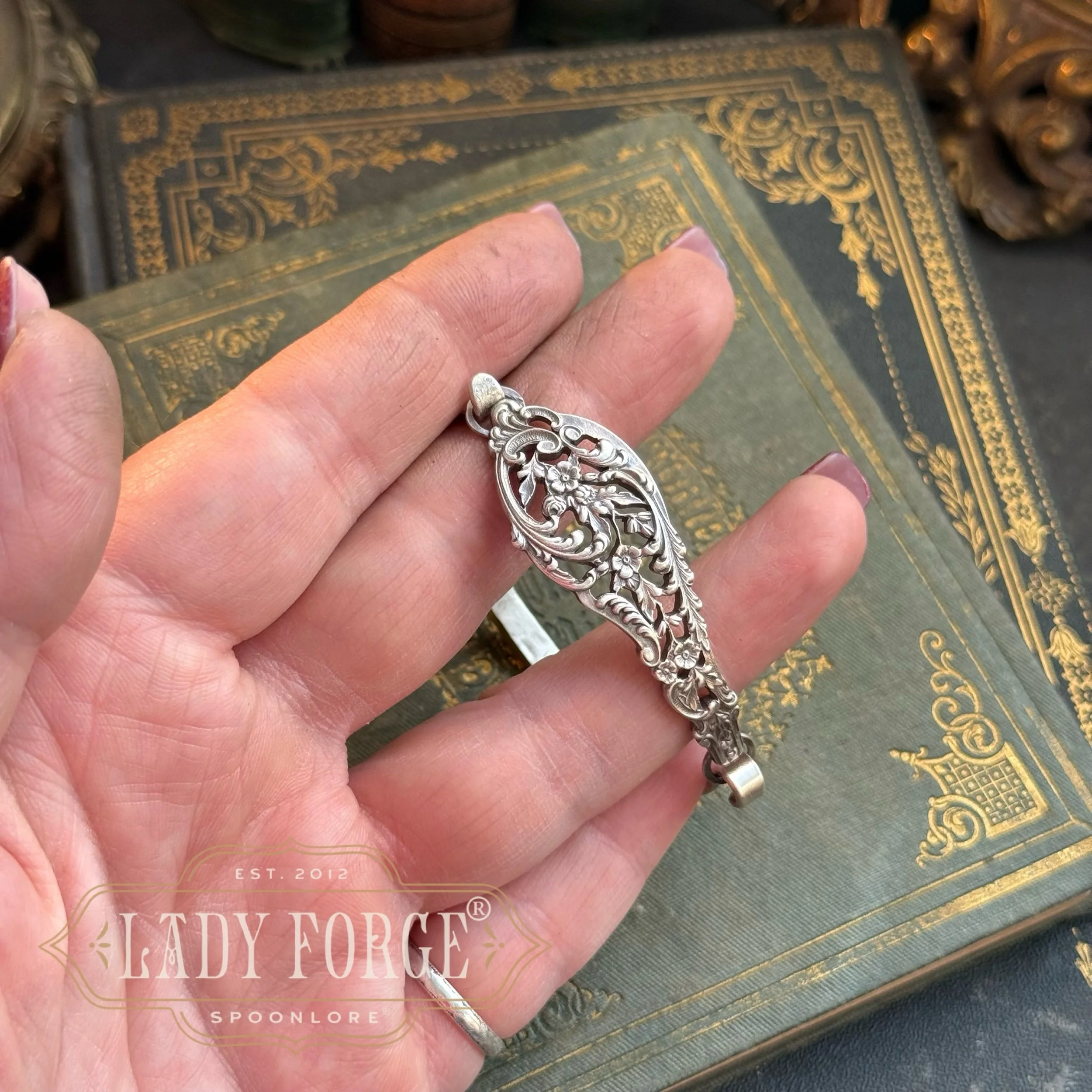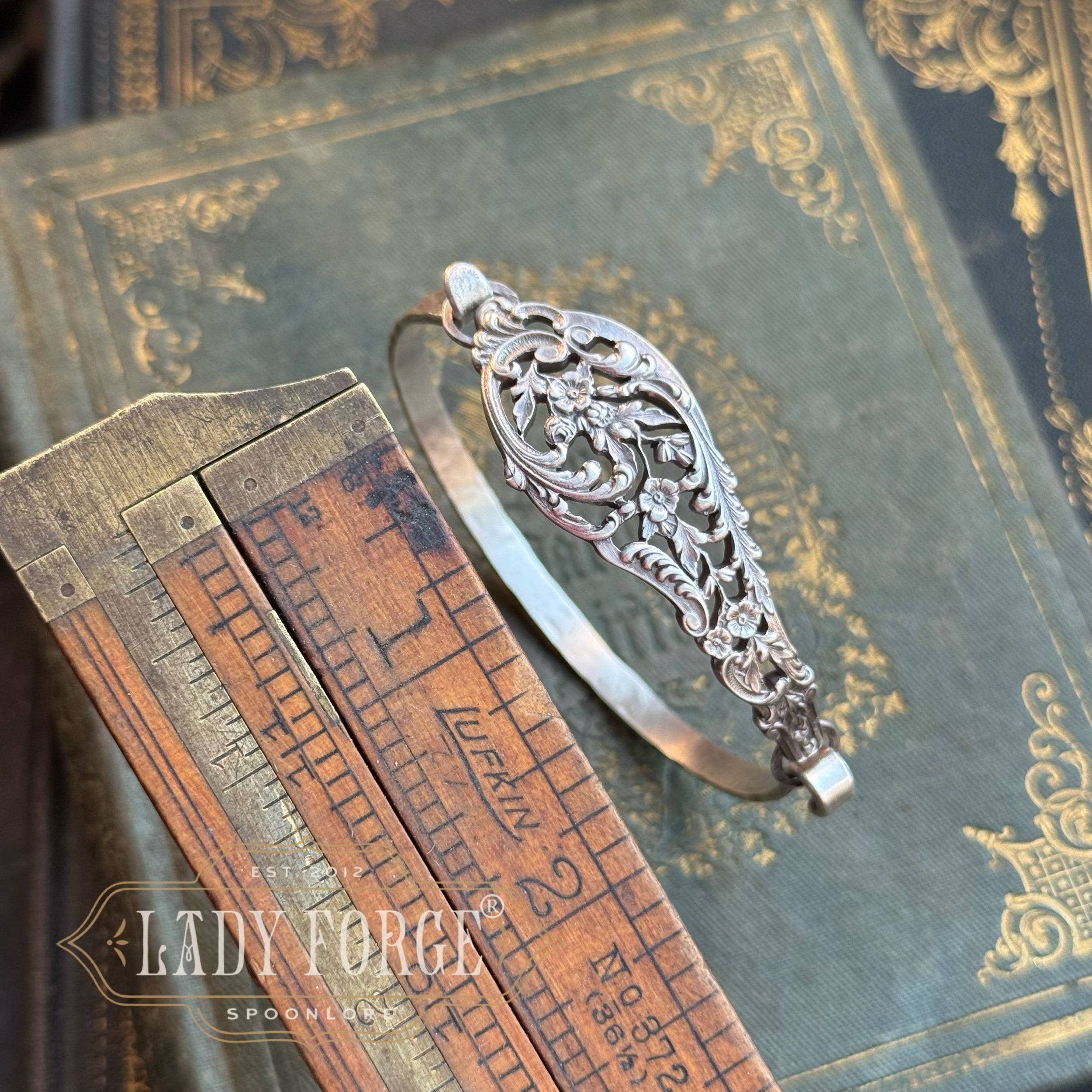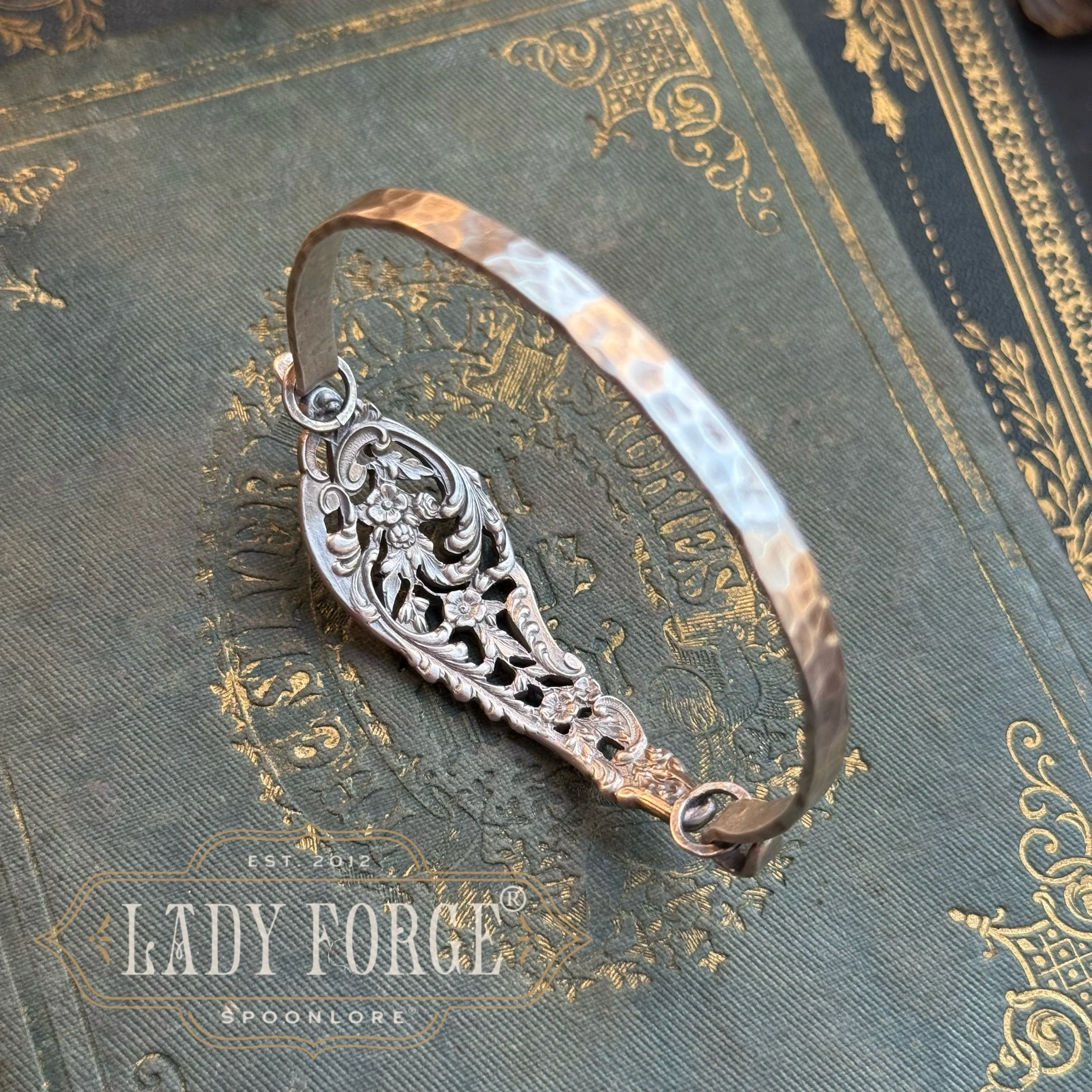 Each Lady Forge Spoon Bangle is hand formed using the portion of the spoon handle or spoon bowl with the most design, and is paired with a hand-fabricated sterling silver band that forms the underside of the bracelet which opens and closes on one side. Therefore, the bracelet doesn’t feel too heavy or bulky, and should not rotate on the hand if correct wrist measurements are given (let me know in the order notes)