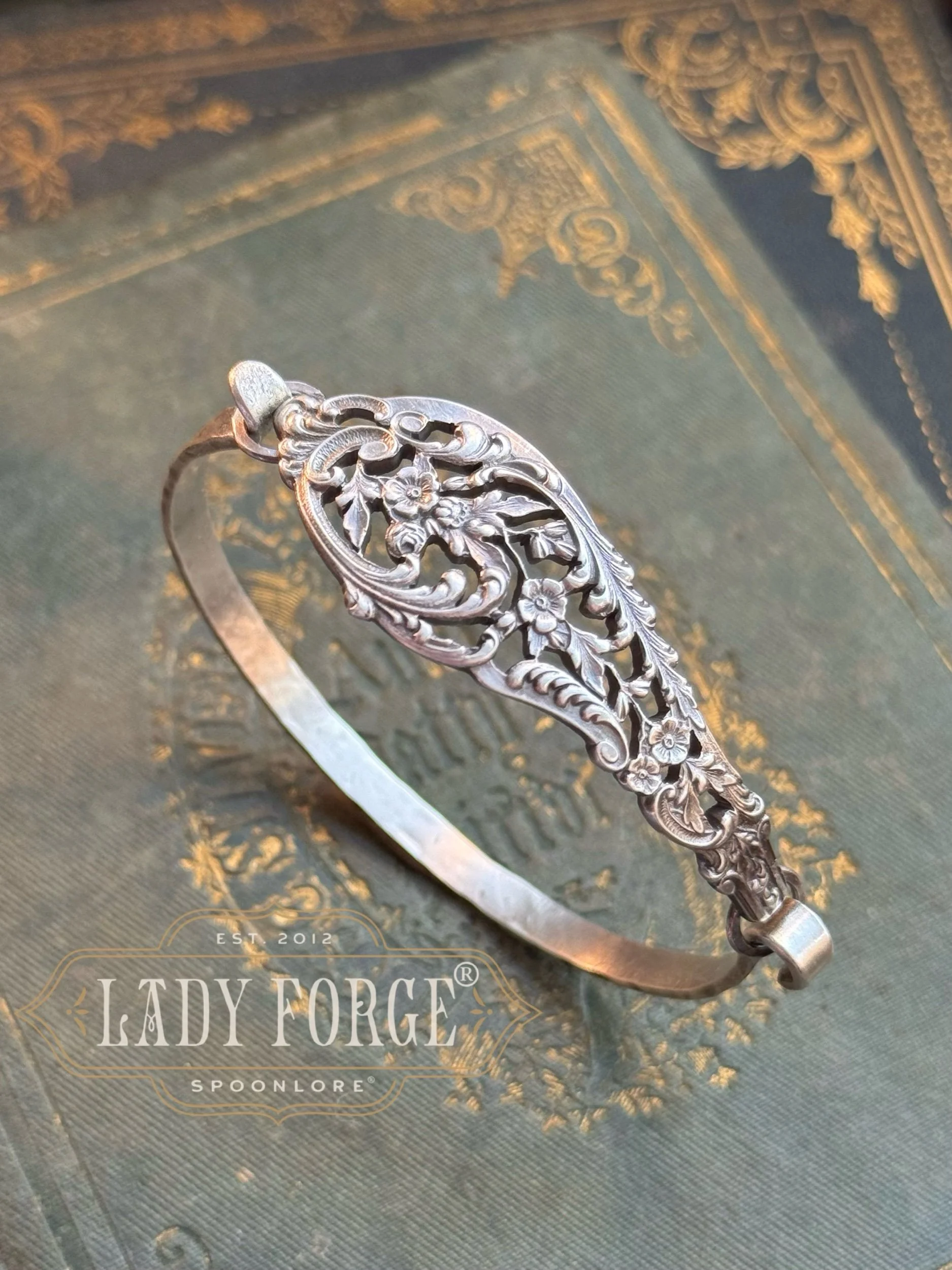 This sterling spoon bangle was made from the Florentine Lace pattern designed by the Reed and Barton company in 1951