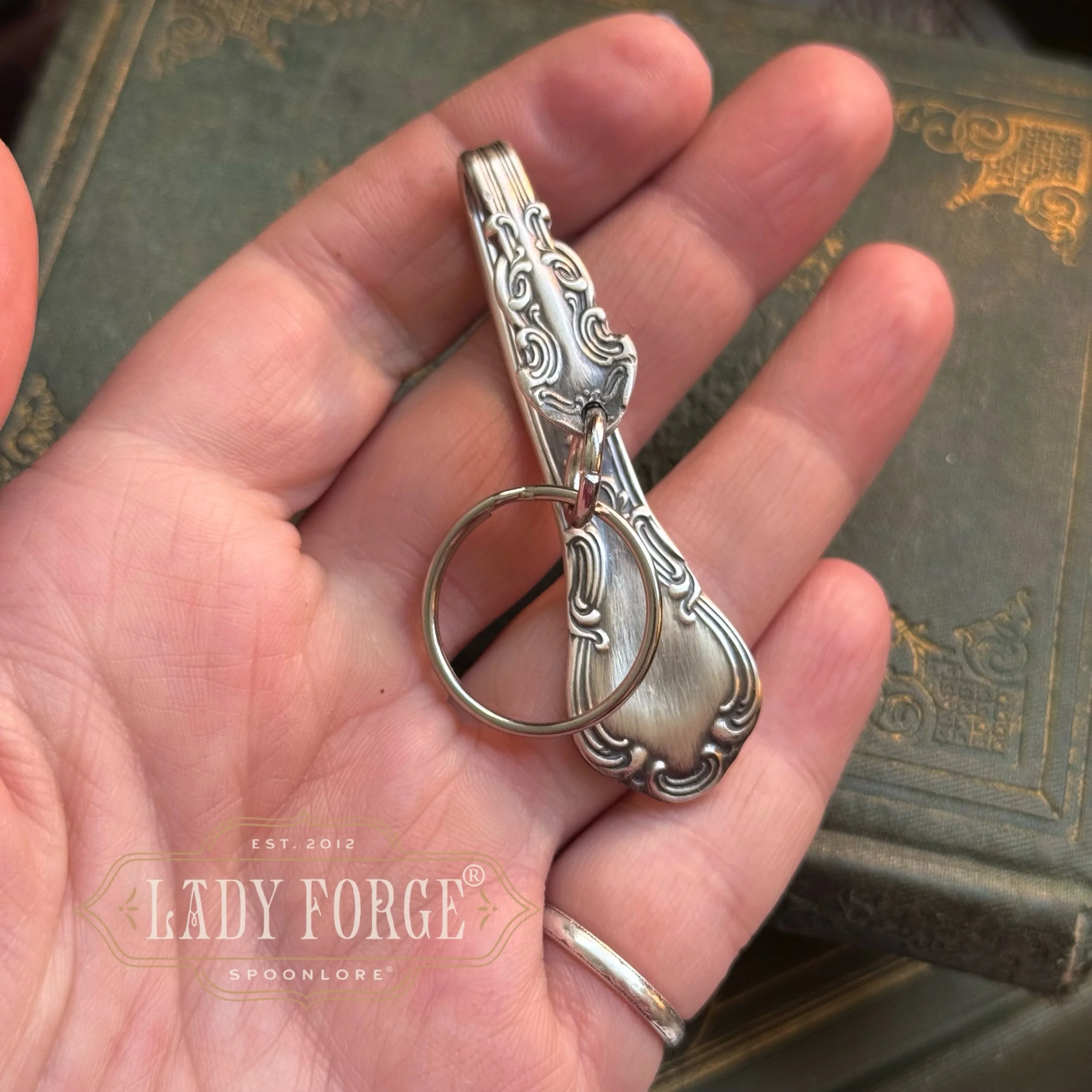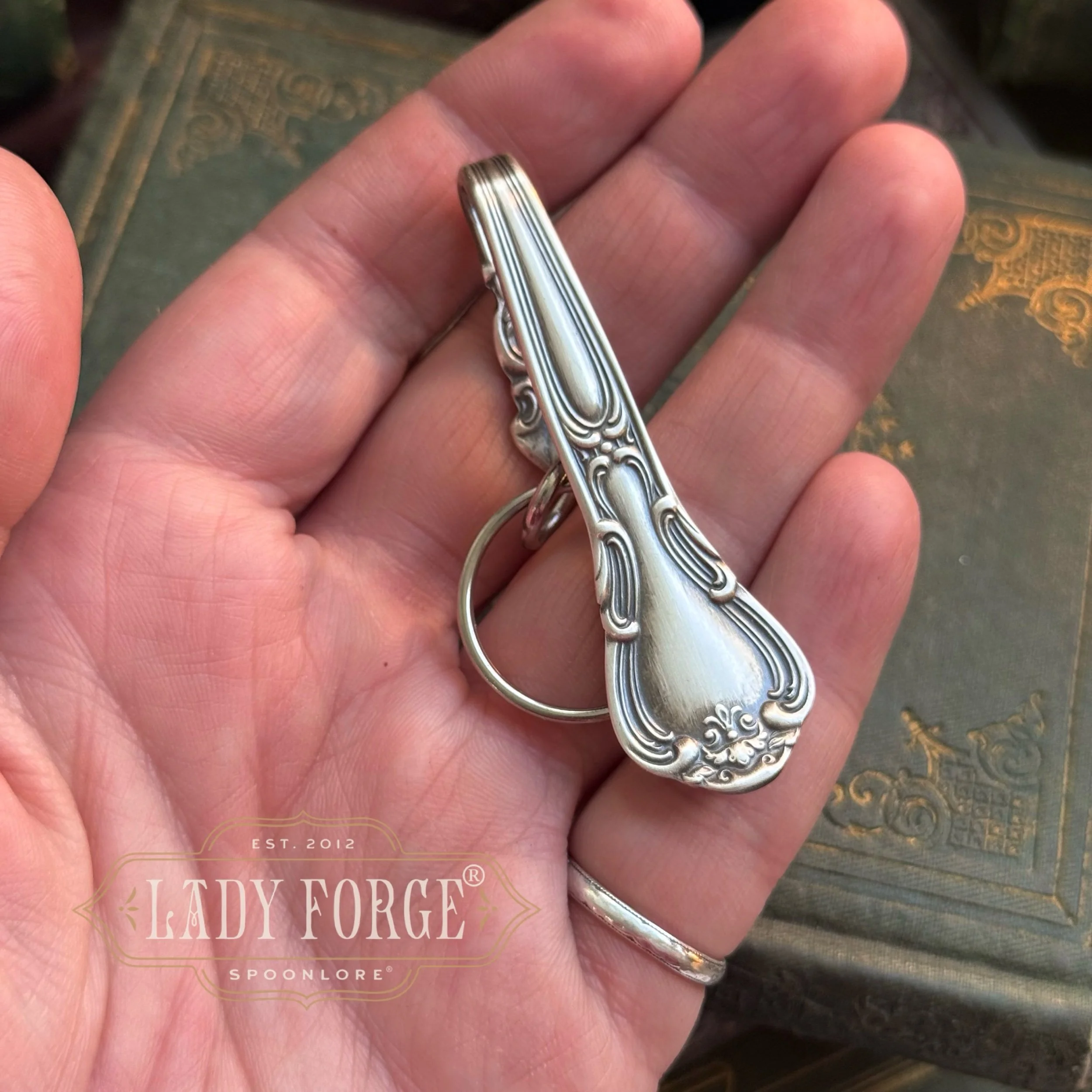 Made from a substantial teaspoon, this gorgeous purse hook is strong and has a nice weight to it. Paired with a key ring to hold all your keys safely on the inside of your purse, while adding a beautiful embellishment to the outside of your purse.