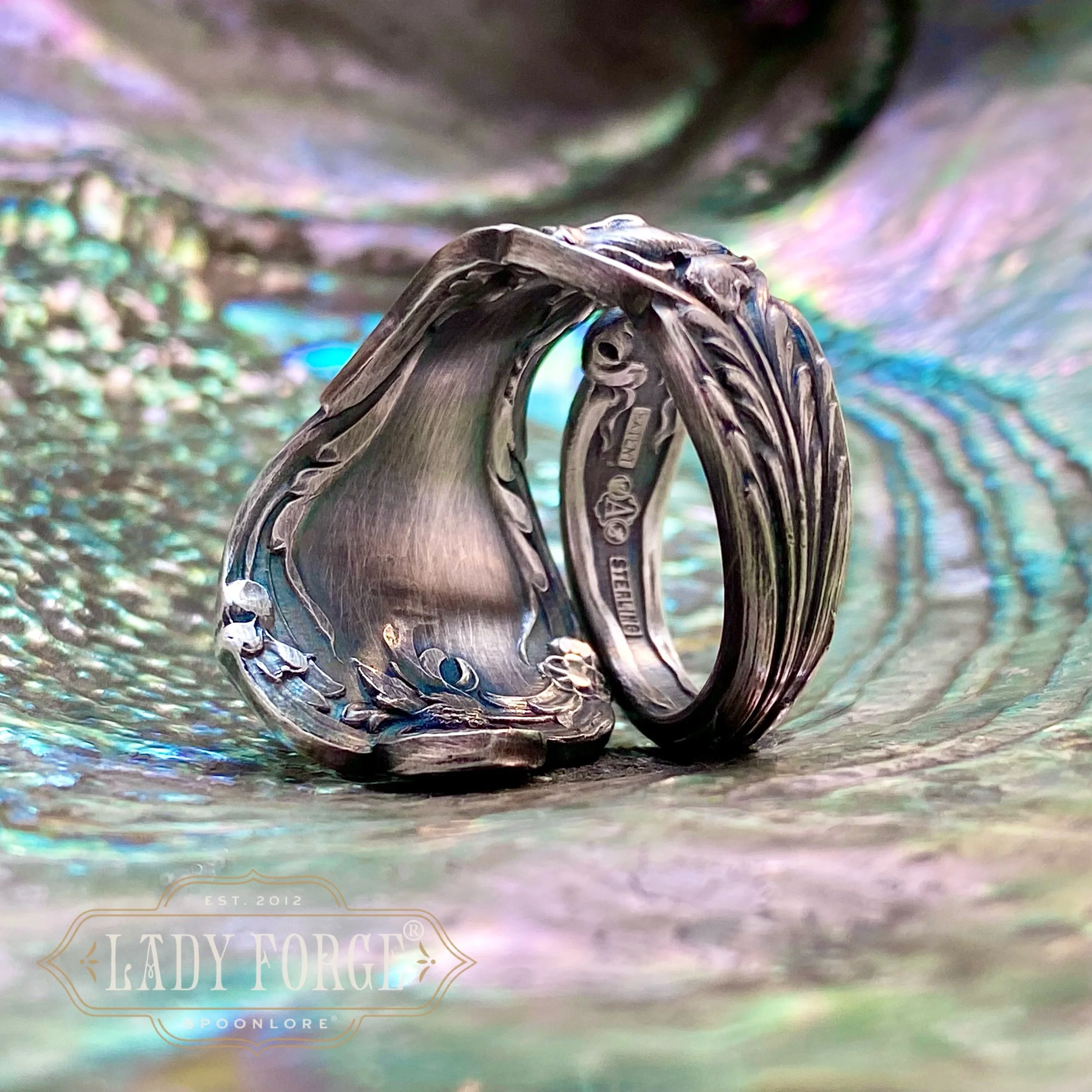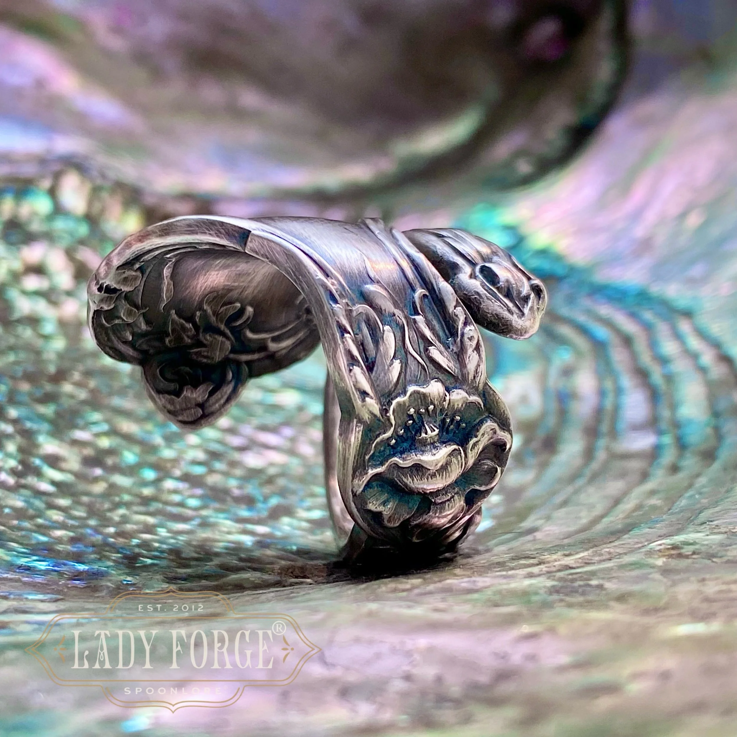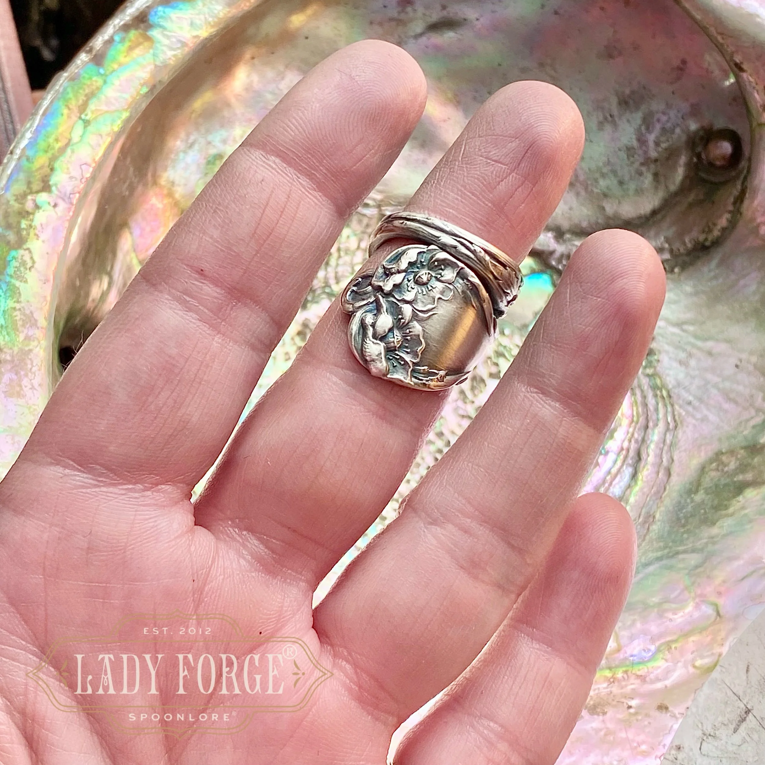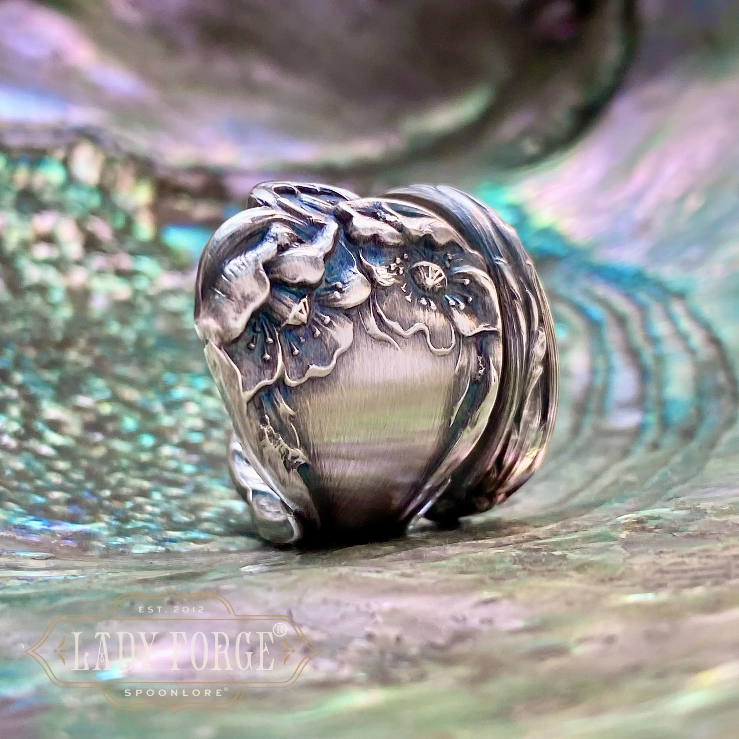 This sterling spoon ring was made from the Majestic Poppy pattern designed by the Alvin Corp in 1900