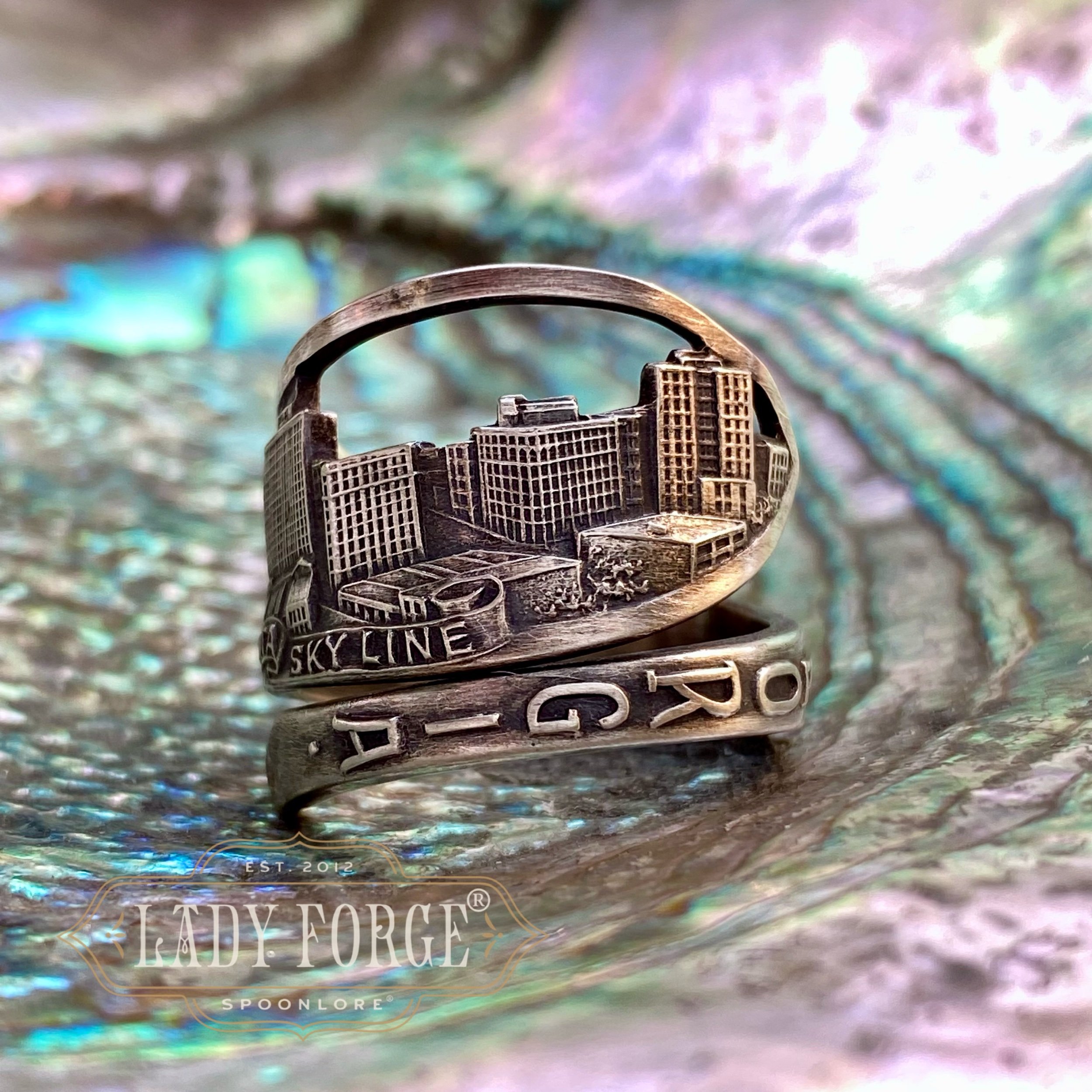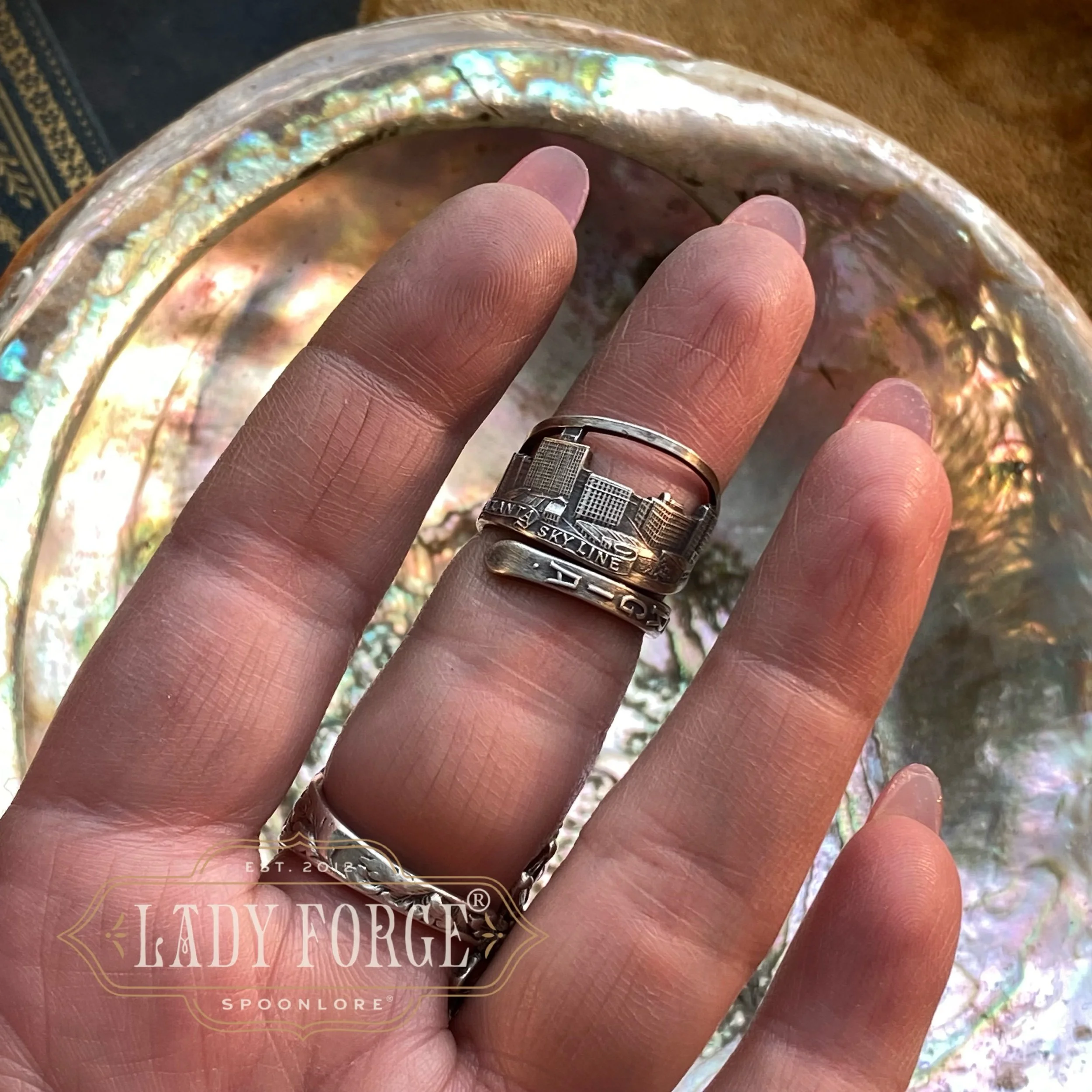 This sterling spoon ring was made from the Georgia pattern designed by the Chas M Robbin’s Co. between 1890-1920