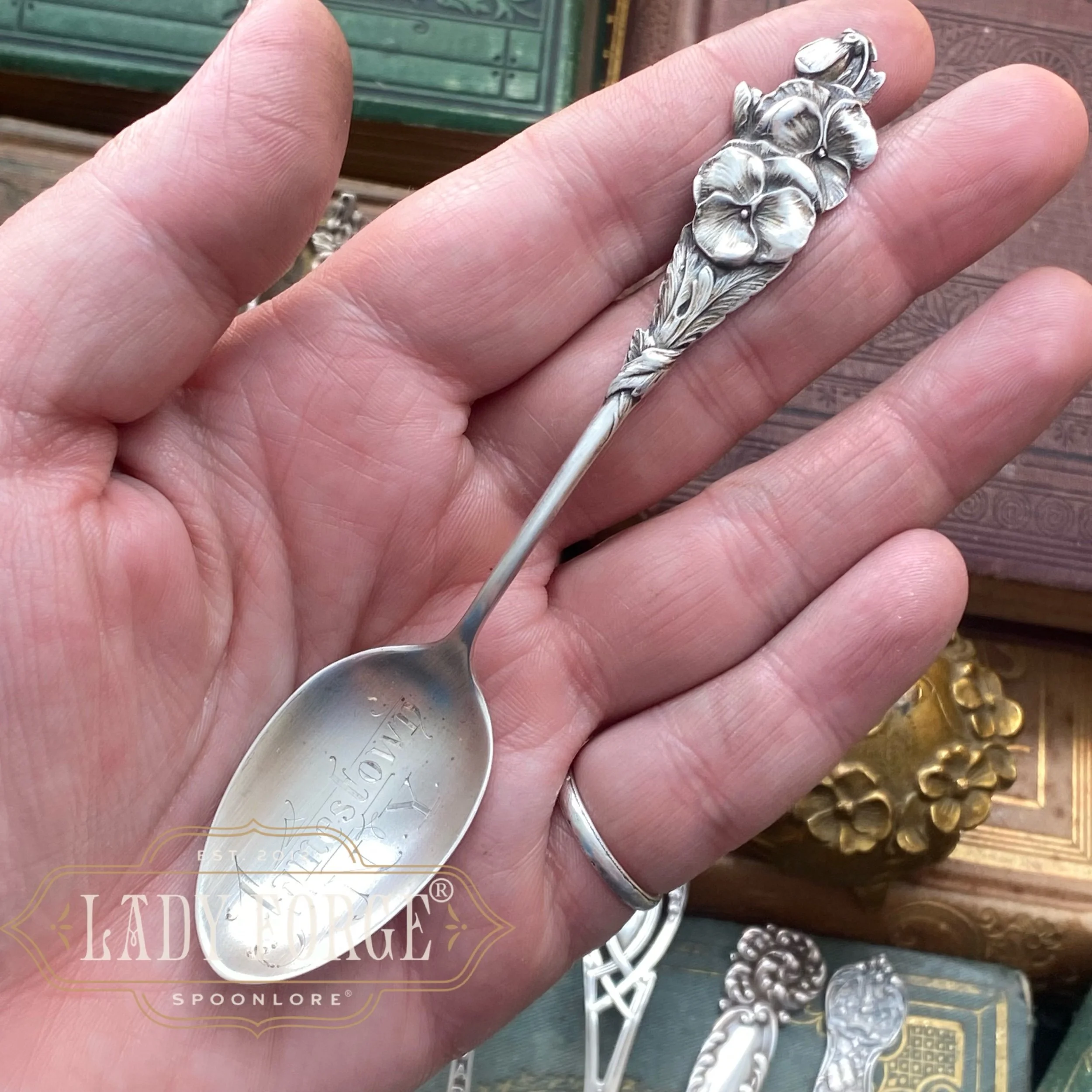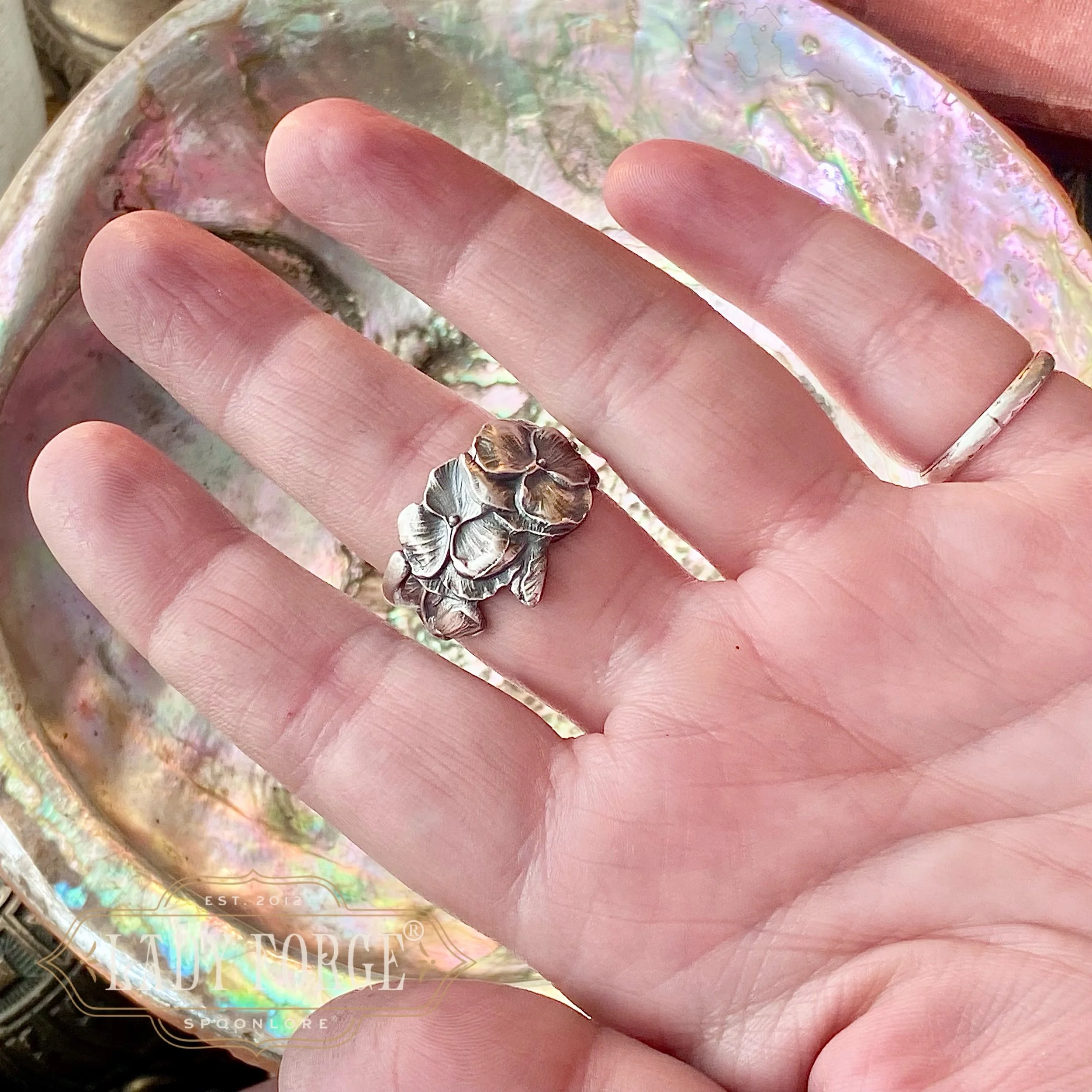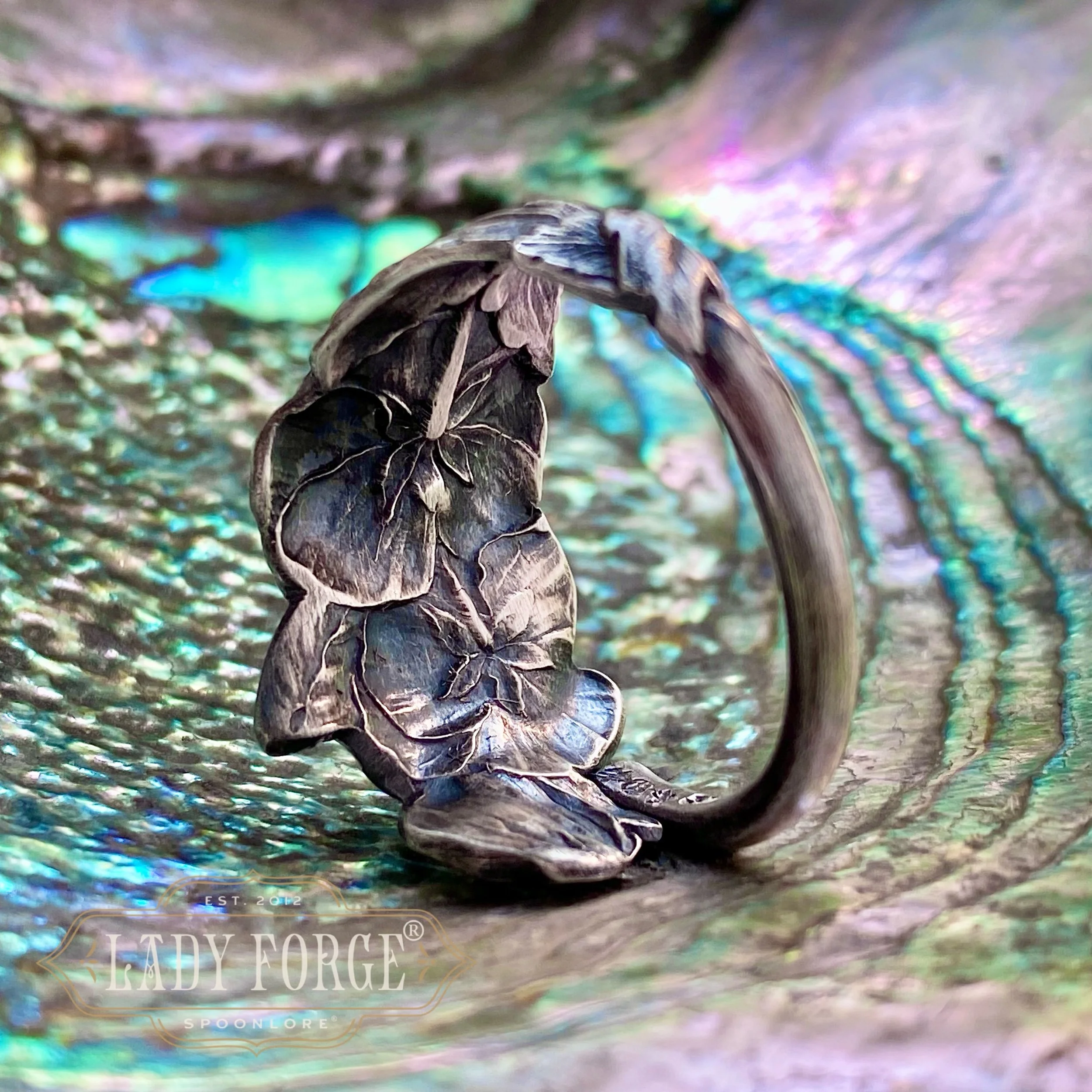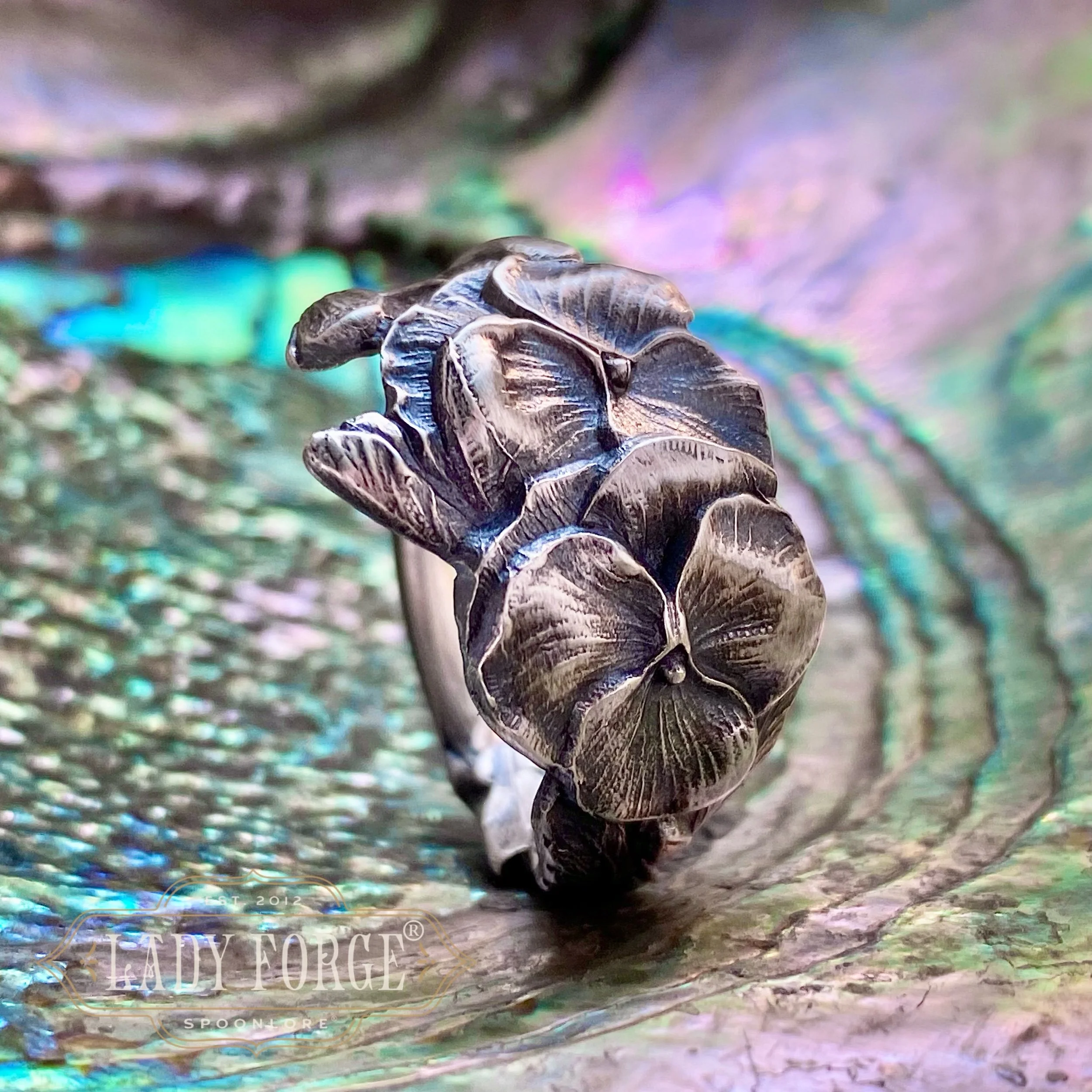This sterling spoon ring was made from the Harlequin Pansy pattern designed by the Reed & Barton Co in the 1950s