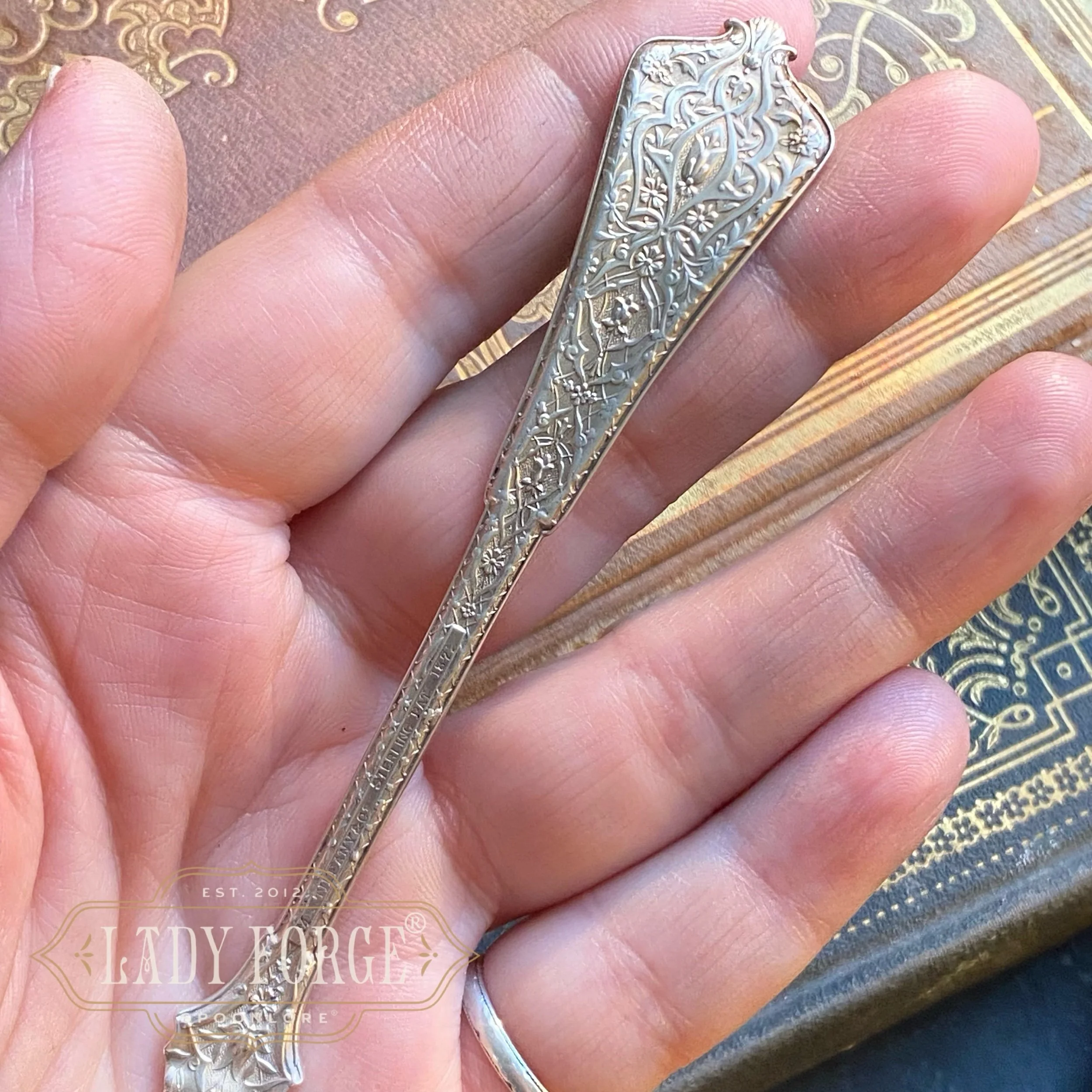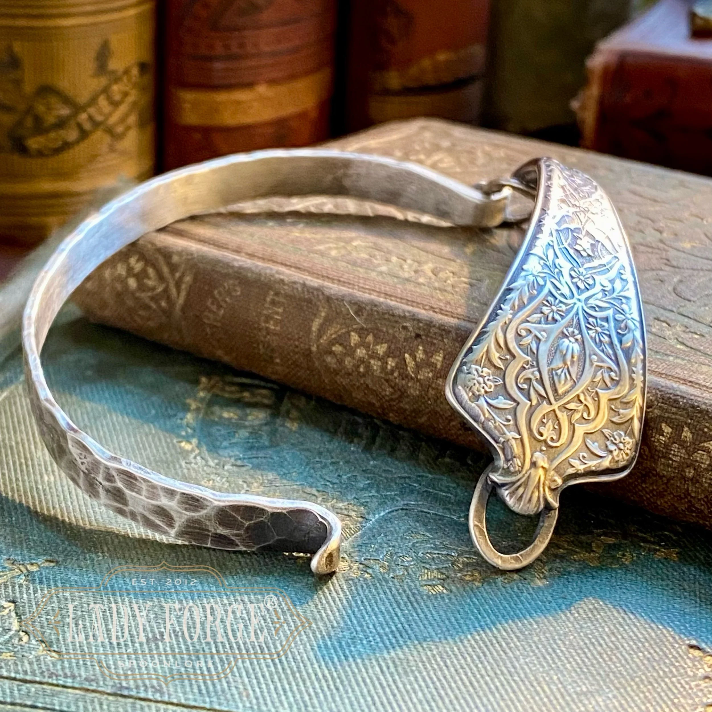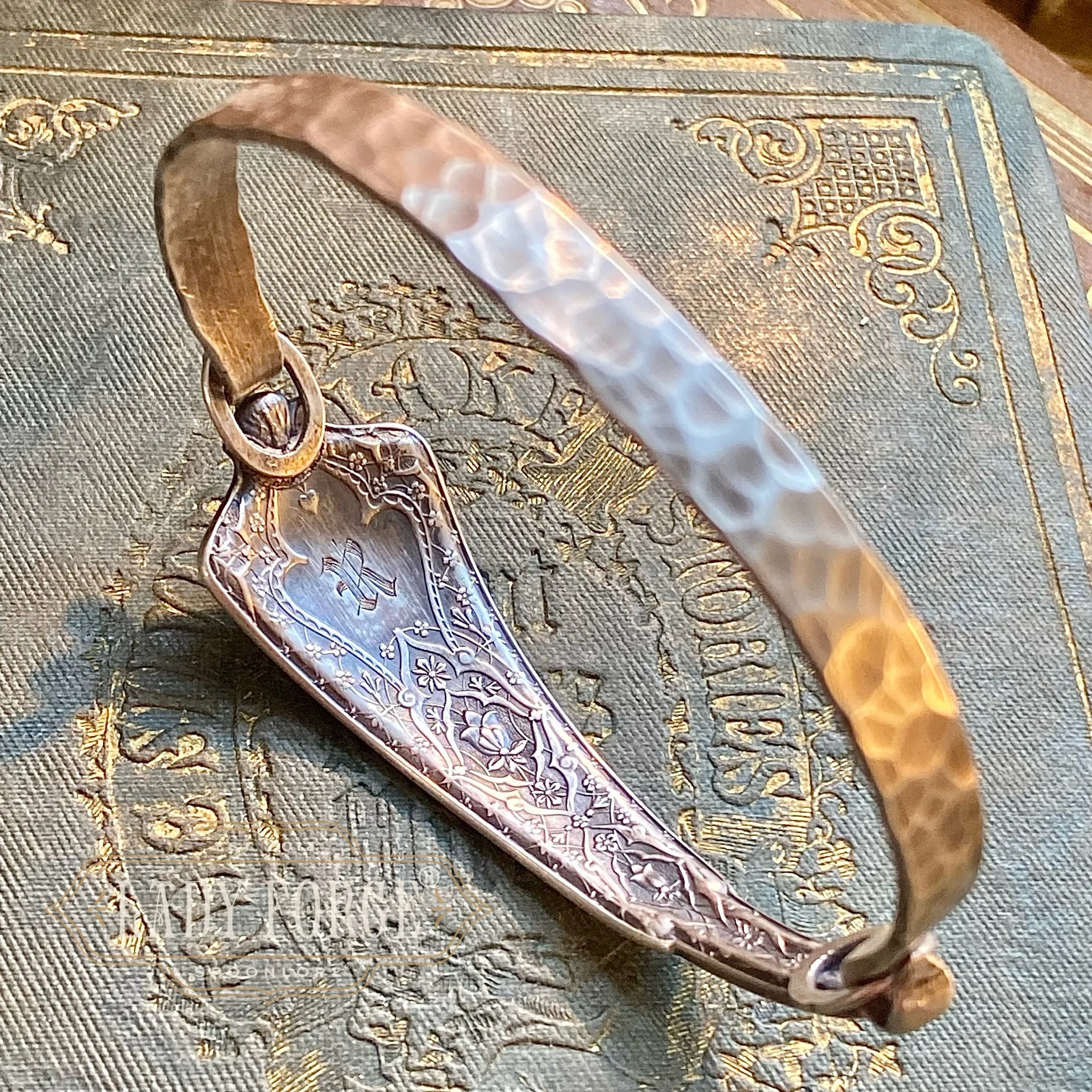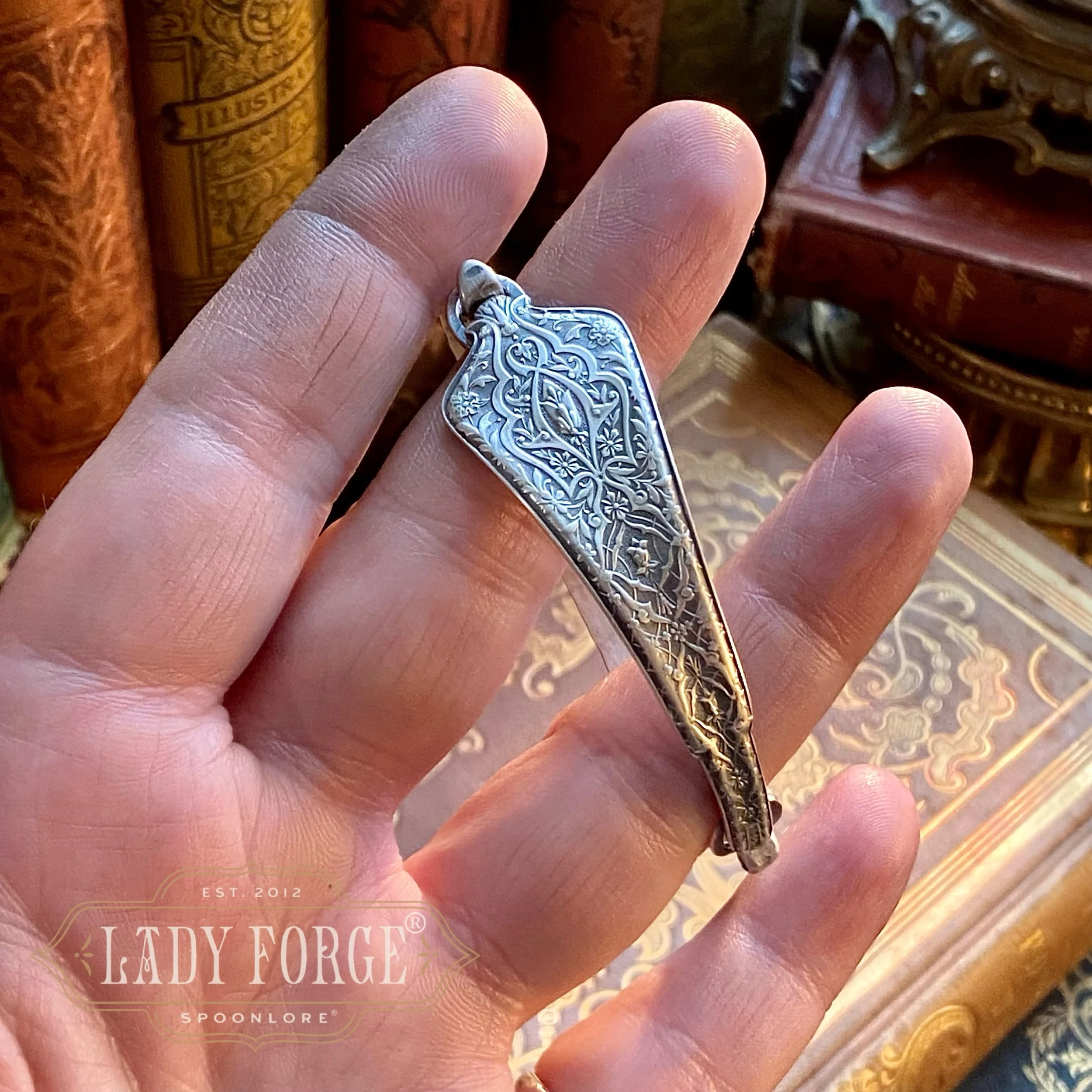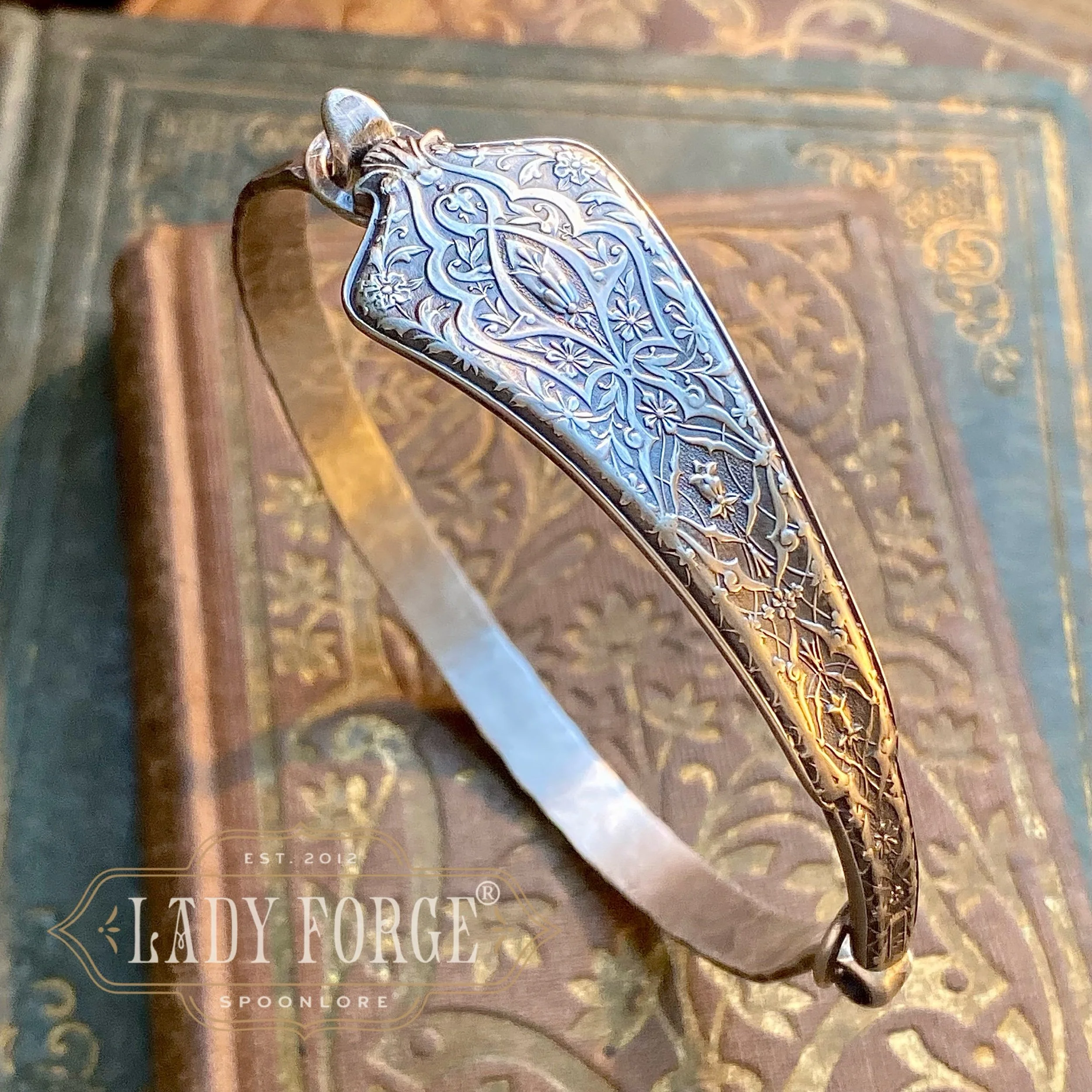 Each Lady Forge Spoon Bangle is hand formed using the portion of the spoon handle or spoon bowl with the most design, and is paired with a hand-fabricated sterling silver band that forms the underside of the bracelet which opens and closes on one side. Therefore, the bracelet doesn’t feel too heavy or bulky, and should not rotate on the hand if correct wrist measurements are given (let me know in the order notes)