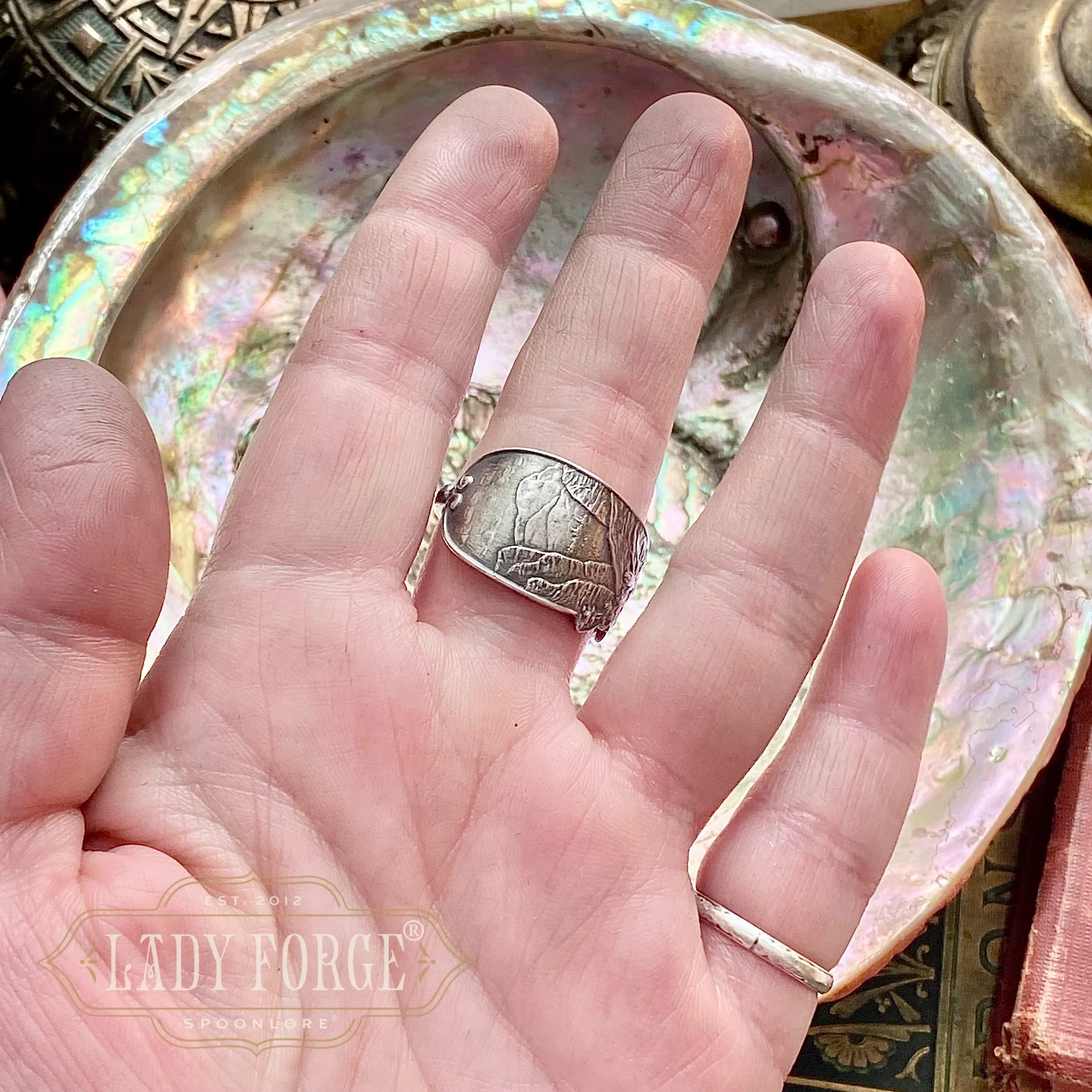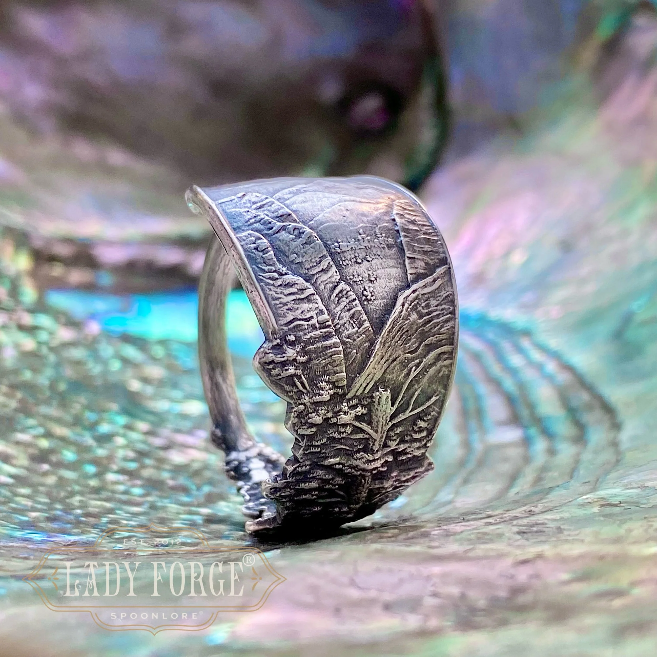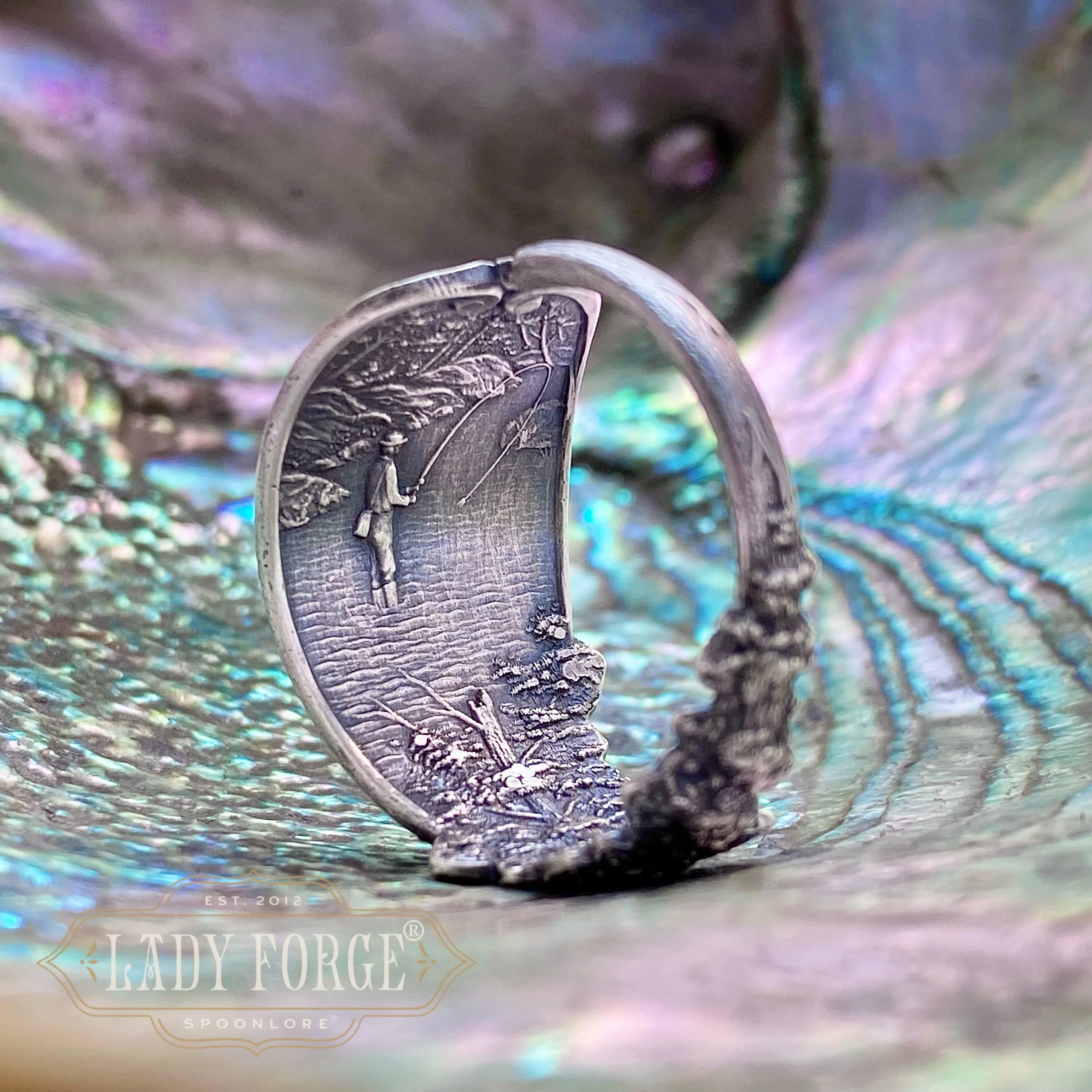 This sterling spoon ring was made from the Mointain Lake Fly fishing pattern designed by an unknown American maker (unmarked) likely between 1900-1940