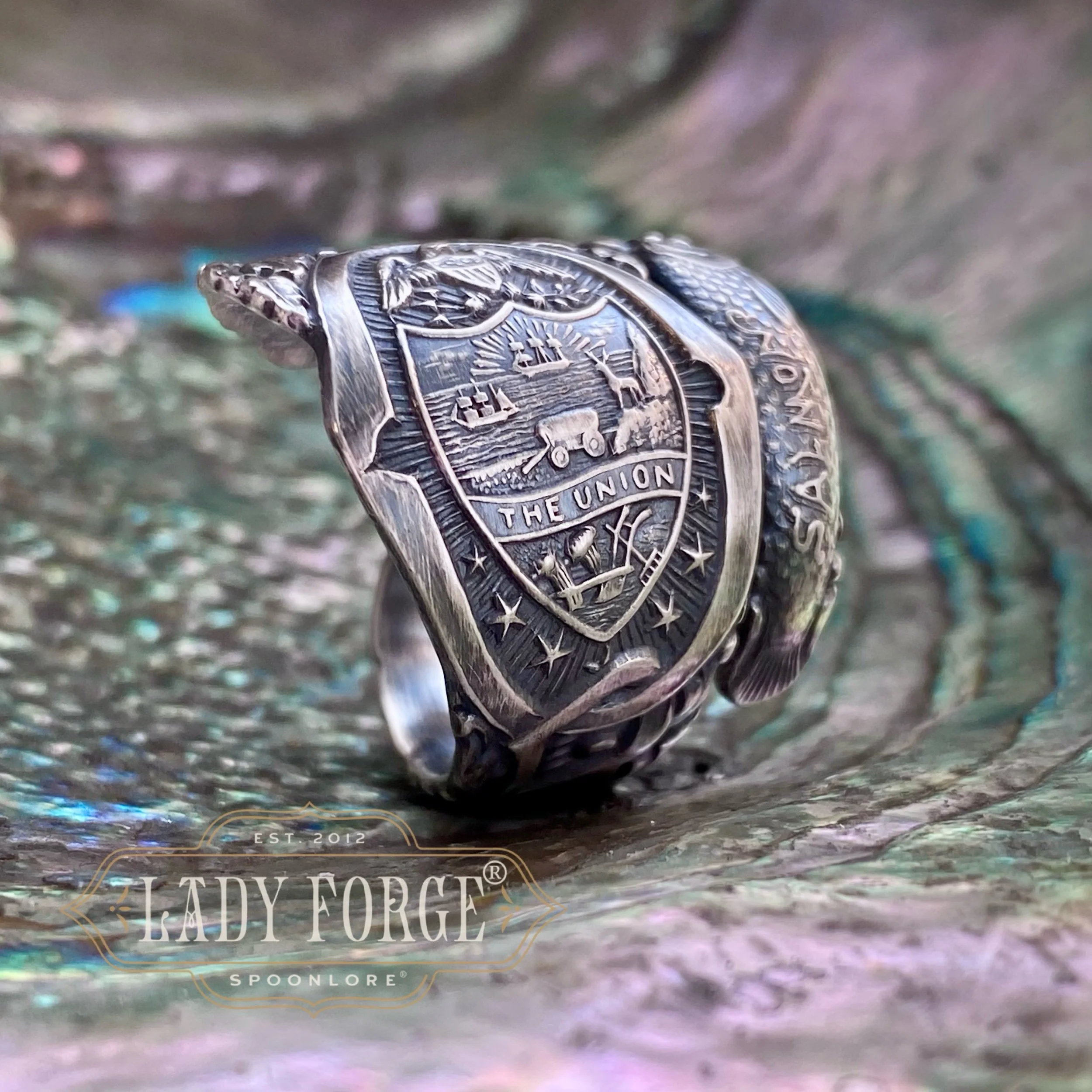 This sterling spoon ring was made from the Orwgon pattern designed by the A. Feldenheimer Co between 1890-1920