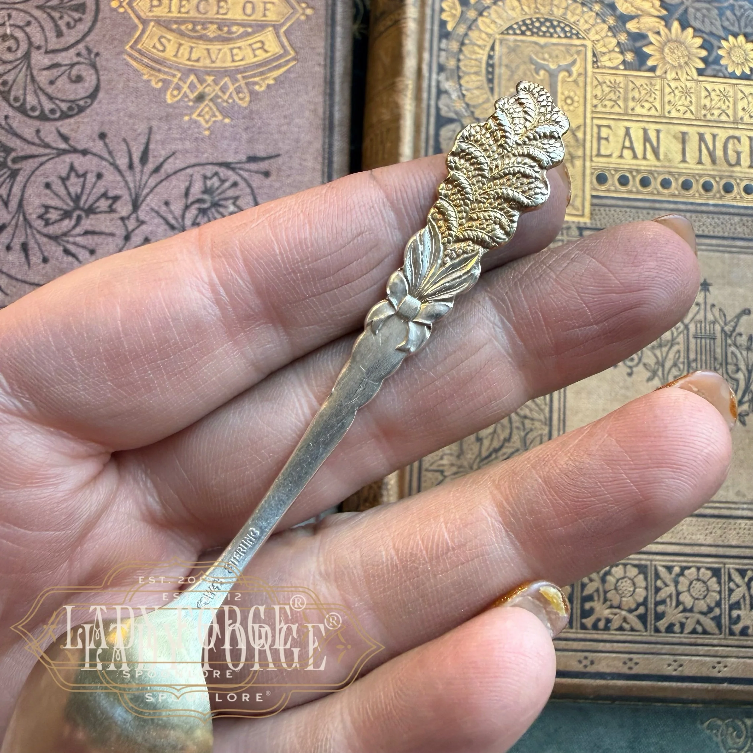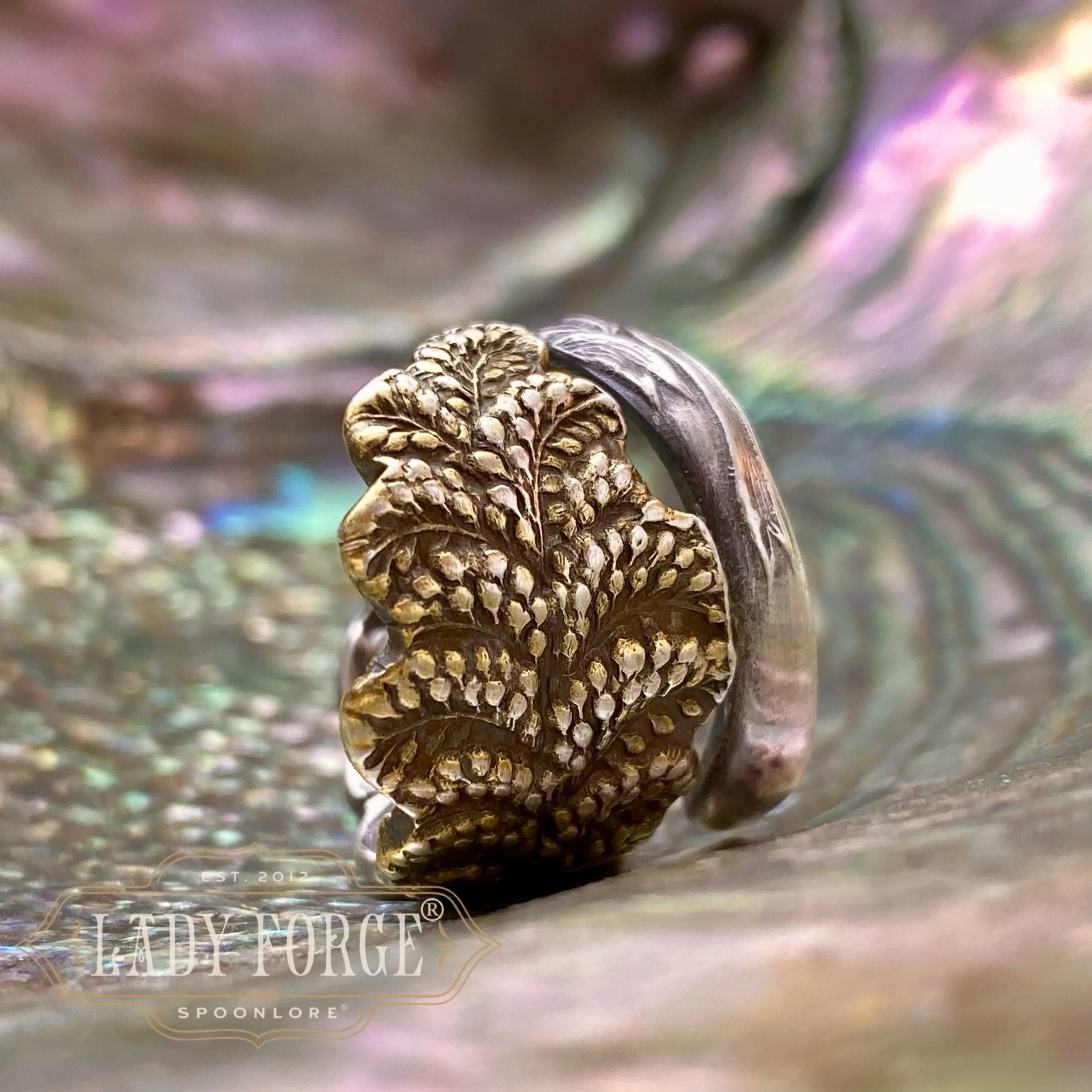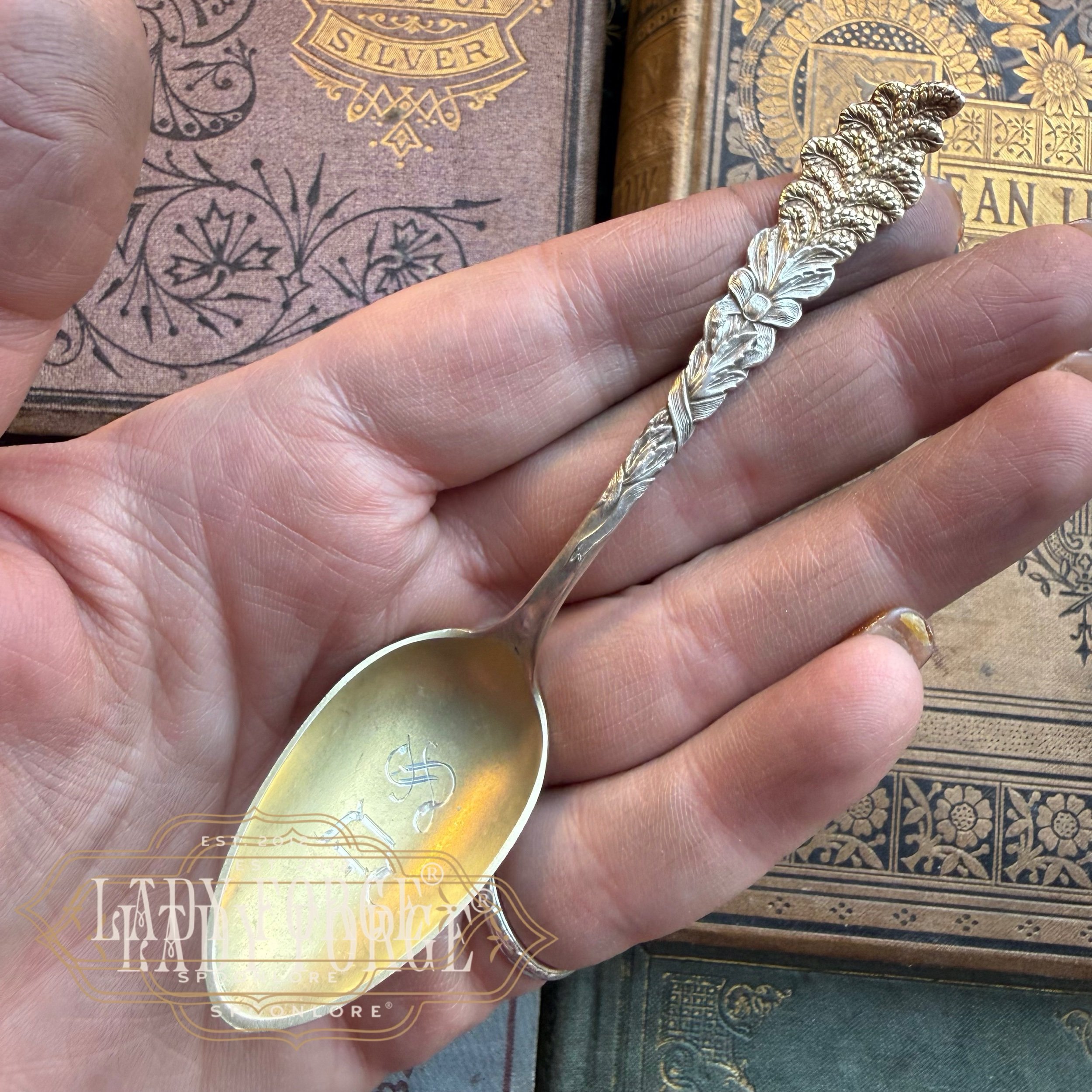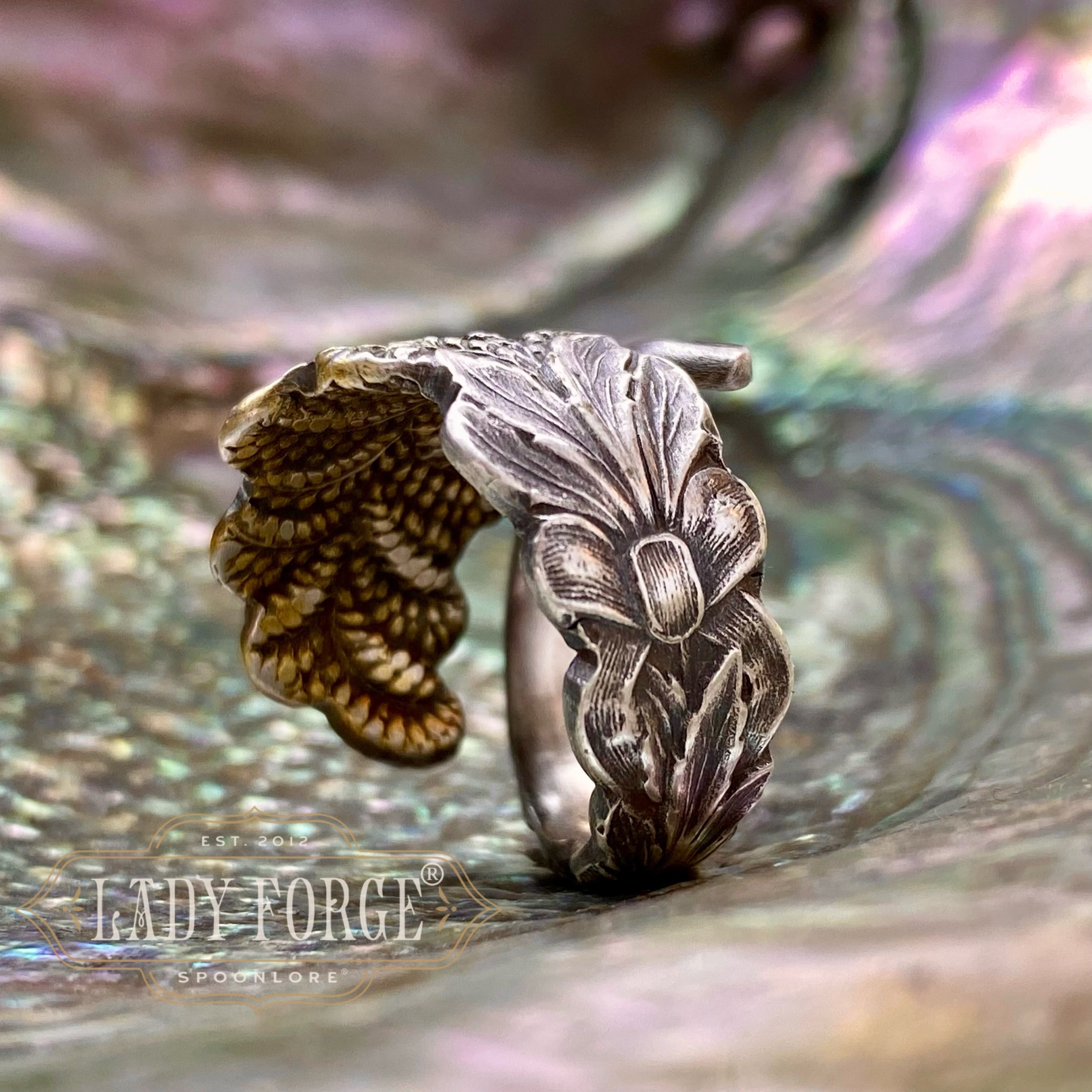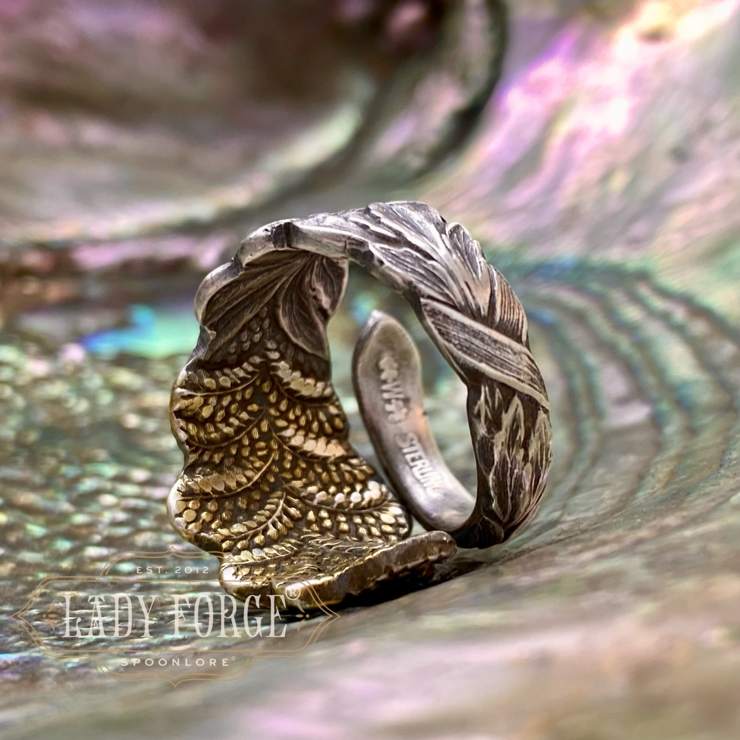 This sterling spoon ring was made from the Goldenrod pattern designed by the Wendell Co. in the 1880s. Sterling silver, with a light dusting of gold on the goldenrod blossoms.