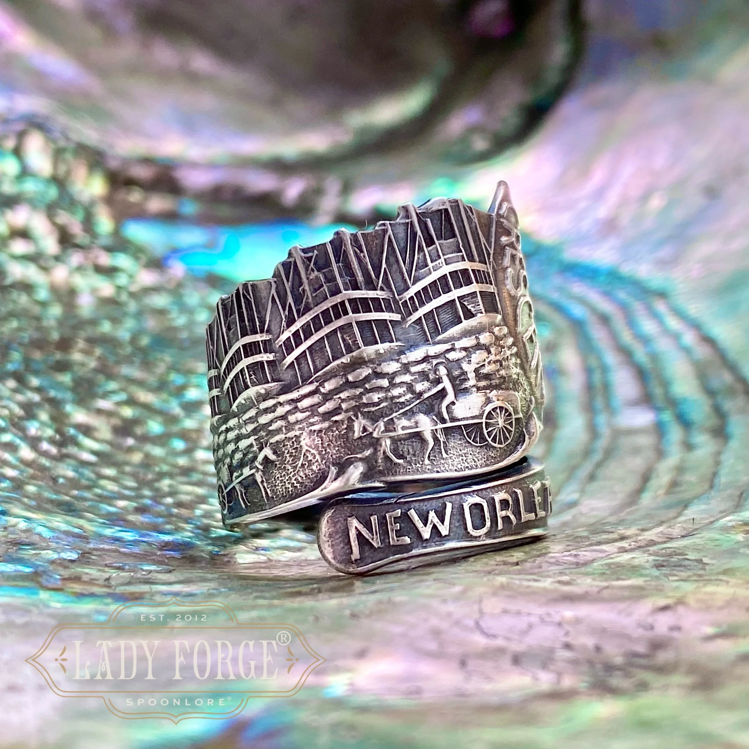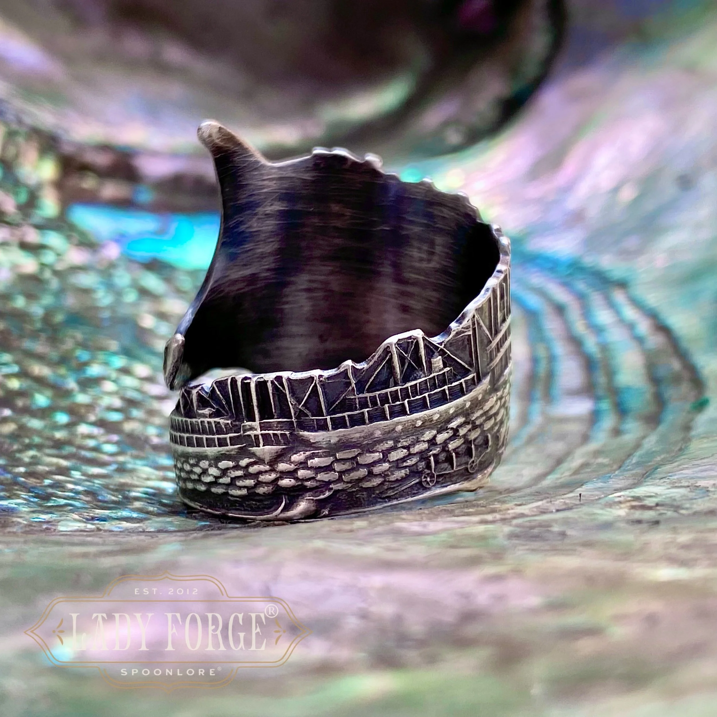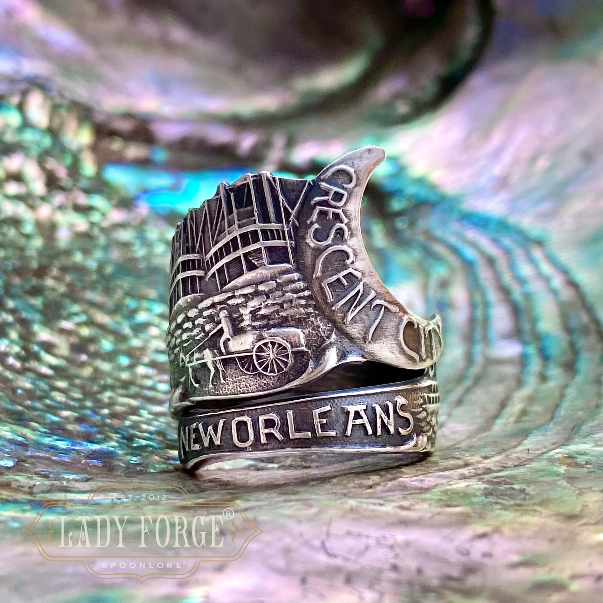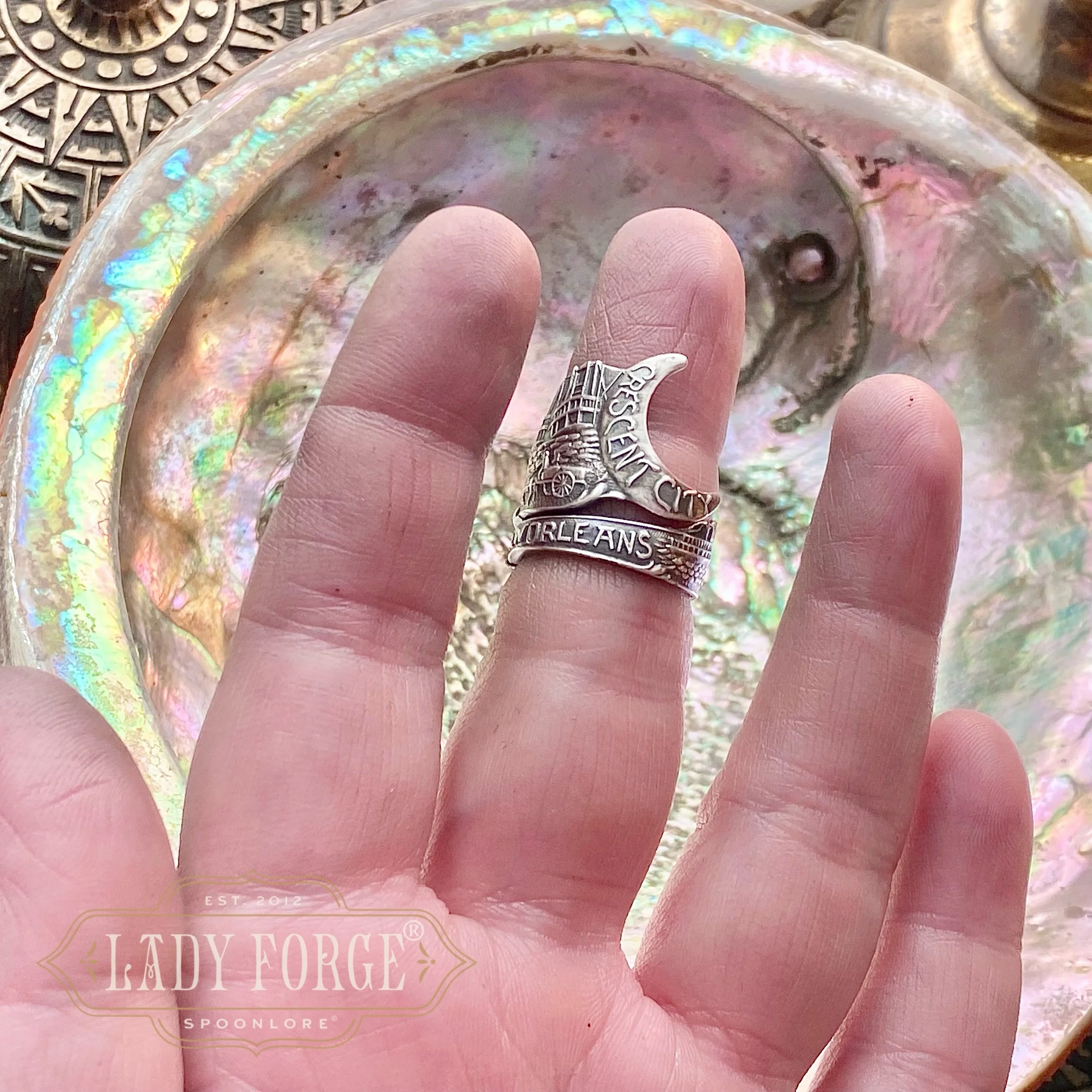 This sterling spoon ring was made from the New Orleans Crescent City pattern designed by the Paye & Baker Co between 1890-1920