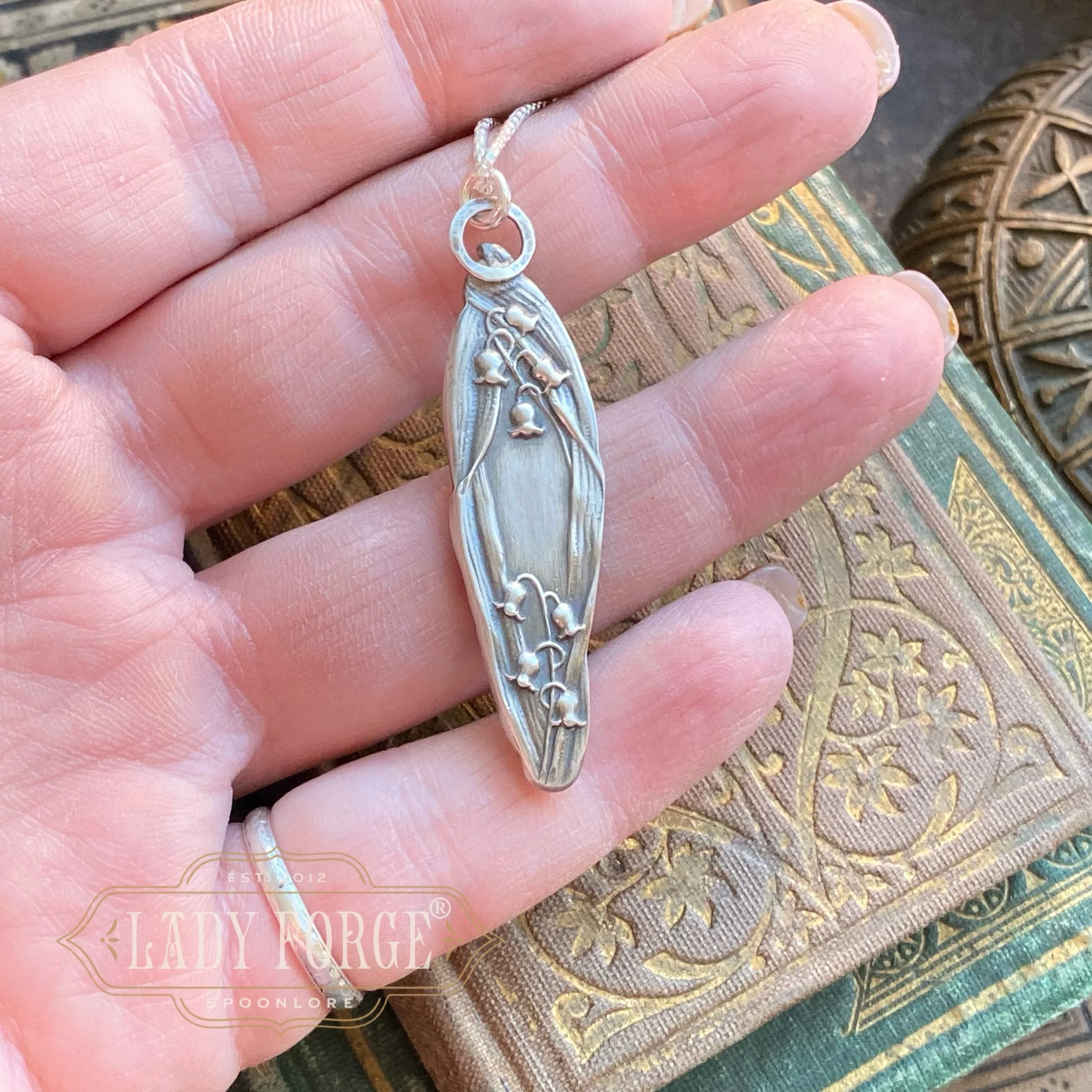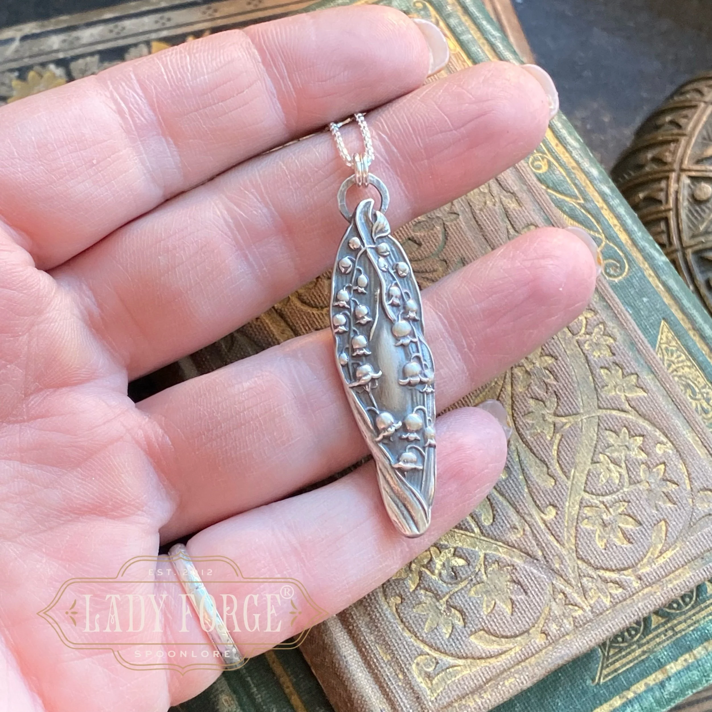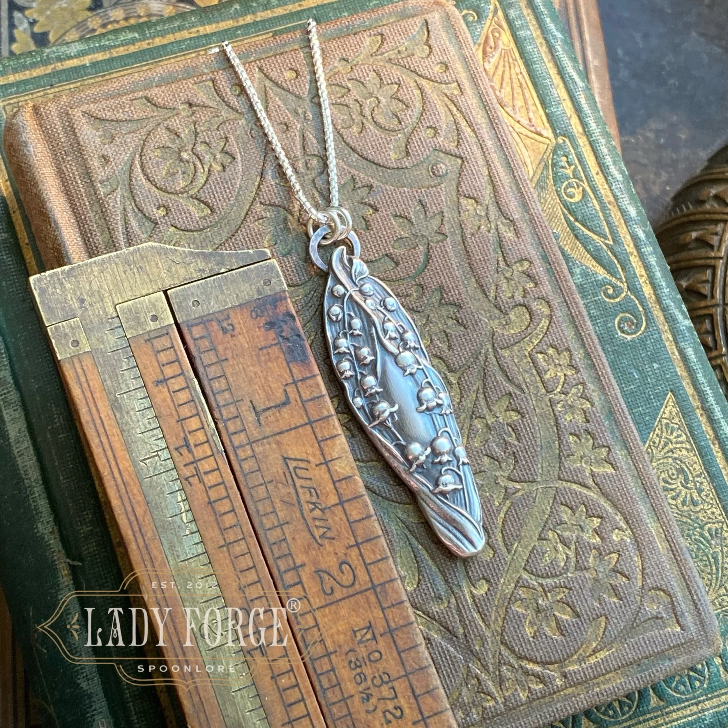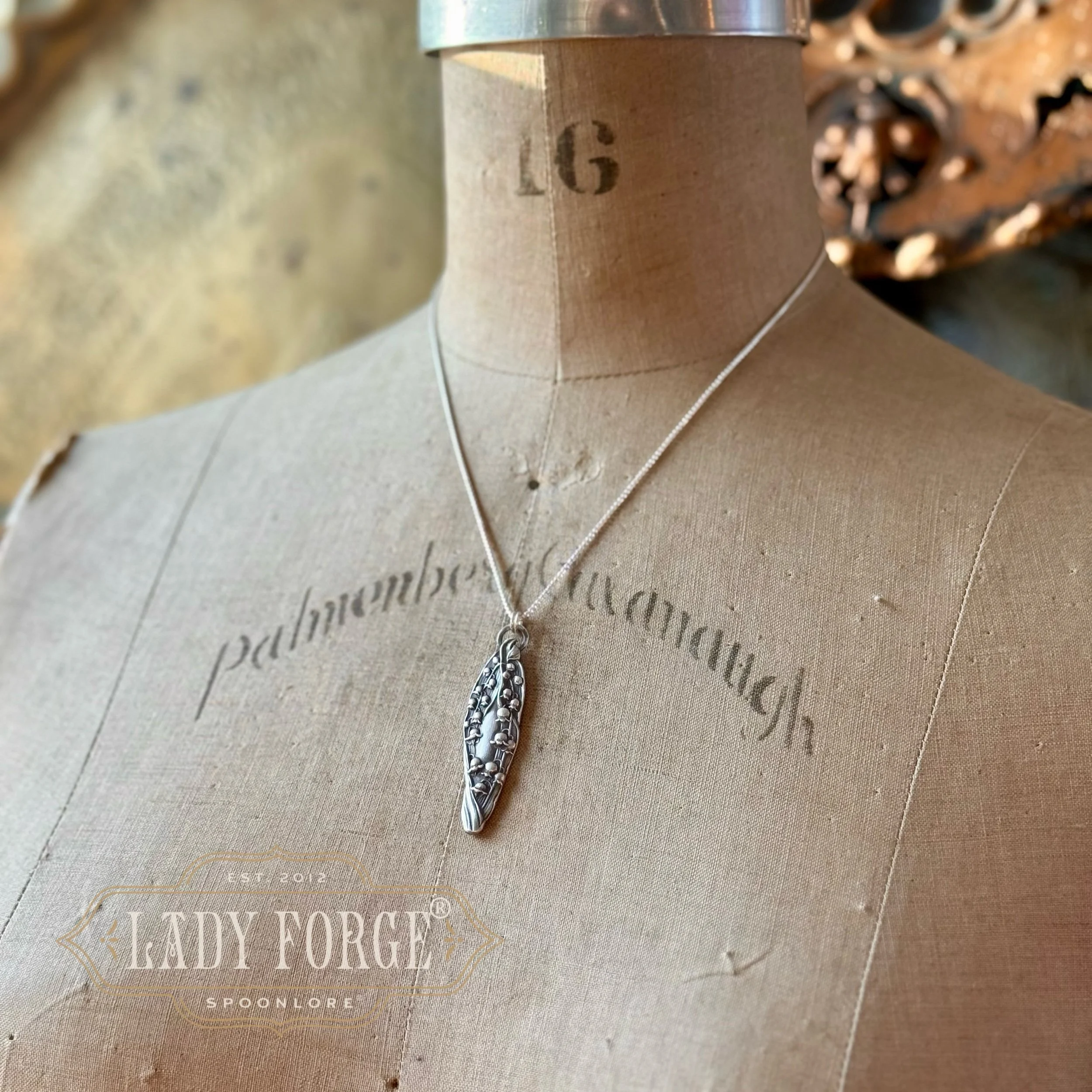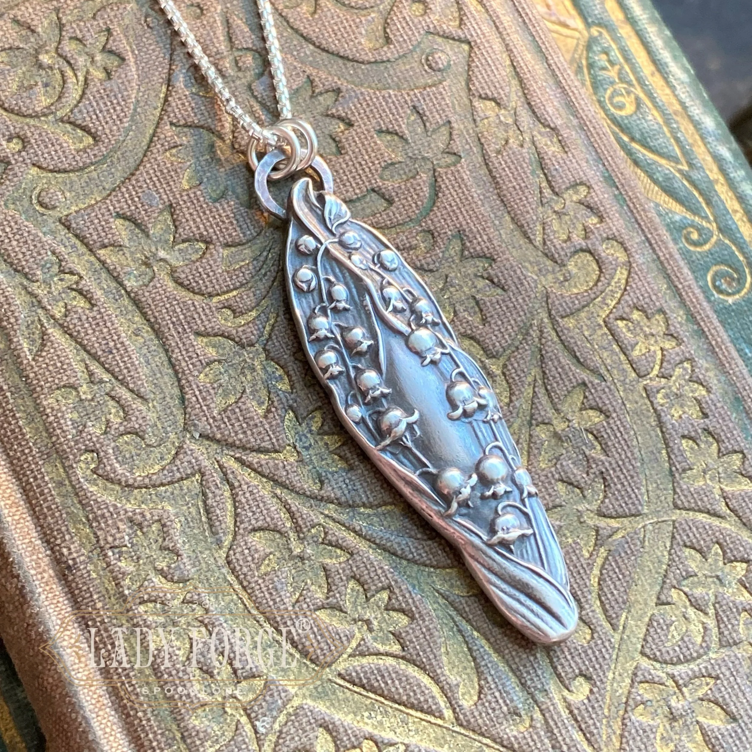 This sterling spoon necklace was made from the Lily of the Valley pattern designed by the Watson Co in 1903. Finished with your choice of 16, 18, or 20 inch Italian sterling chain