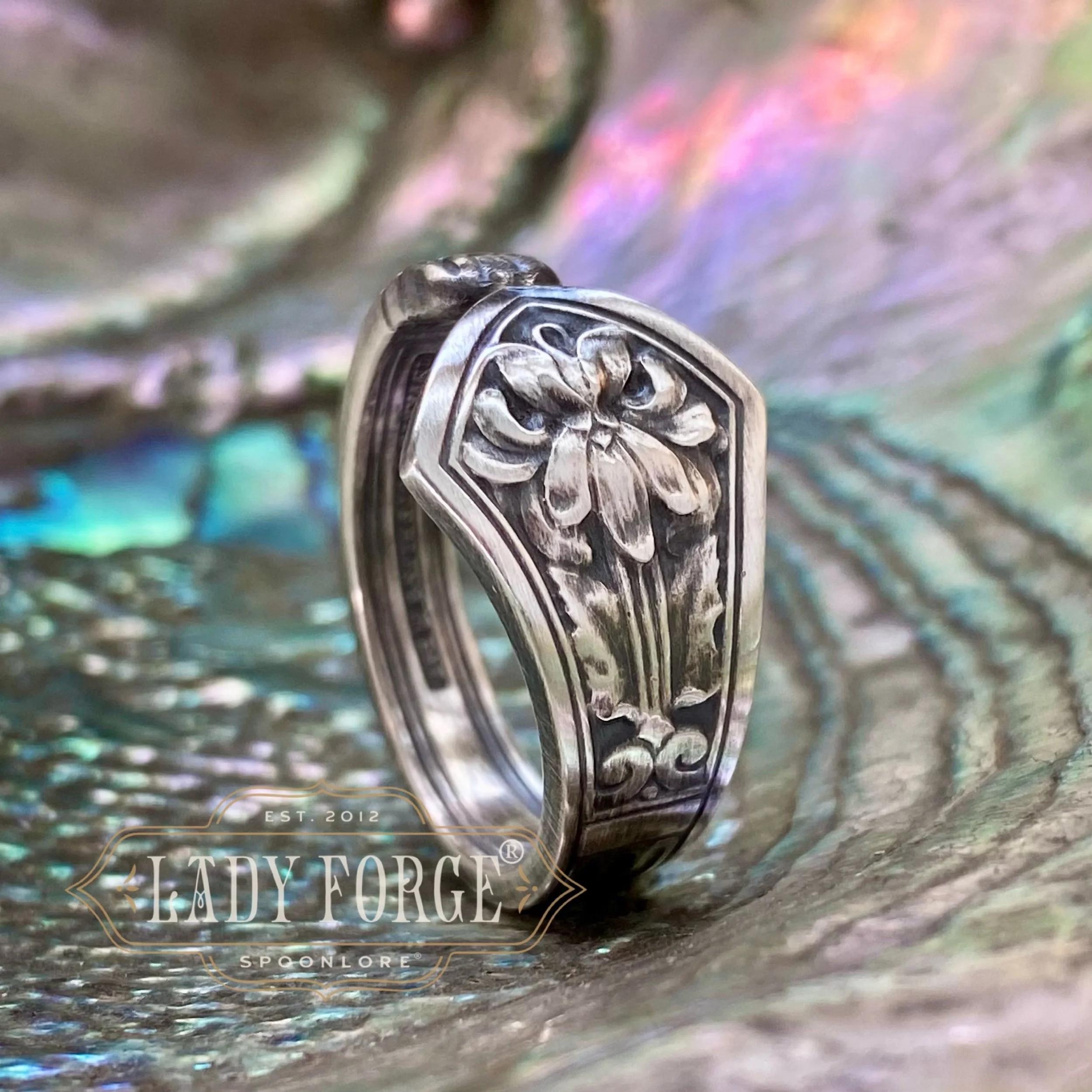 This sterling Violet spoon ring was made from the Deco Floral set designed by John C Moore II for the Tiffany & Co. between 1905-1930