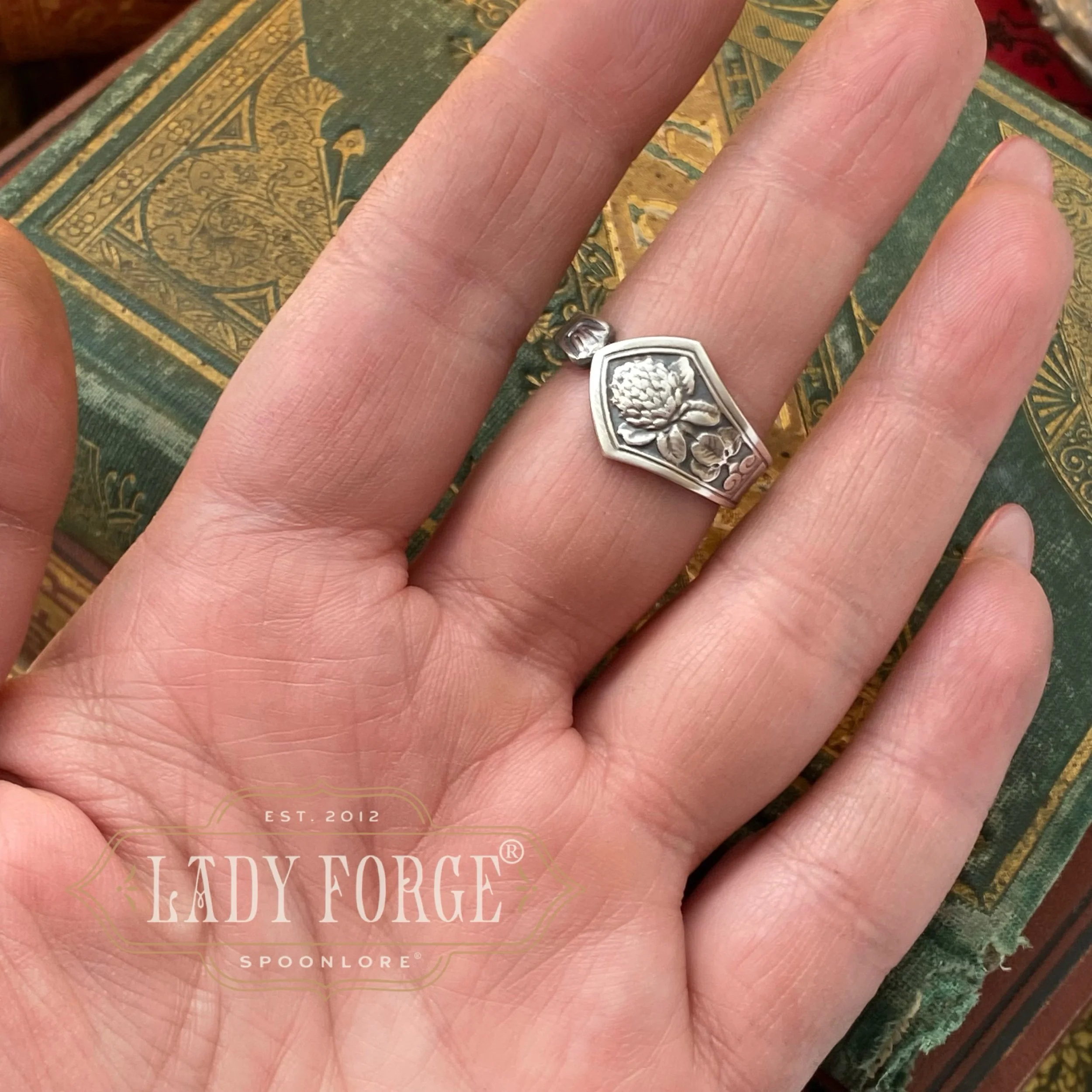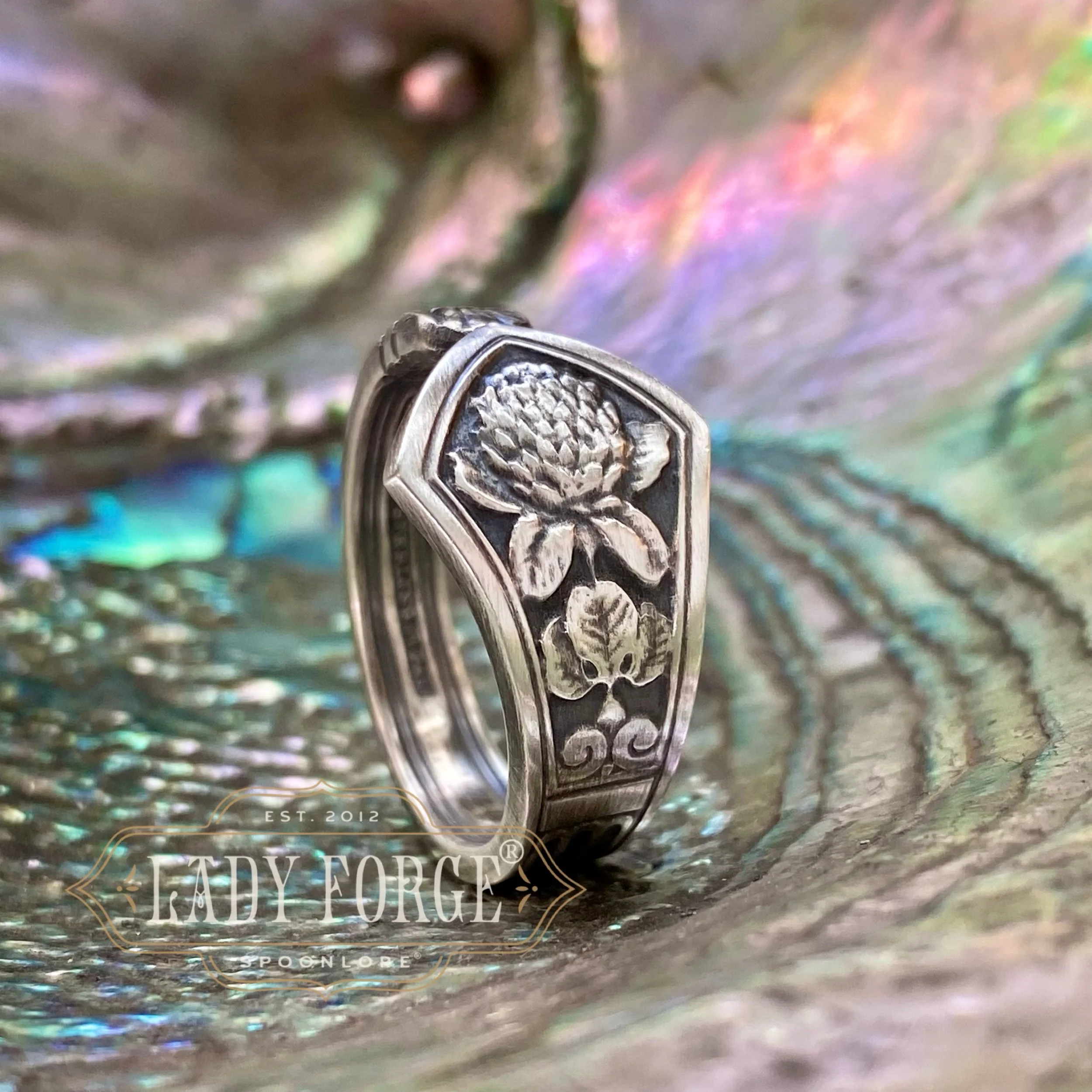 This sterling Clover spoon ring was made from the Deco Floral set designed by John C Moore II for the Tiffany & Co. between 1905-1930