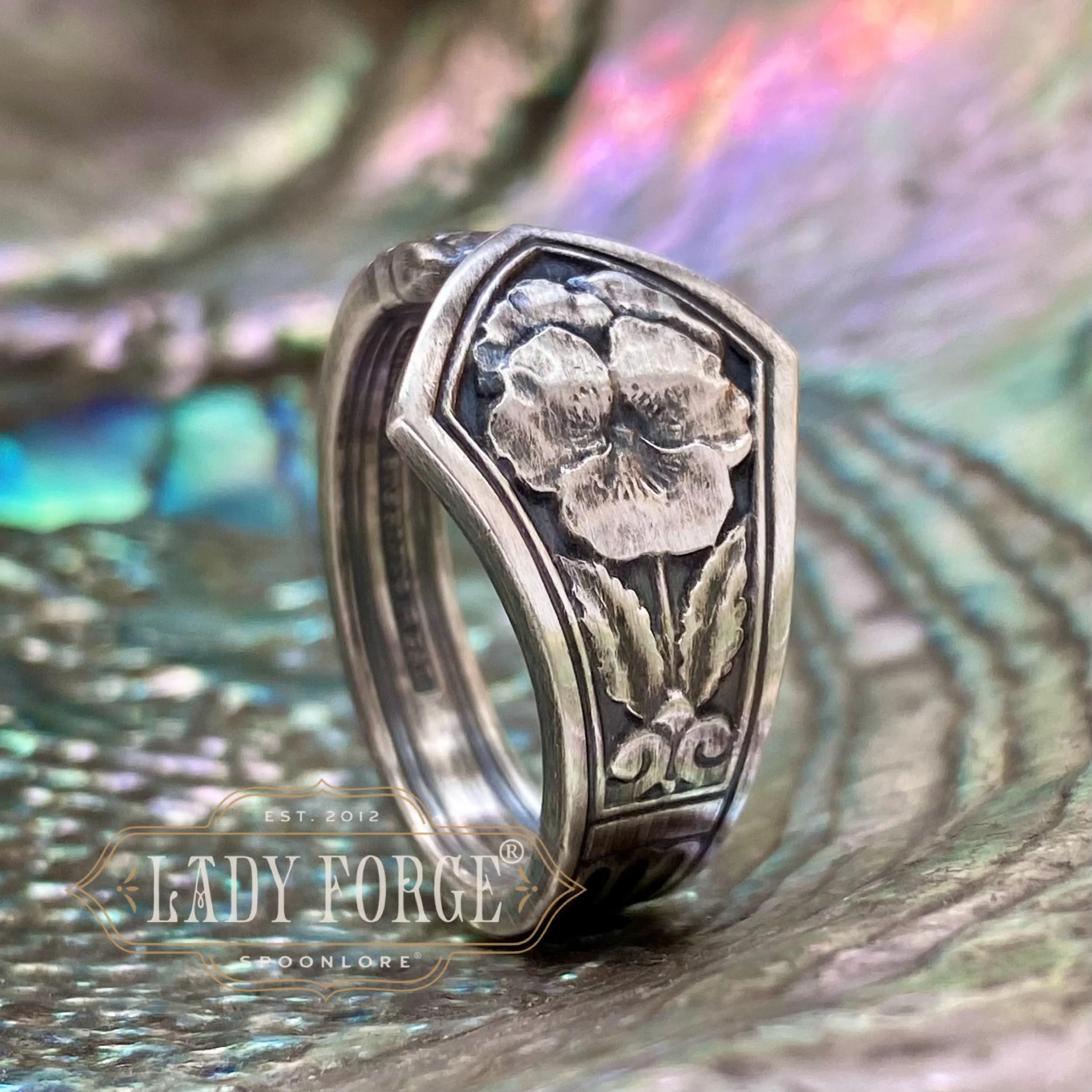 This sterling Pansy spoon ring was made from the Deco Floral set designed by John C Moore II for the Tiffany & Co. between 1905-1930