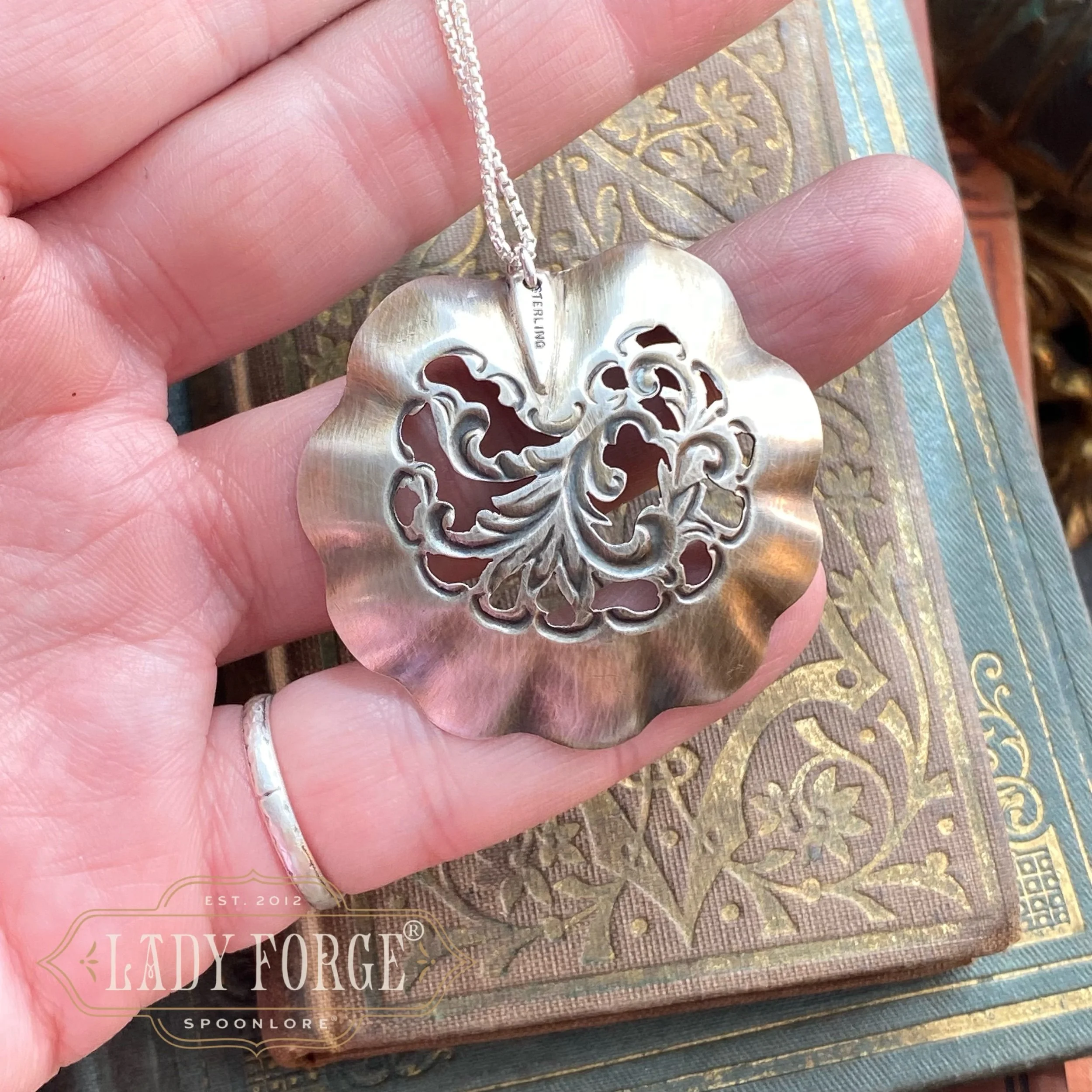 A sterling silver necklace made from a pierced bonbon pattern designed by an unknown American maker likely between 1870 and 1900