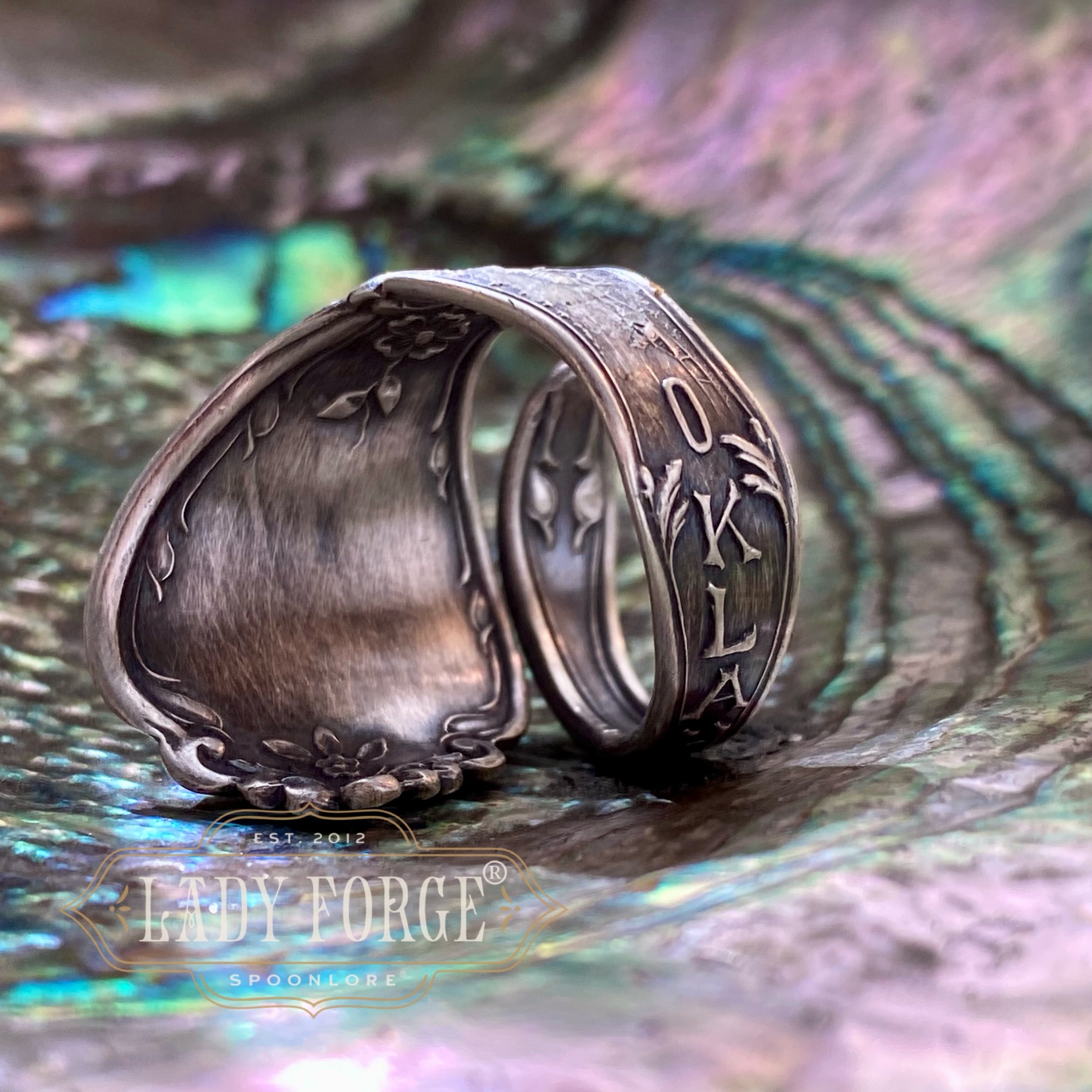 This sterling spoon ring was made from the Oklahoma pattern designed by the Baker Manchester Co between 1890-1920