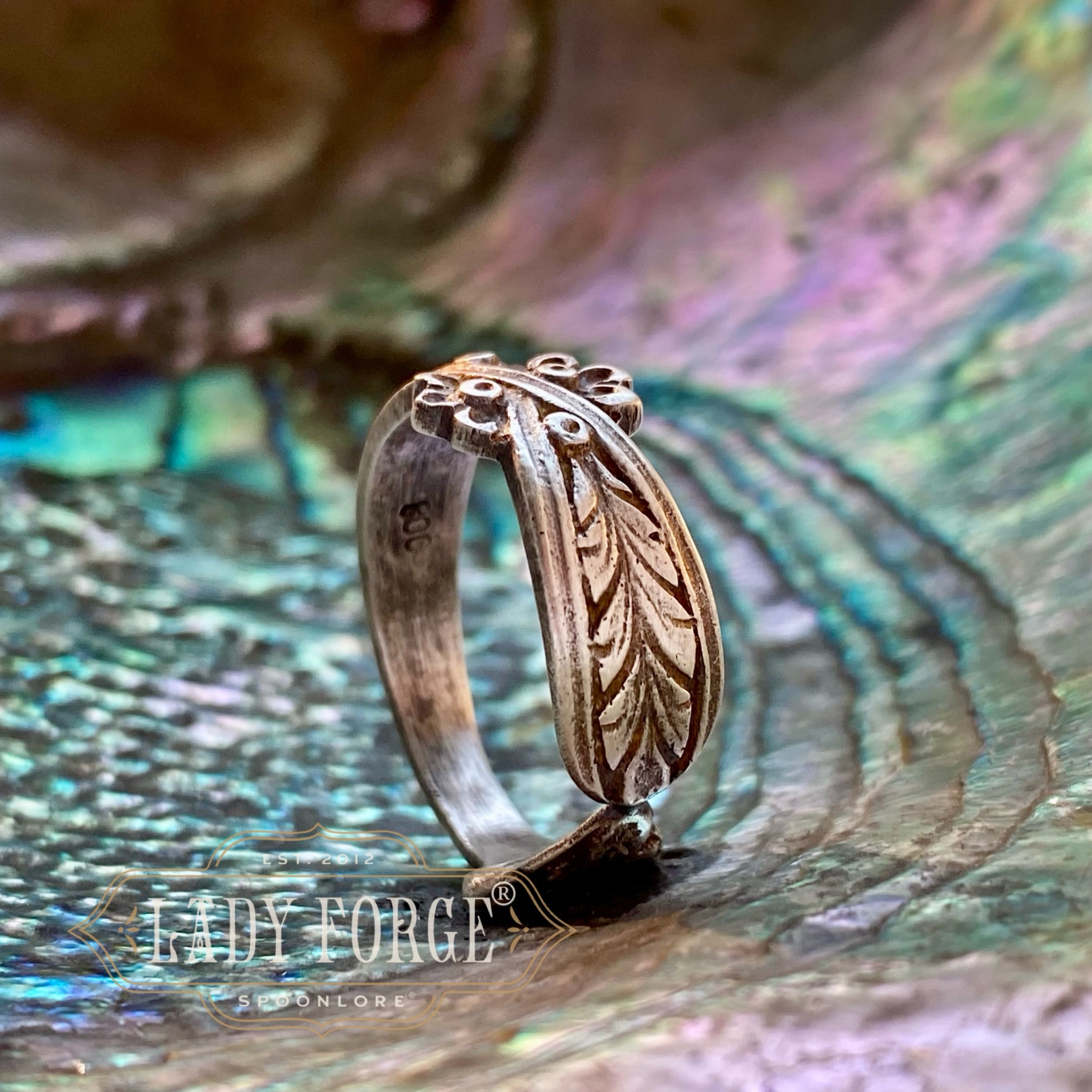 This silver spoon ring was made from the Hildesheim Rose pattern designed by in Germany between 1910-1940