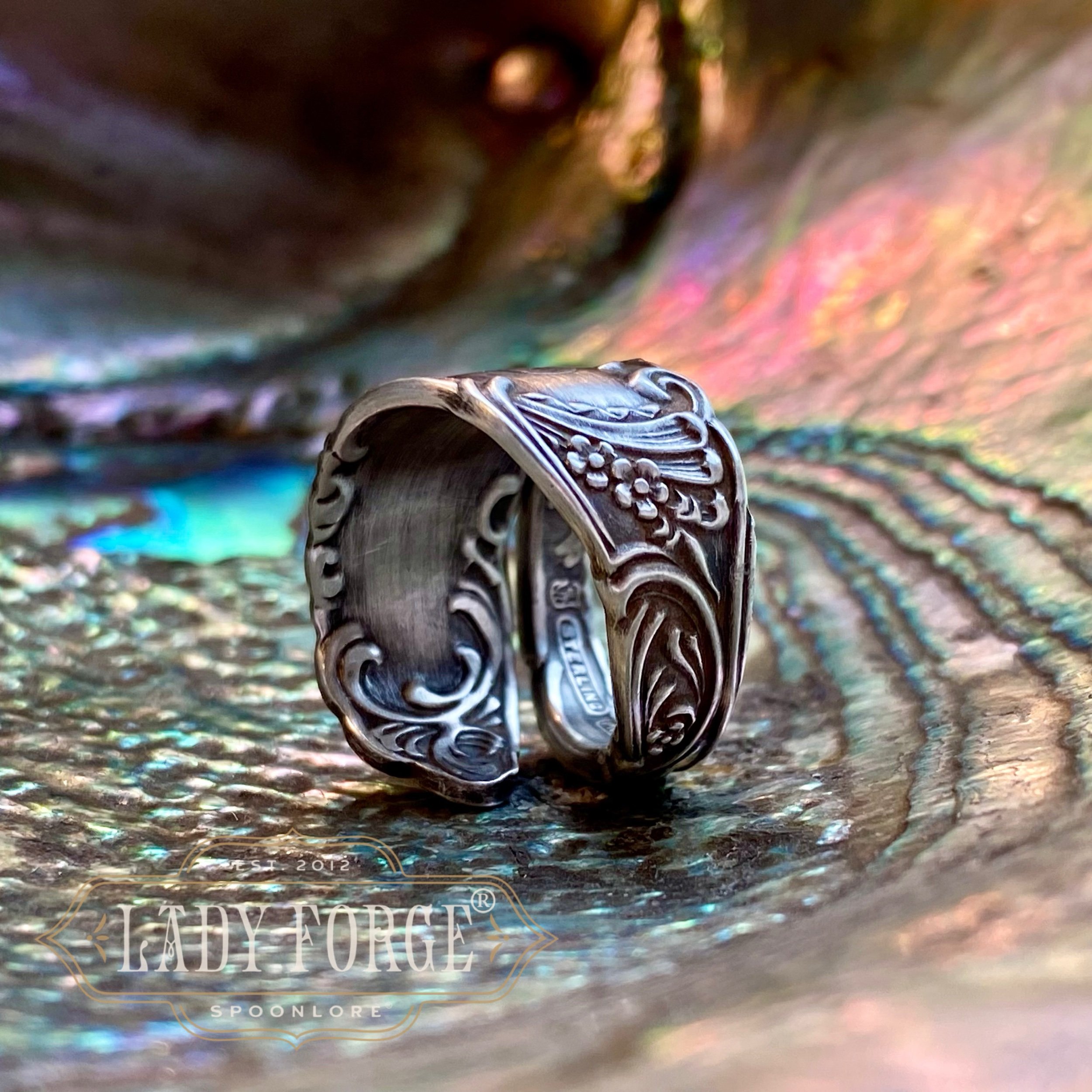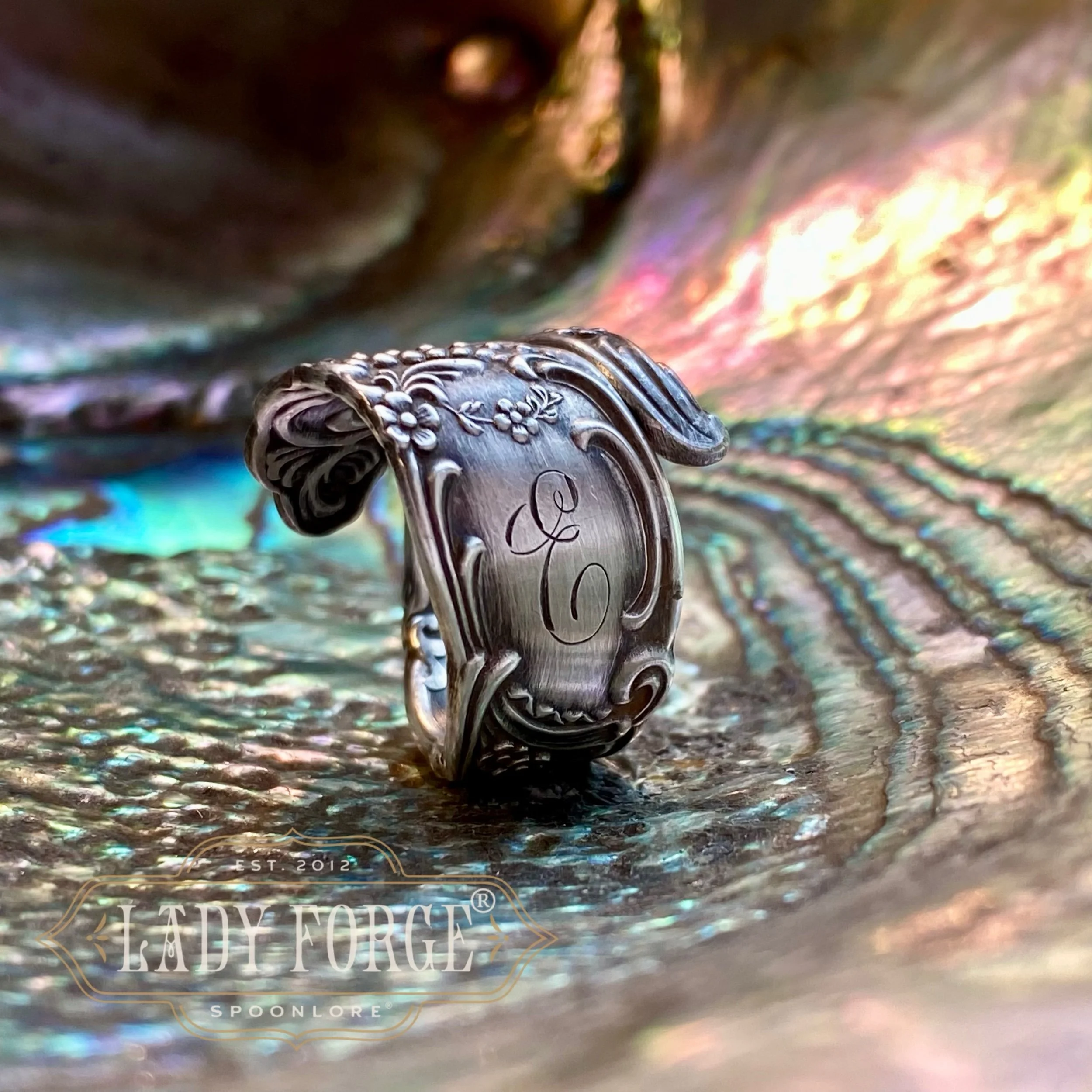This sterling spoon ring was made from the Princess pattern designed by the Towle Co. in 1911. original hand engraved monogram, E