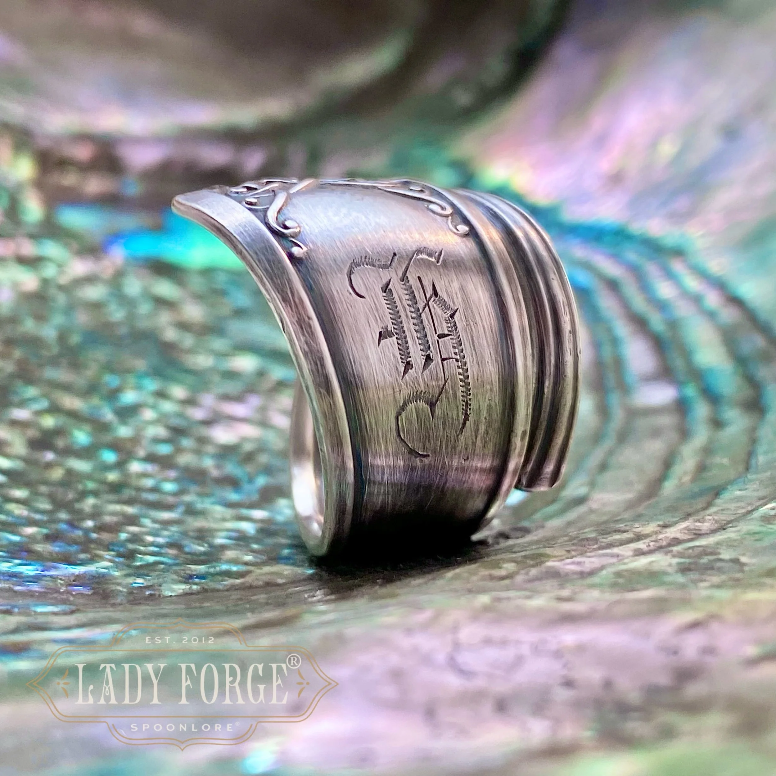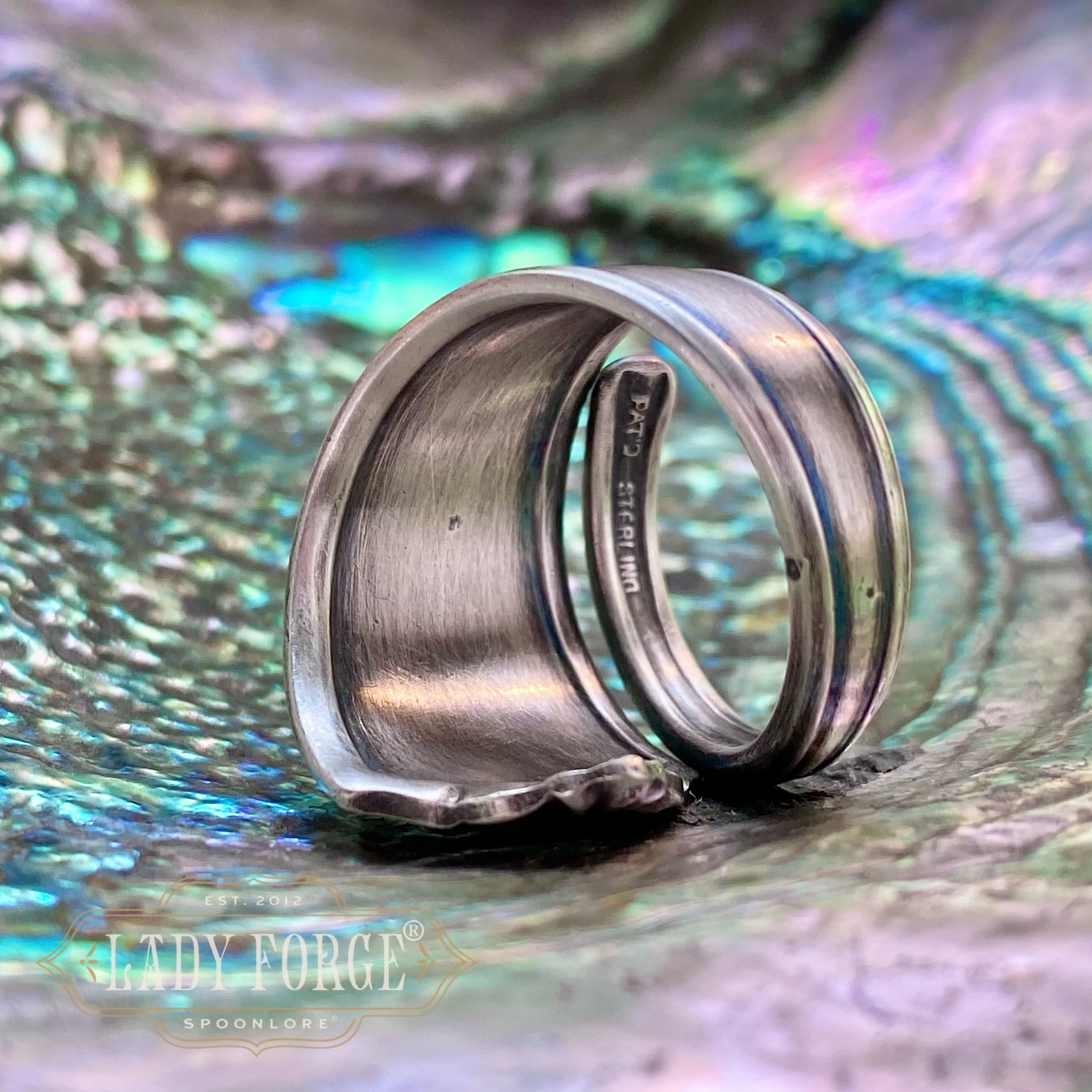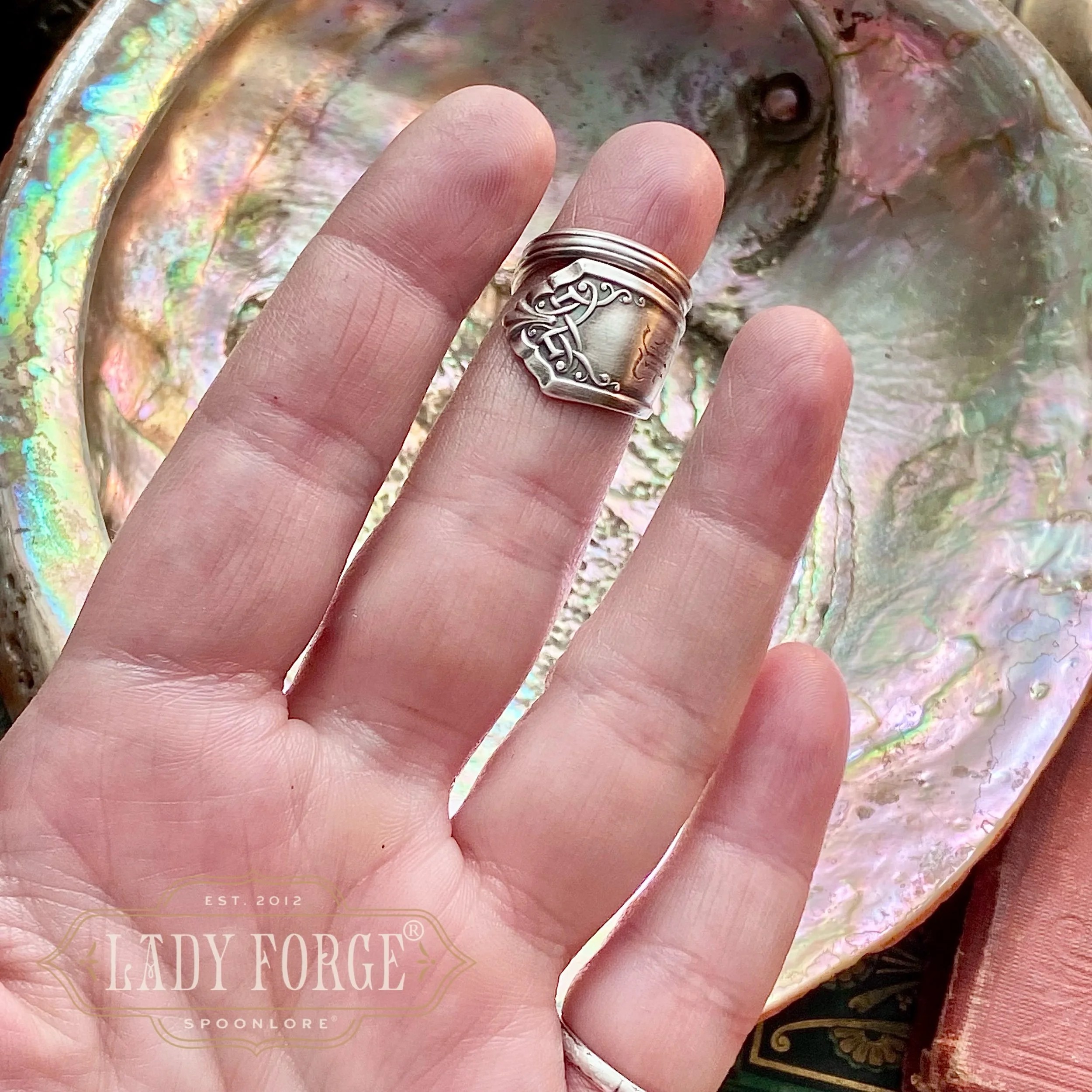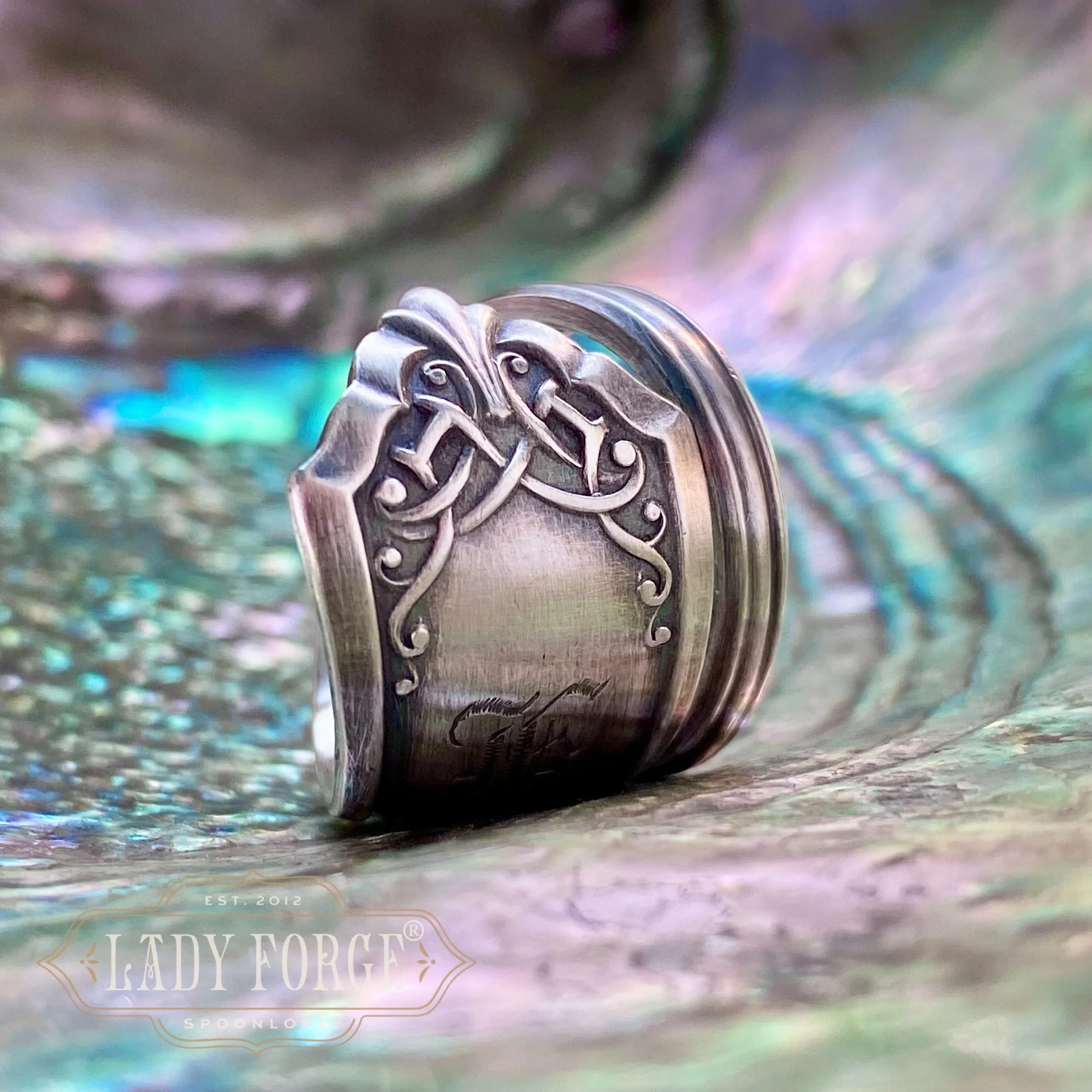 This sterling spoon ring was made from the Leicester pattern designed by John R Dean for the International Silver Co in 1911