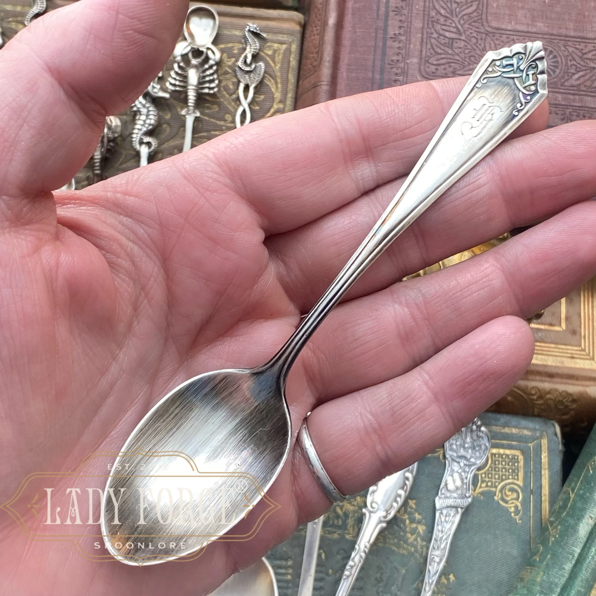 I love spoon jewelry. And I love hunting for the most beautiful spoons to make it! Spoon jewelry is a little wearable piece of history allowing the story and beauty of the pattern to be displayed and treasured, rather than being forgotten in a drawer or melted down as many of these antique beauties are.