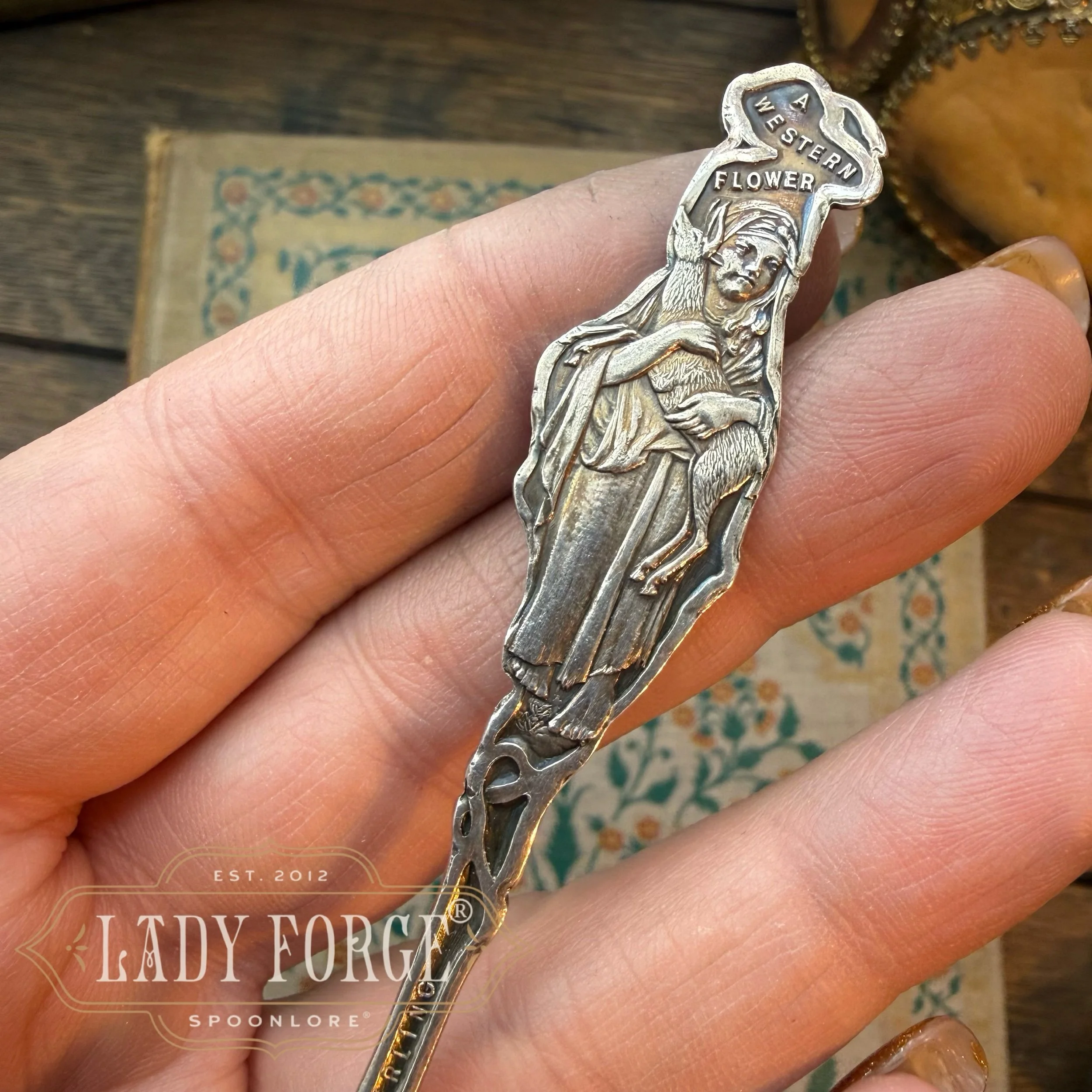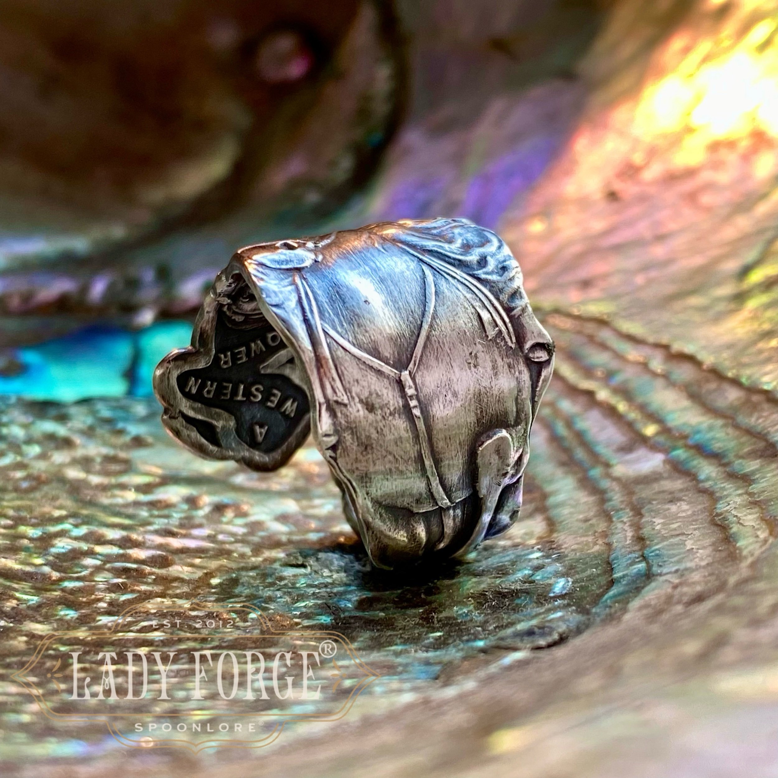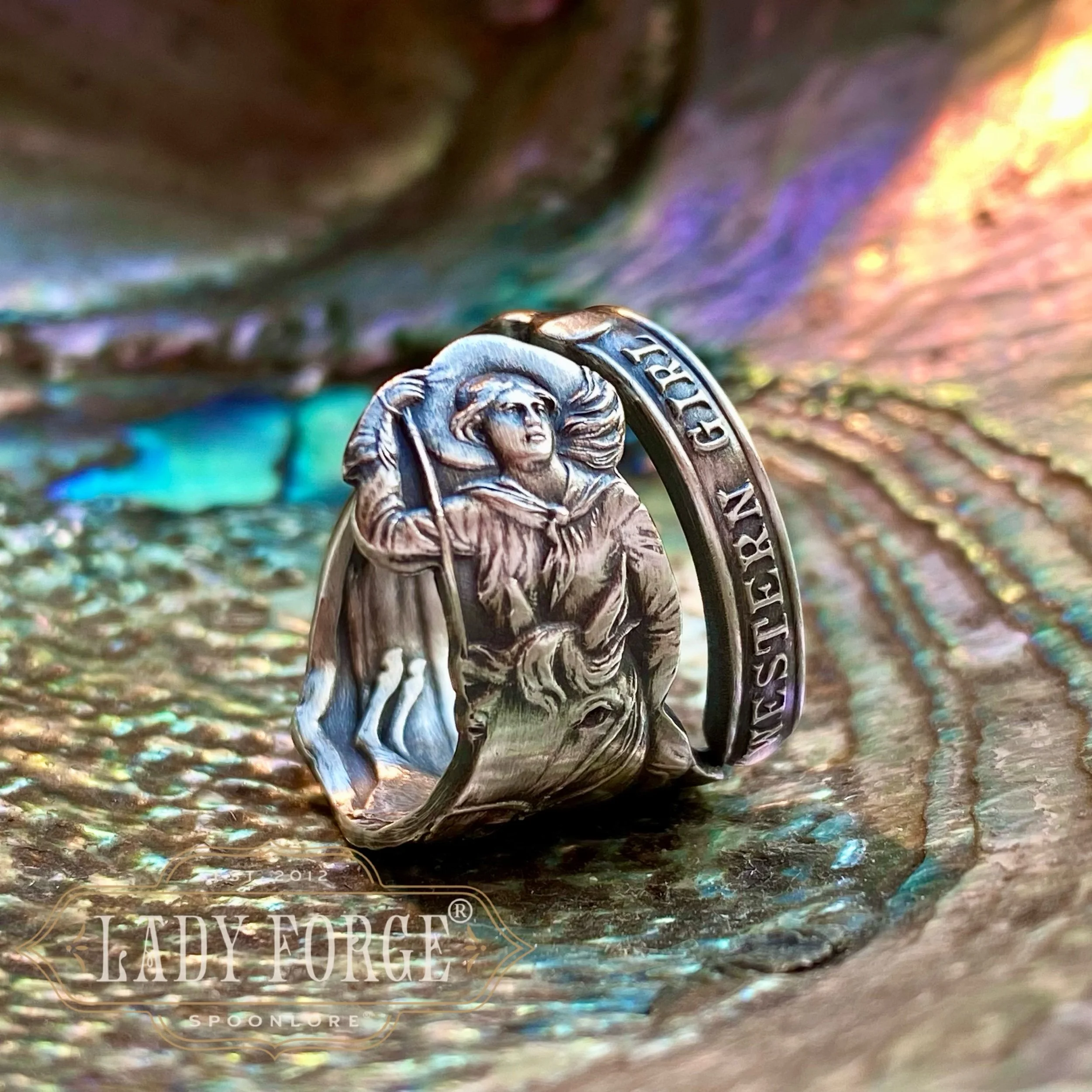 This sterling spoon ring was made from the Western Girl pattern designed by the Watson Co. Between 1890-1920