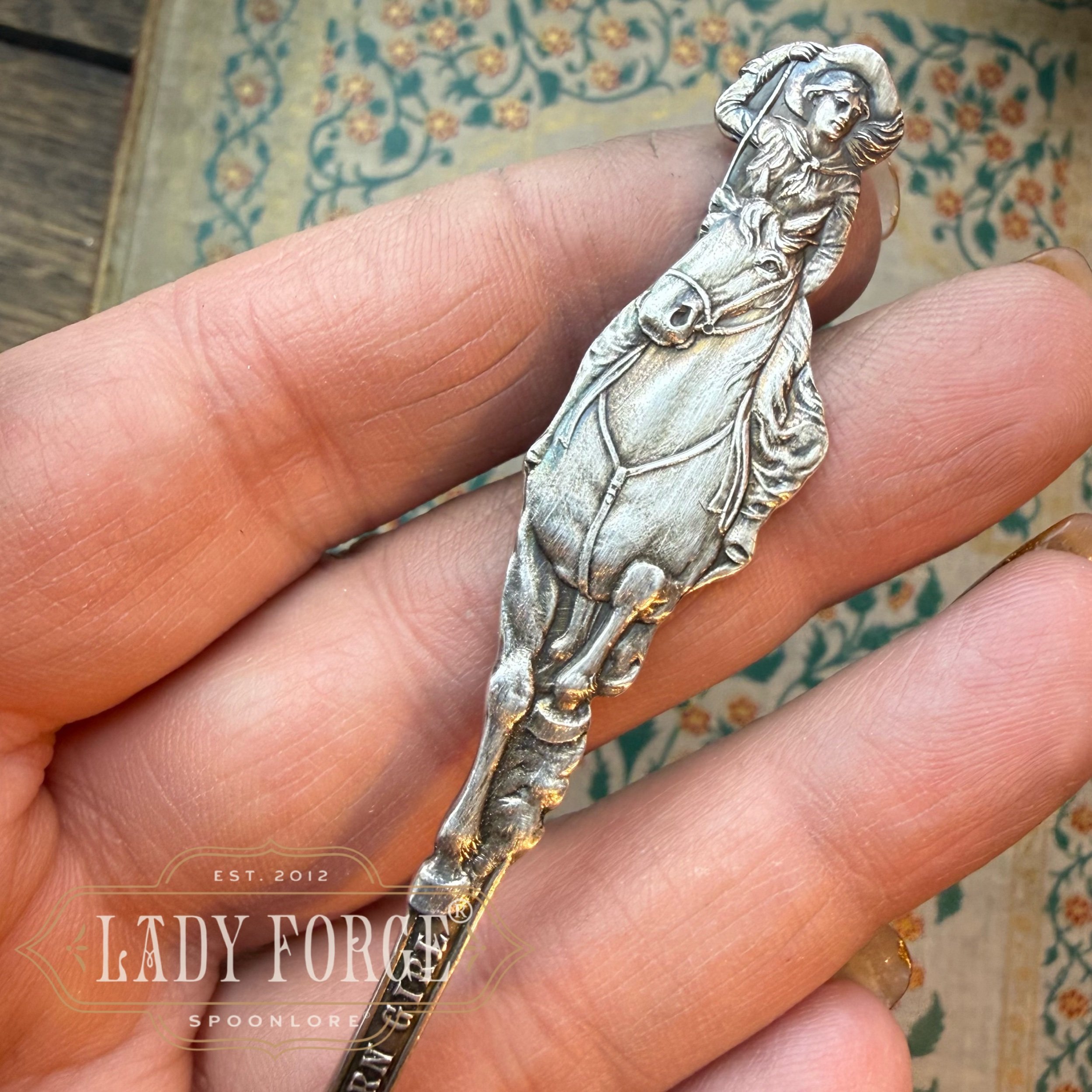 Holding her hat as the wind sweeps through her hair, a stride her galloping mare, this western beauty captures the idealized woman of the west: independent, capable, and adventurous, at a time when the American frontier was becoming legend. A deliberate statement of strength and autonomy, not fragility. The reverse side shows the westerns woman’s softer counterpart: the softer, calmer and grounded pioneer and protector. Keeper of home and tradition. The western flower.