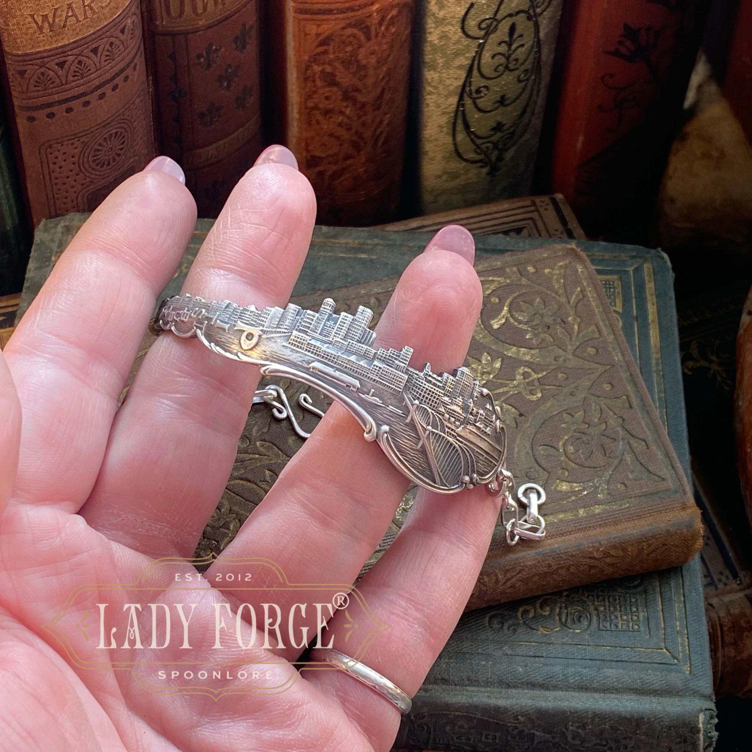 Each Lady Forge Spoon chain bracelet is made using the entire length of the handle to include all the wonderful detail of this pattern. It includes a sterling silver chain that allows the bracelet to be adjustable for any size wrist.