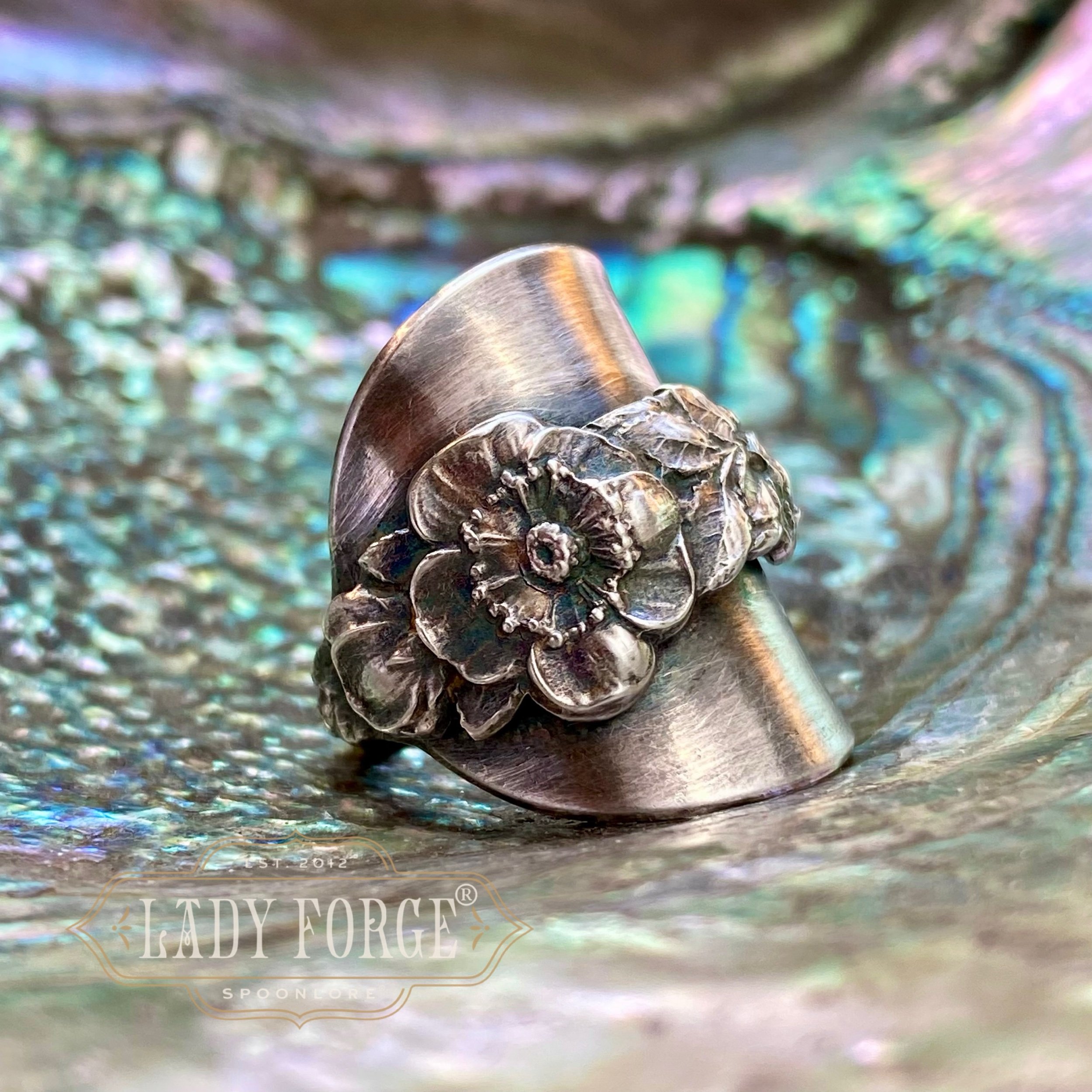 This sterling Wild Rose spoon ring was made from the Floral series designed by the Watson Co. in 1903