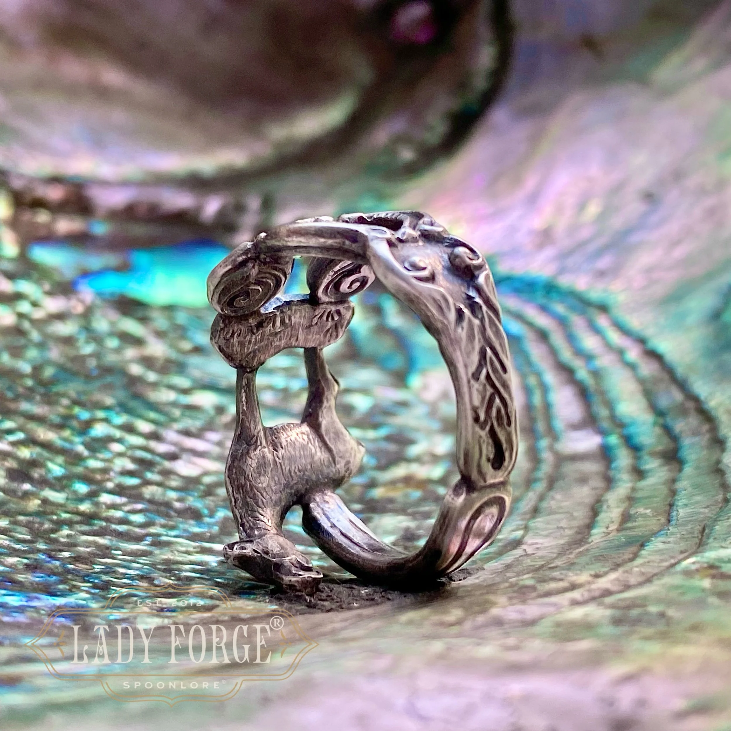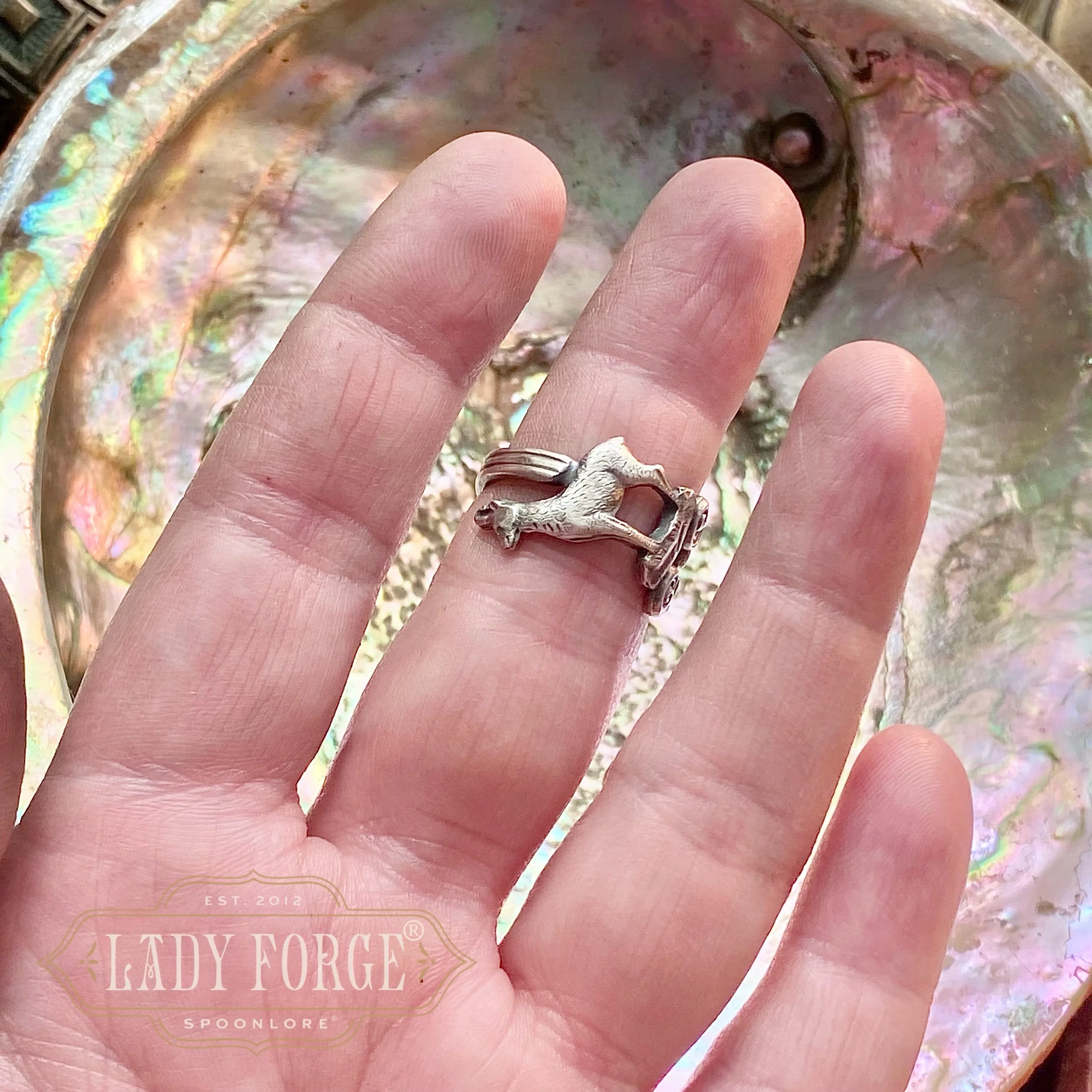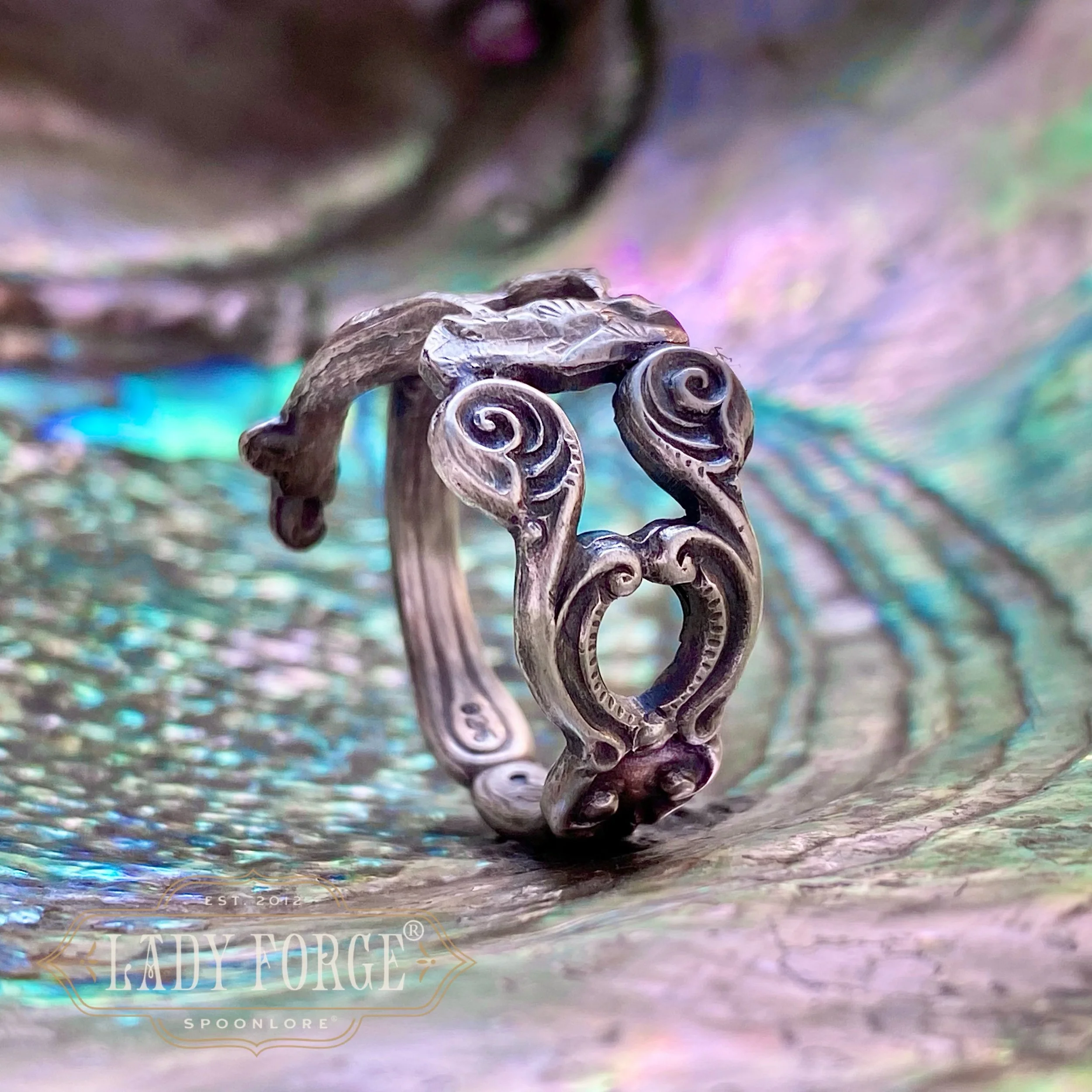 Made from a teaspoon, this spoon ring sits smooth and comfortably on the hand. Wider on the top of the hand, and narrow on the underside for comfortable movement