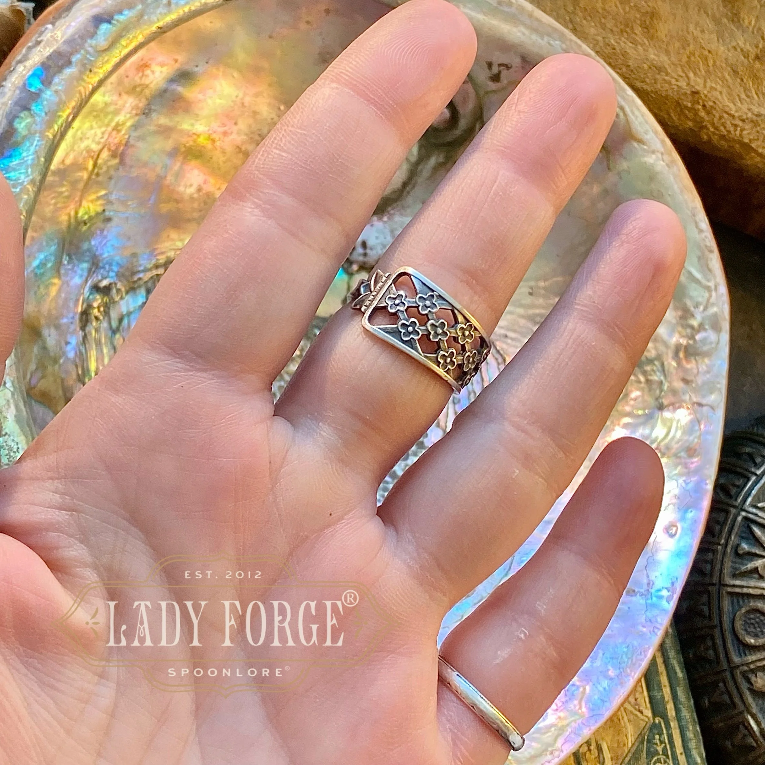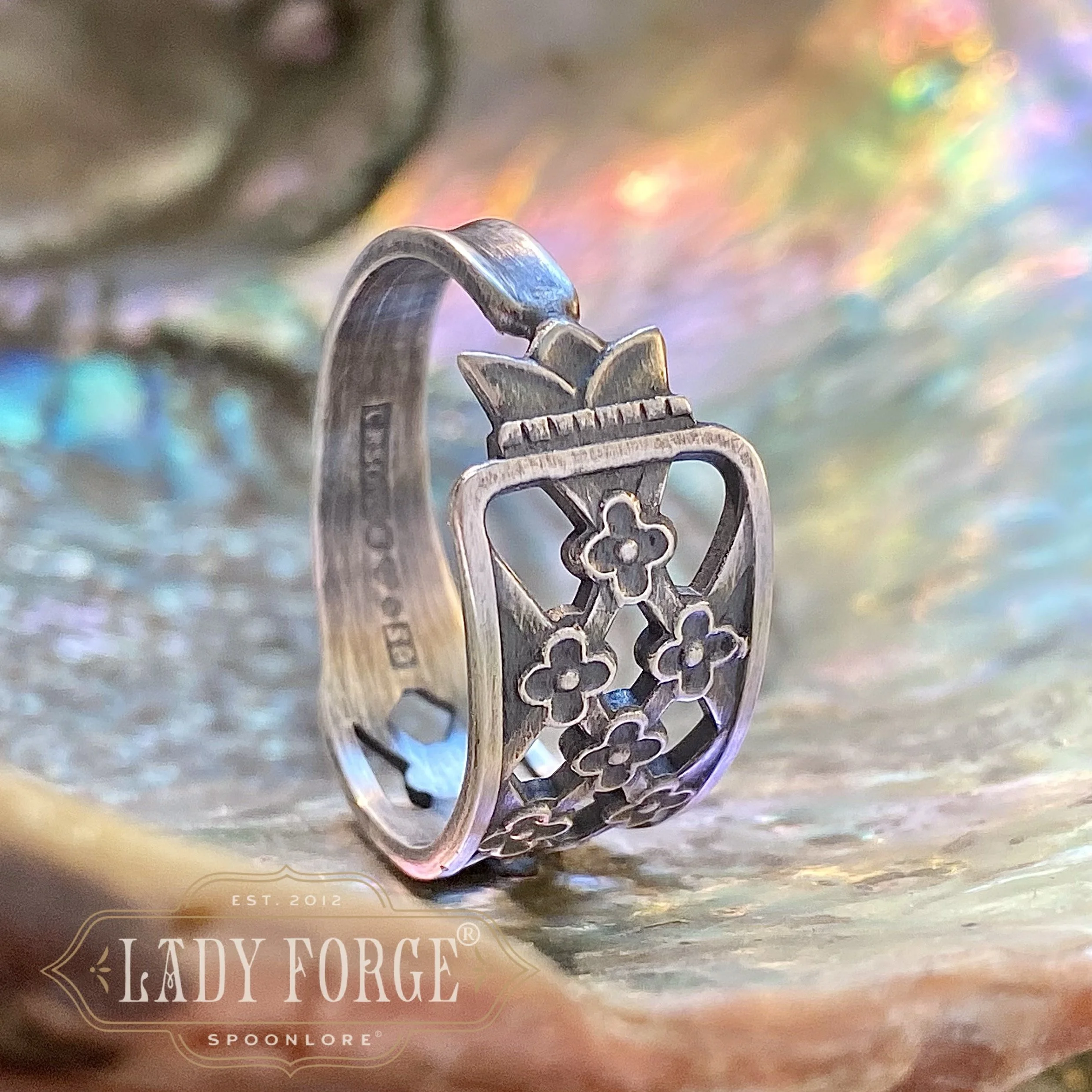 This sterling spoon ring was made from the Floral Lattice pattern designed by the Capone Co of Göteborg Sweden in 1989