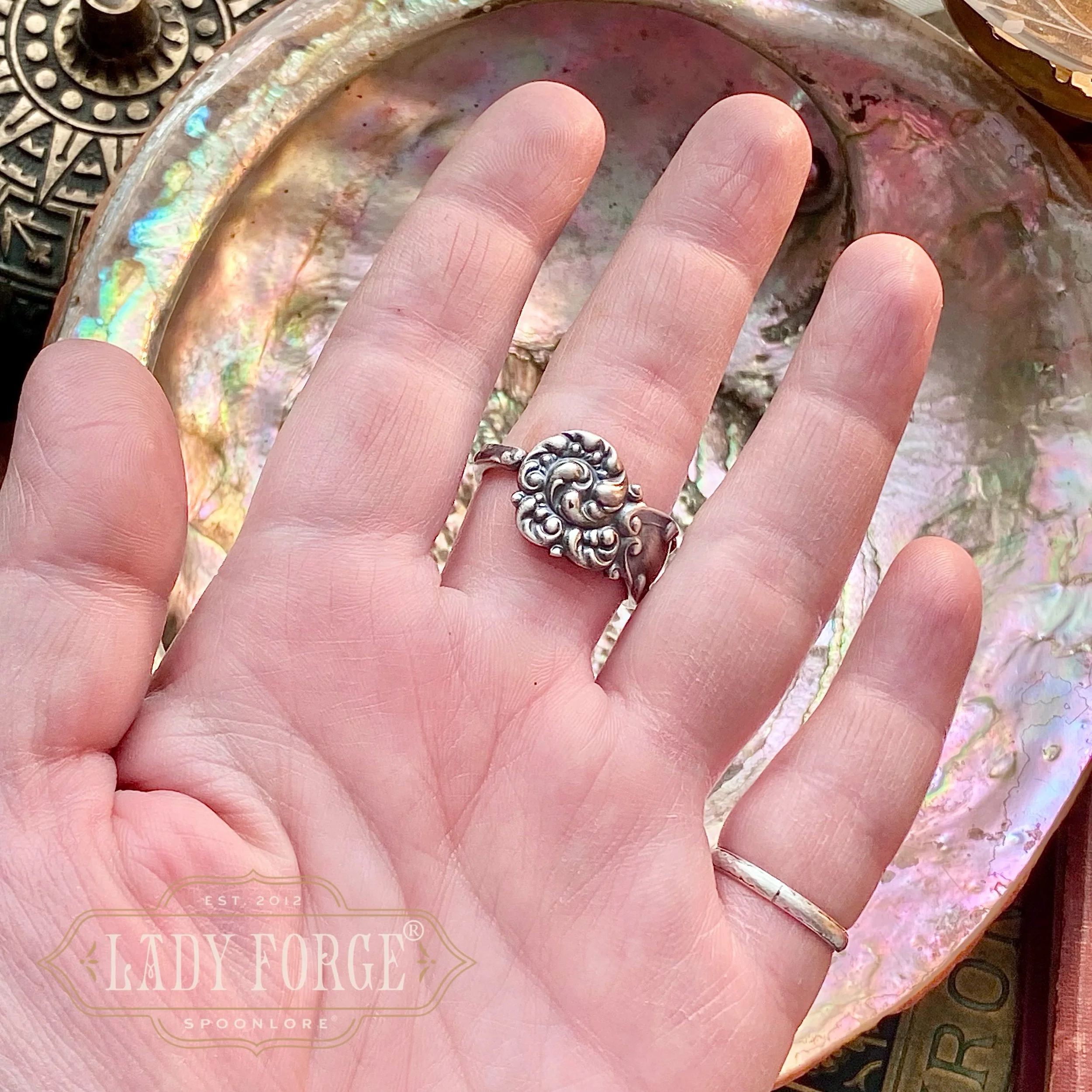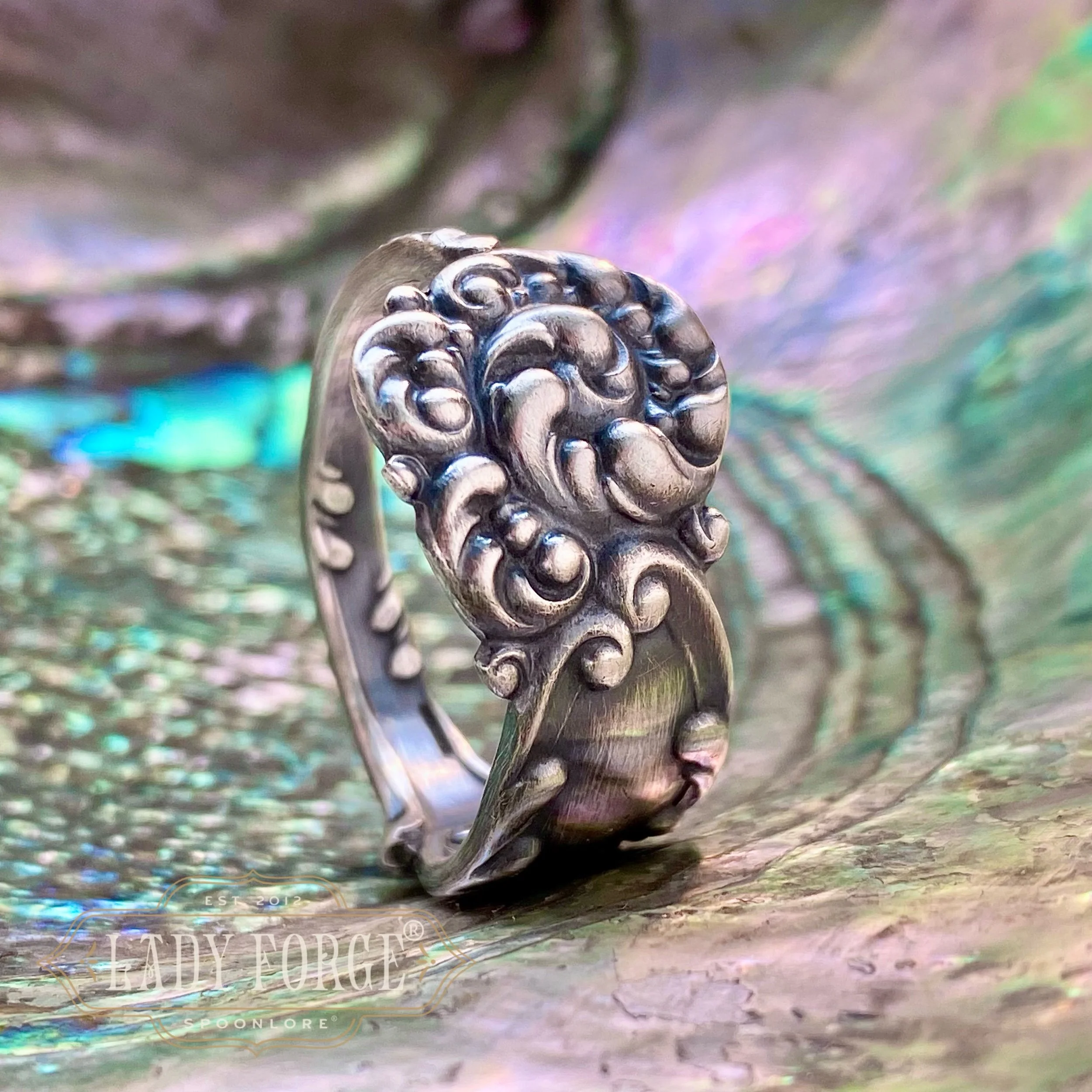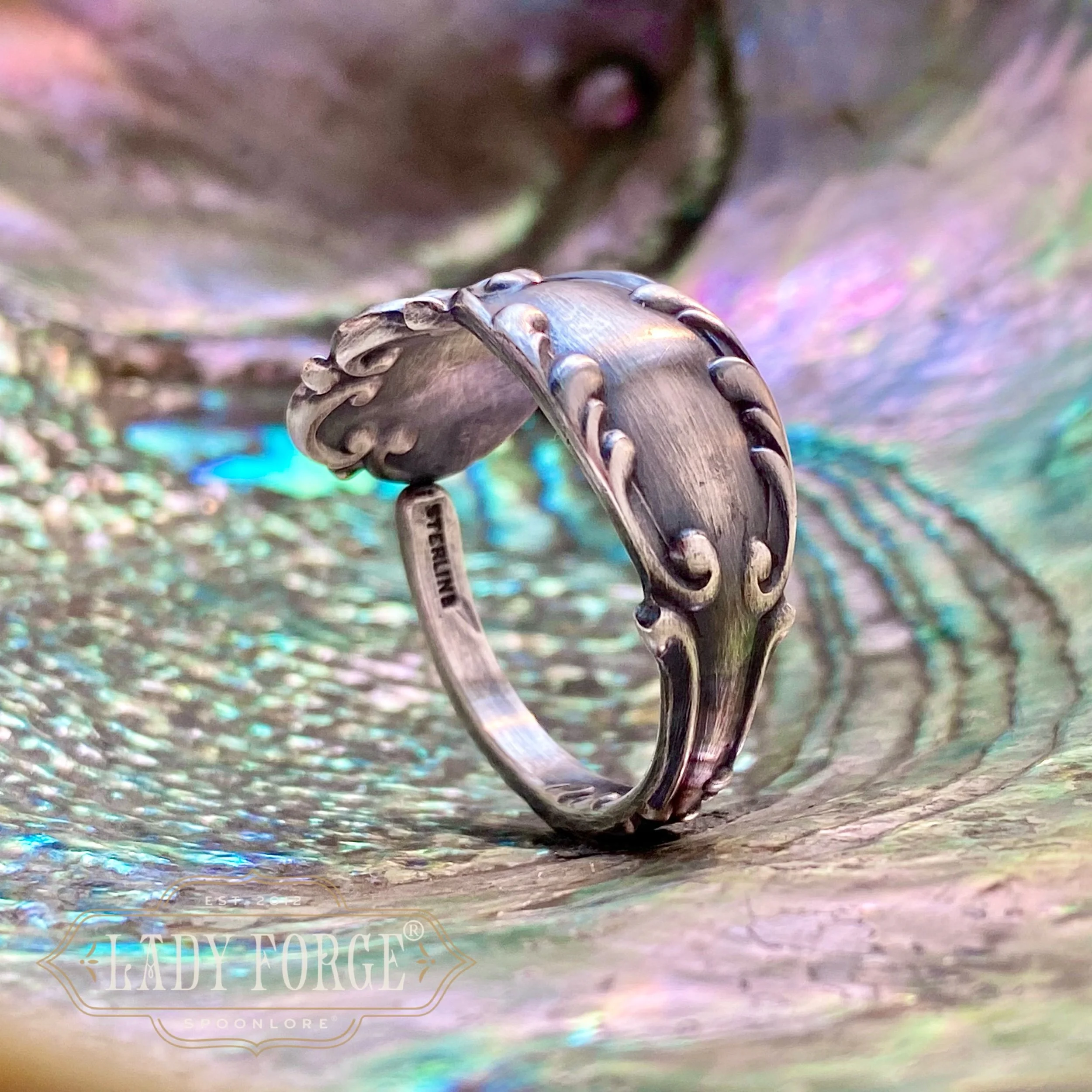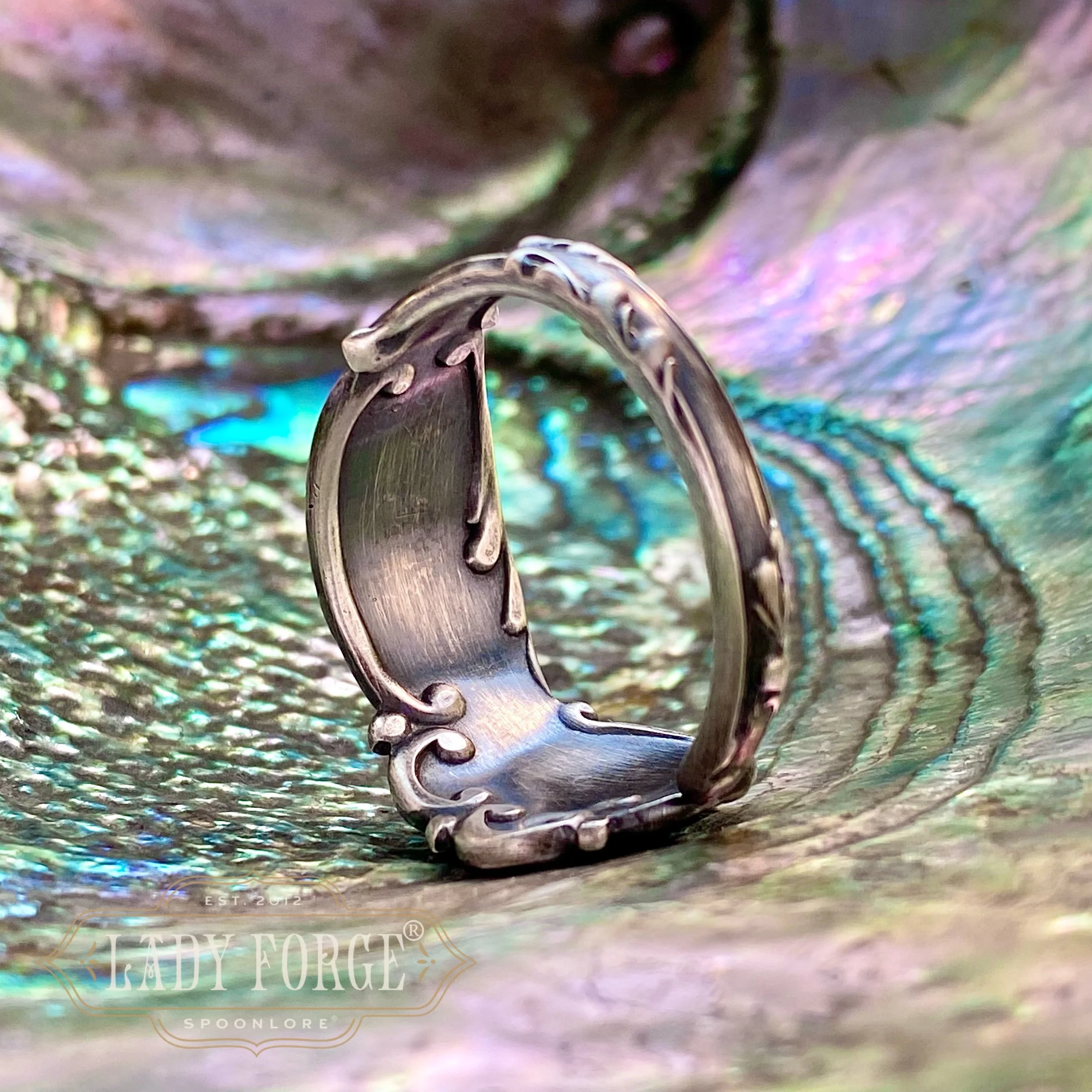 This sterling spoon ring was made from the La Reine pattern designed by the Reed & Barton Co in 1893