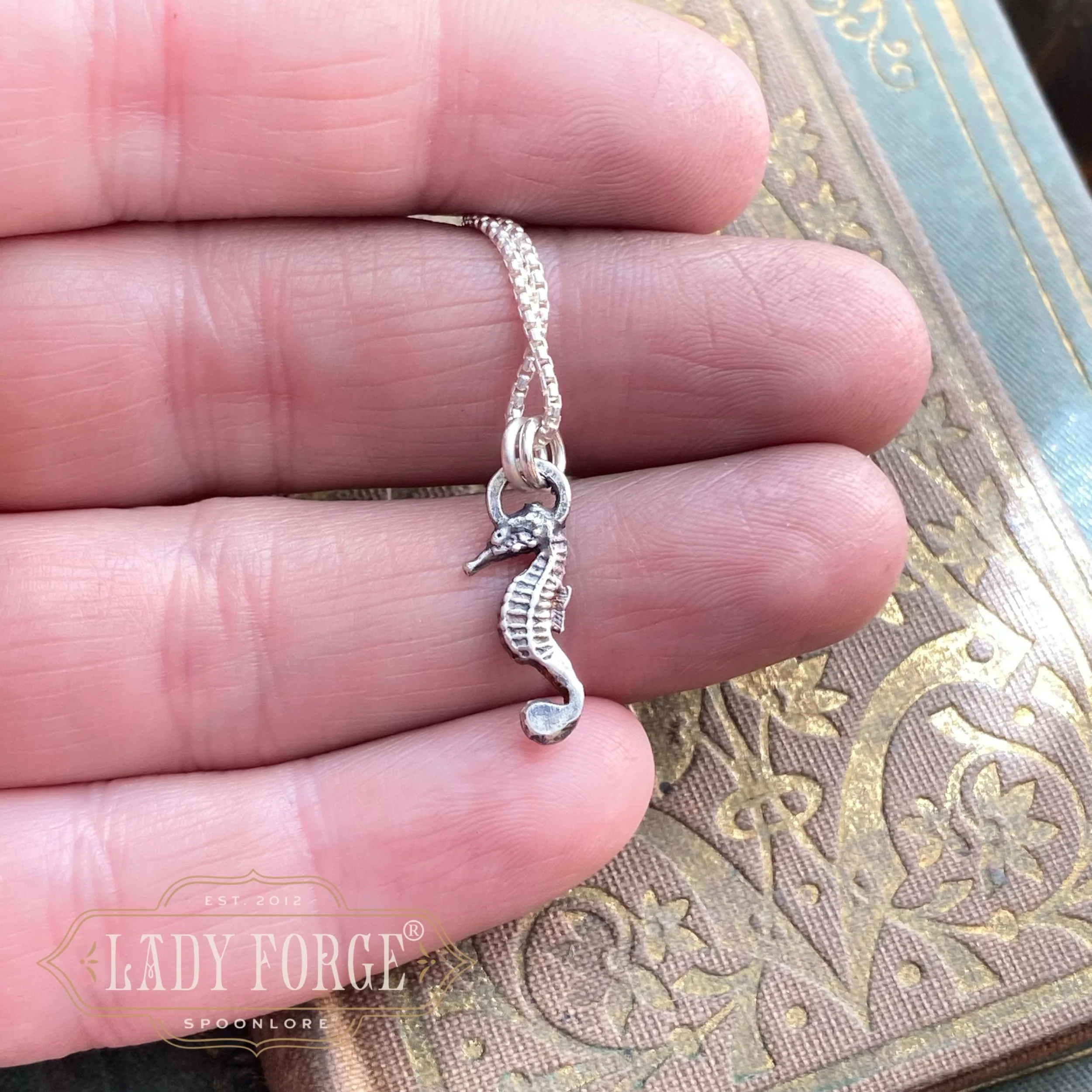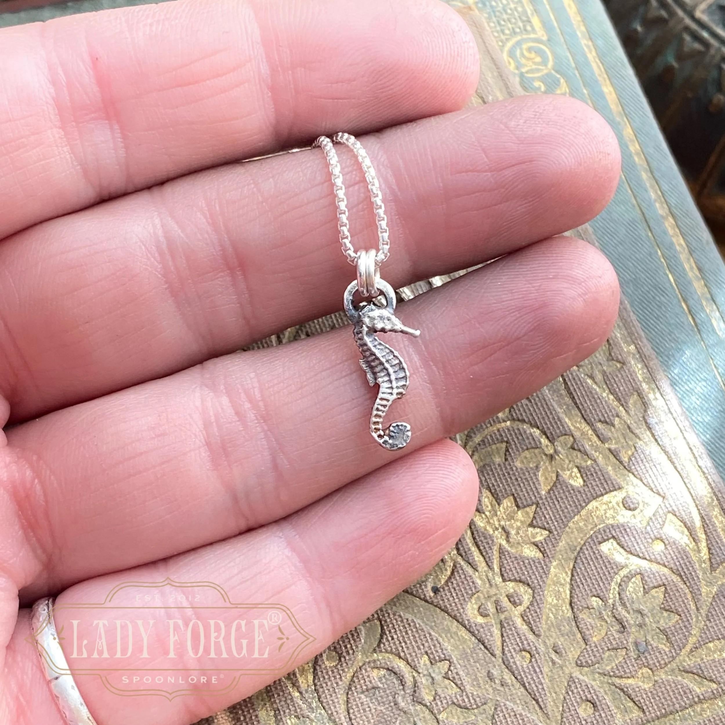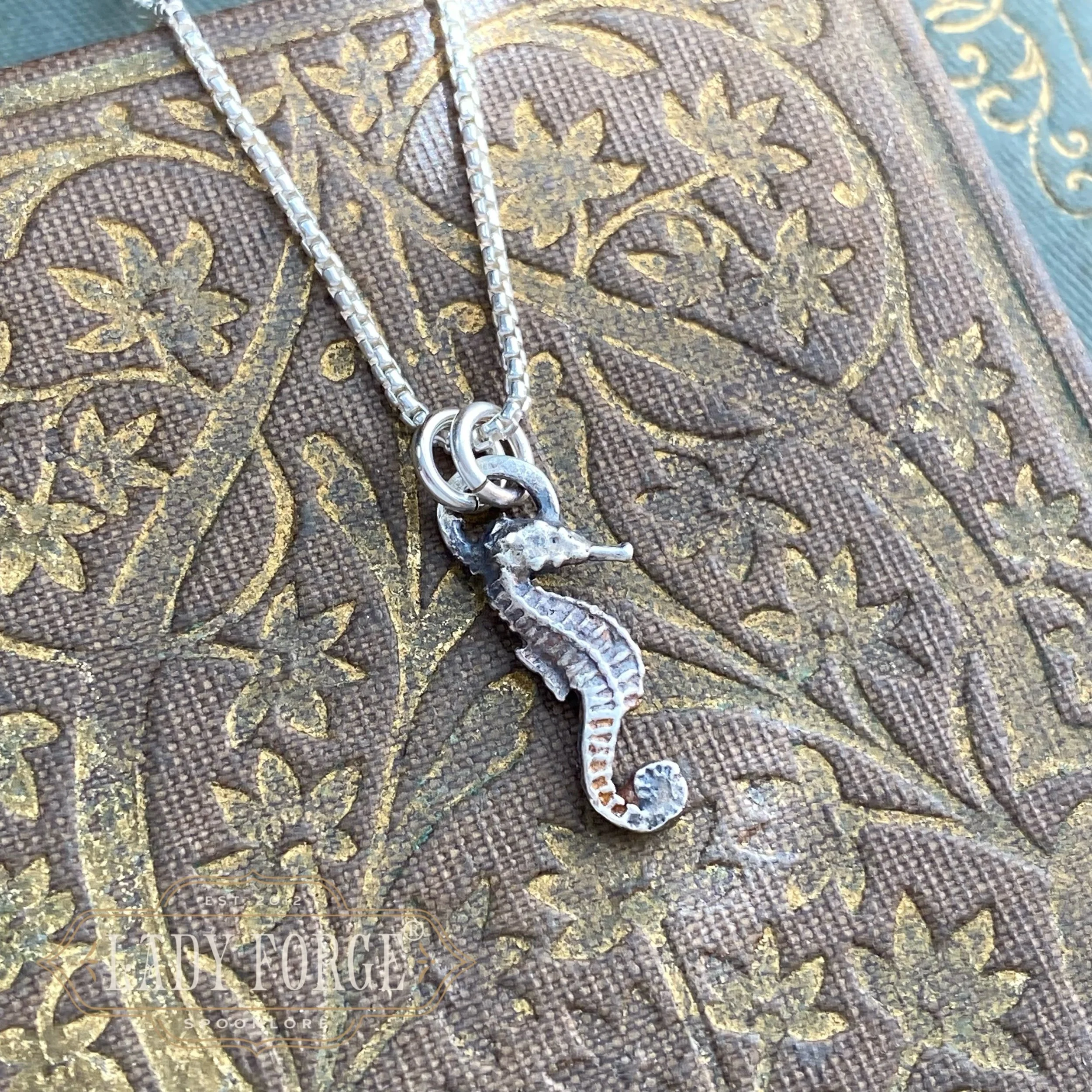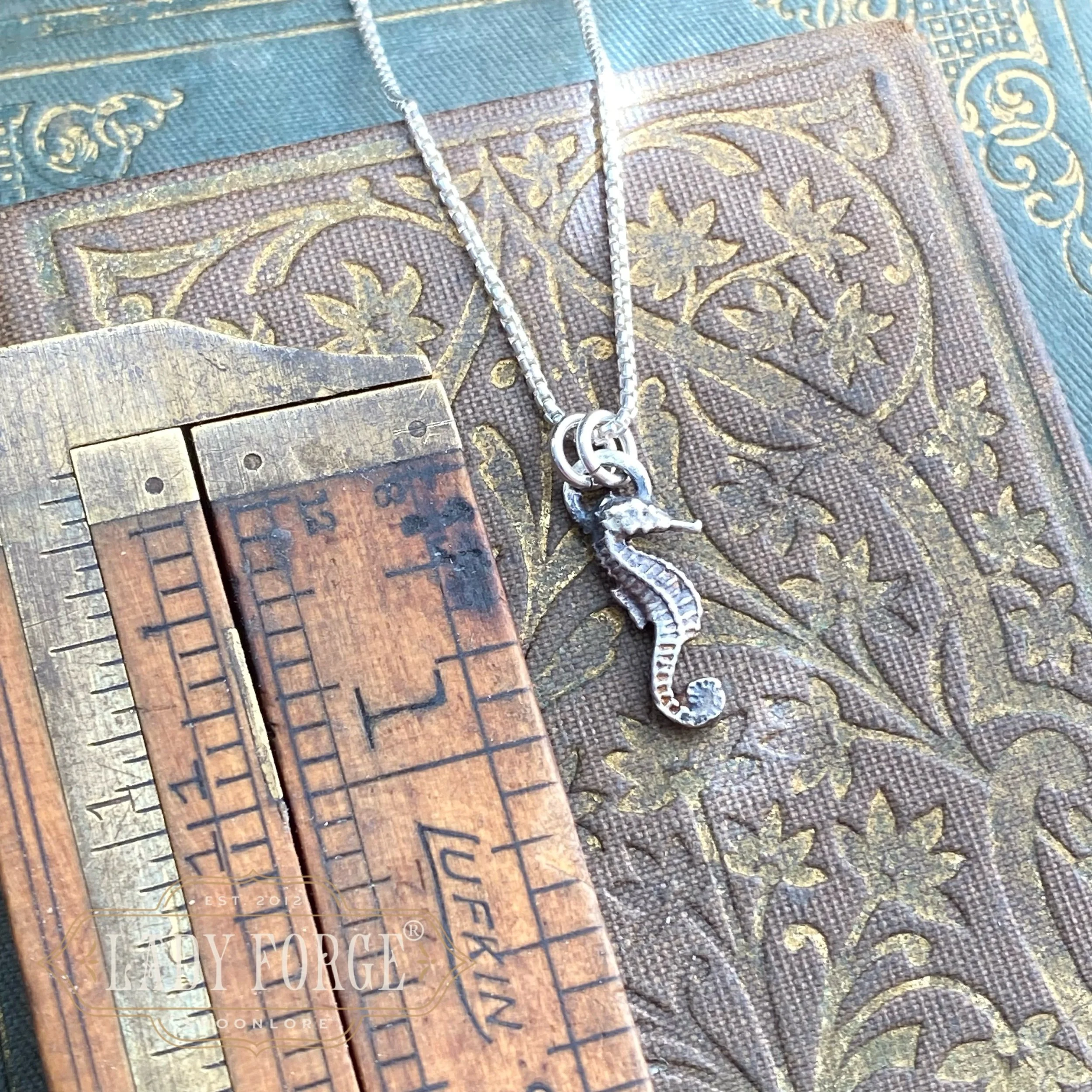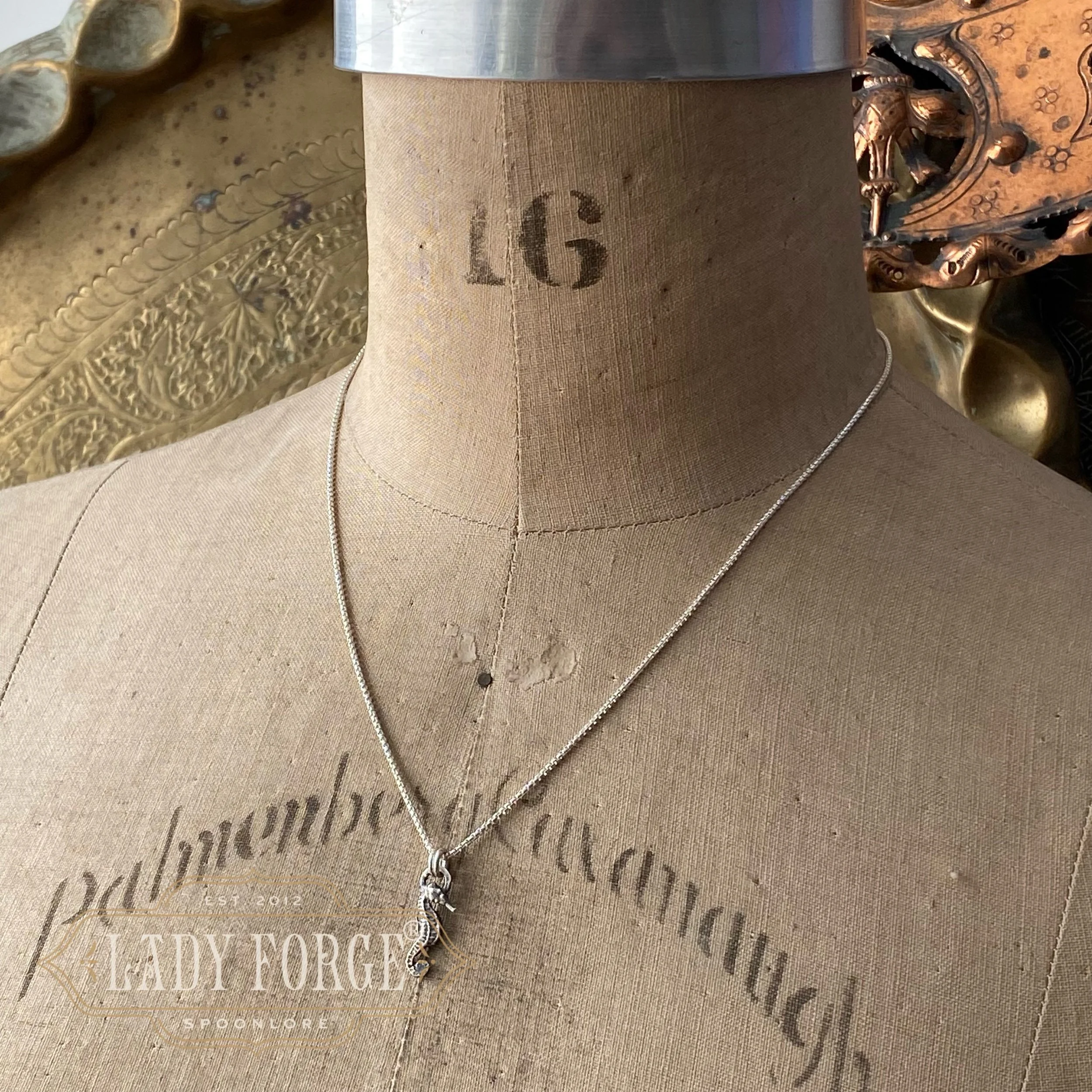 This dainty seahorse necklace was made from a tiny antique sterling silver salt spoon likely designed between 1920–1960