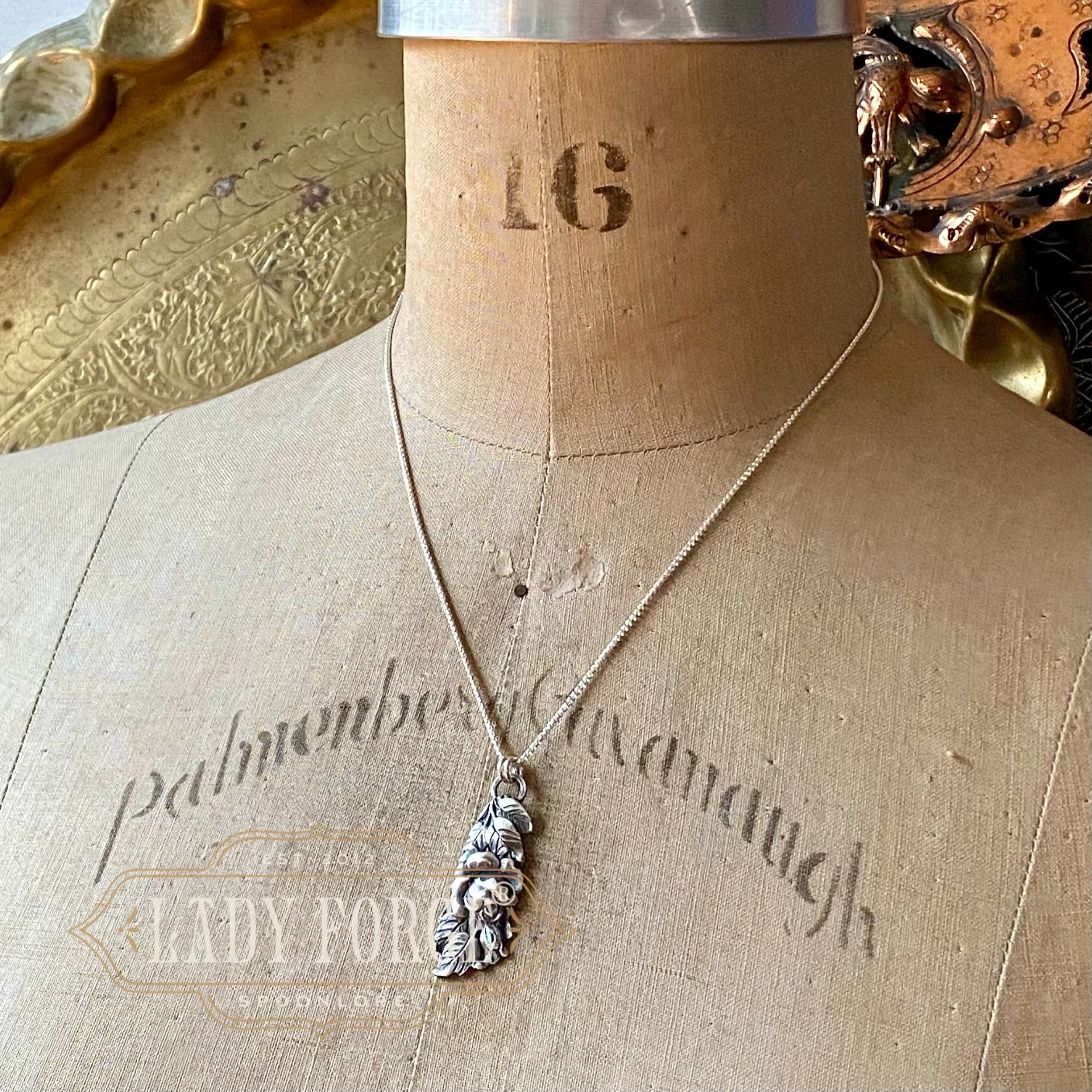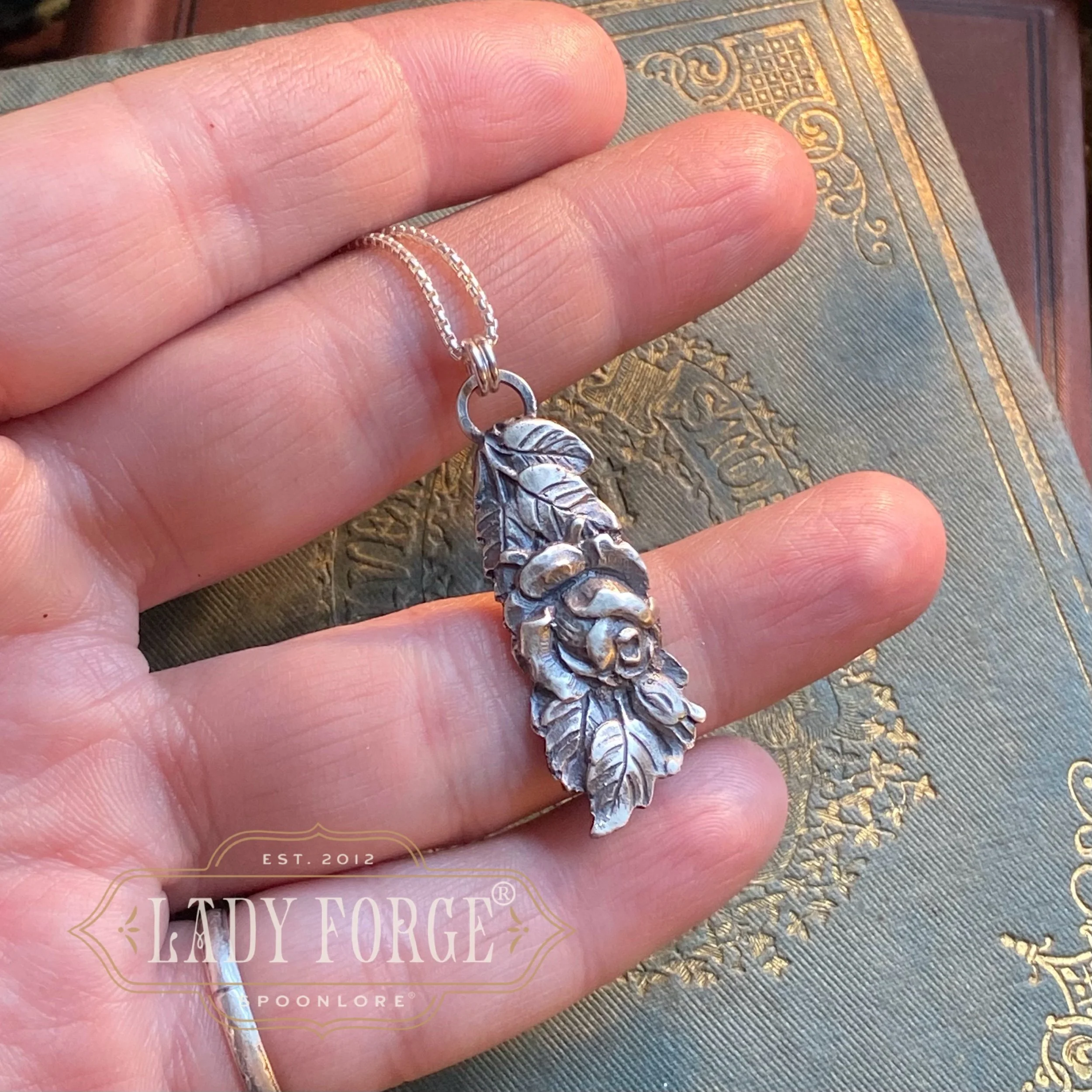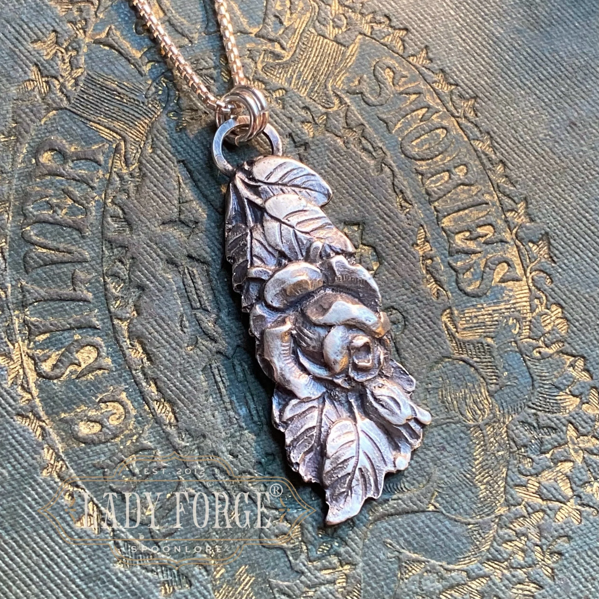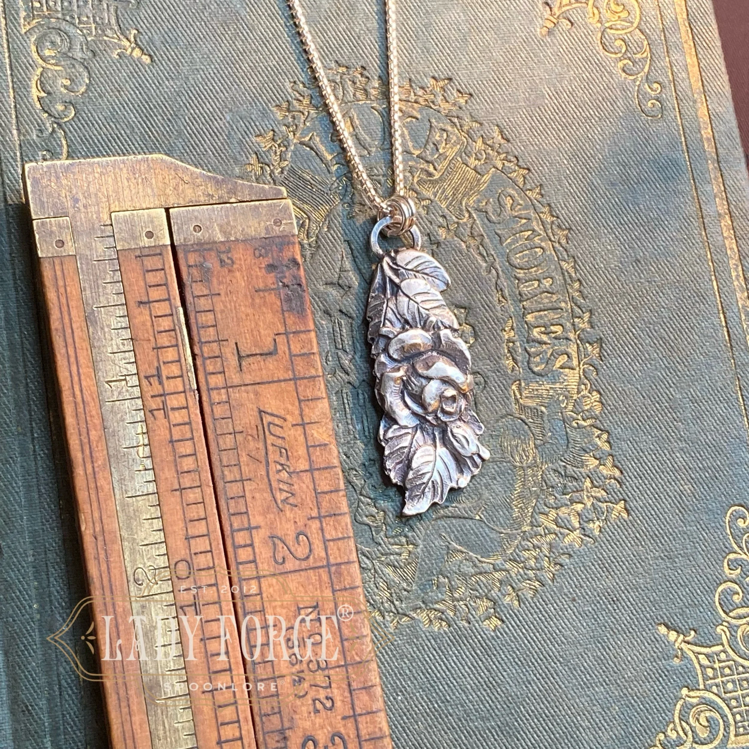 This silver spoon necklace was made from the Hildesheim Rose pattern designed in Germany between 1900-1940.