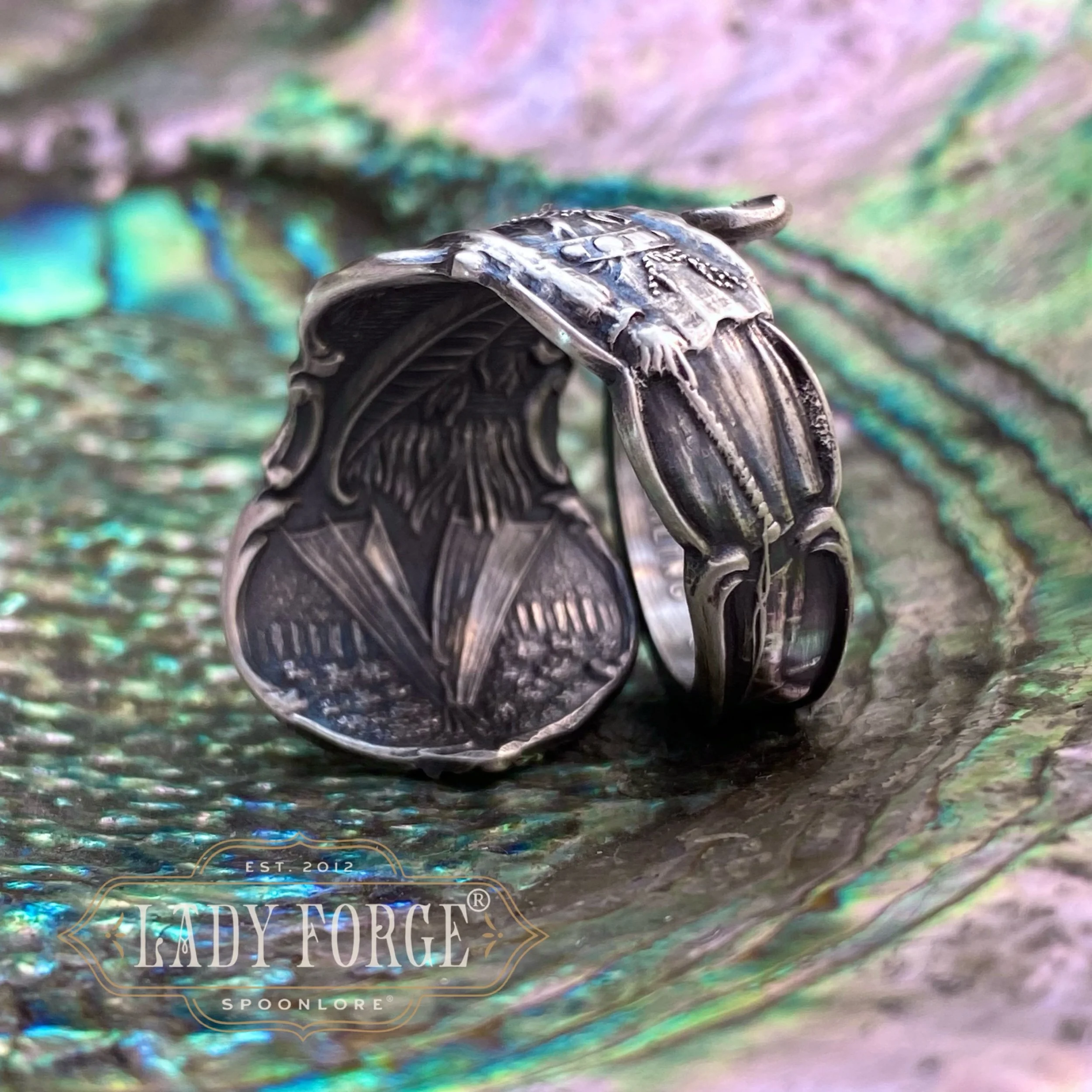 This sterling spoon ring was made from the Arizona pattern designed by the Shepard Co between 1890-1920