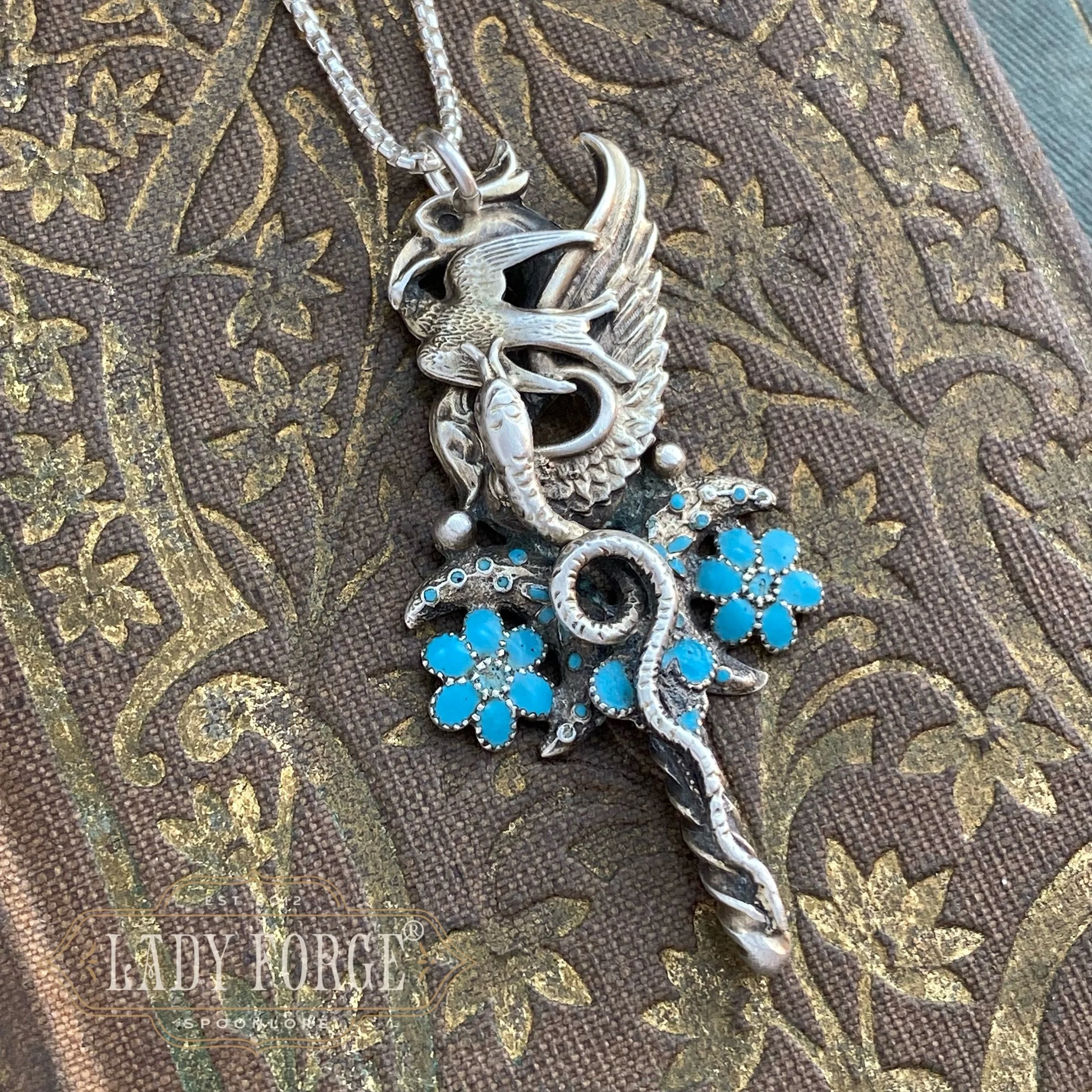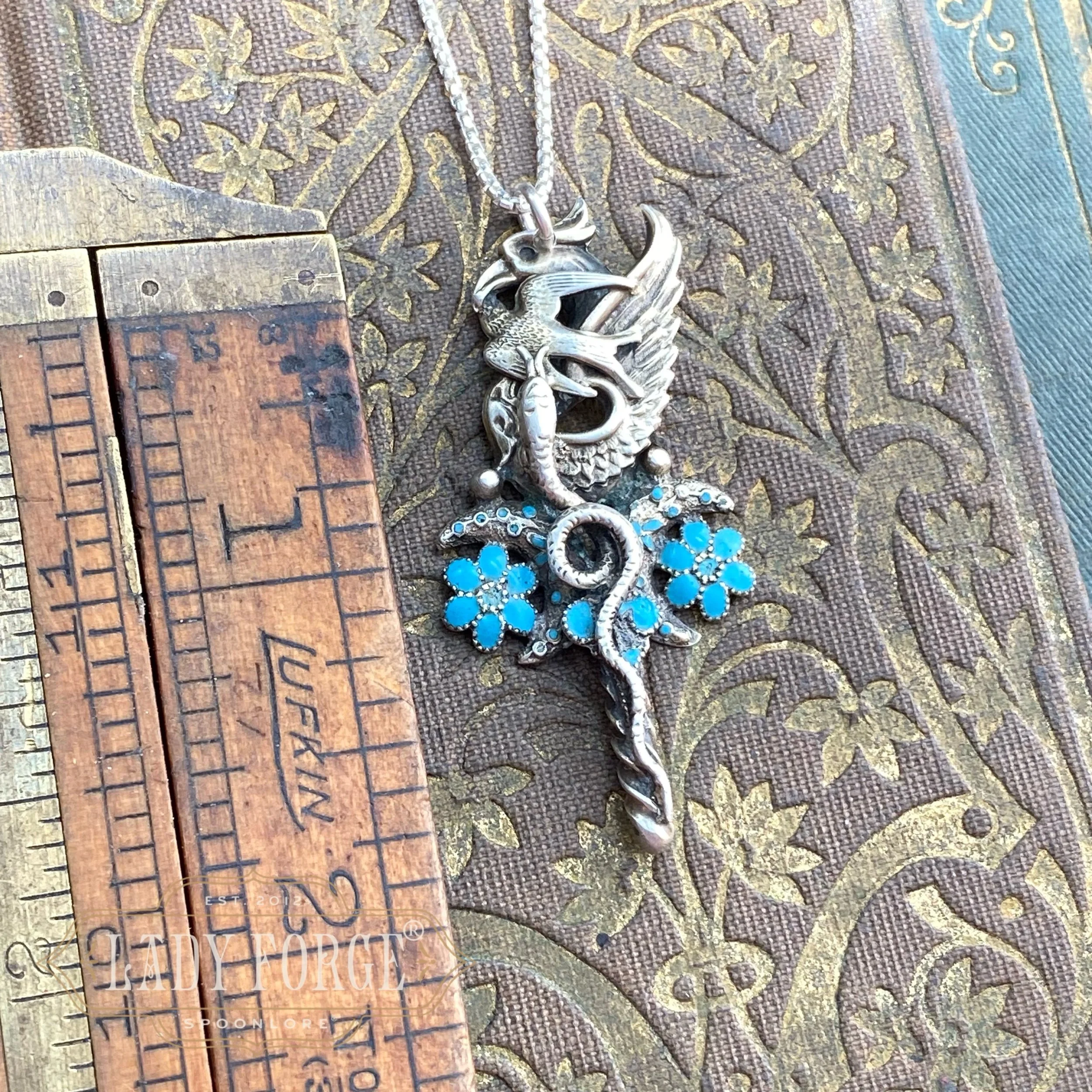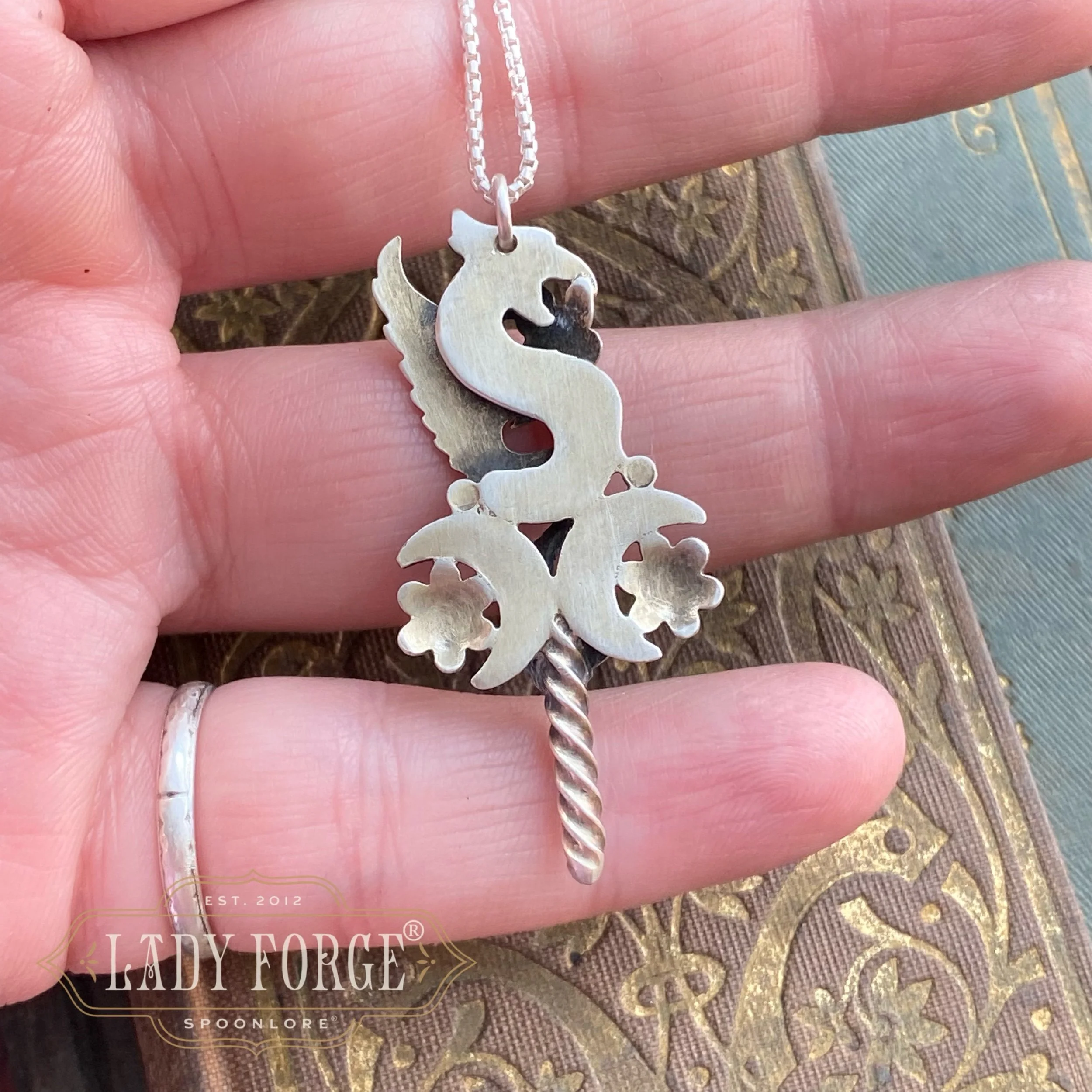This sterling silver necklace was made from the Griffin Swallow & Snake pattern designed by an unknown American maker between 1870–1900.