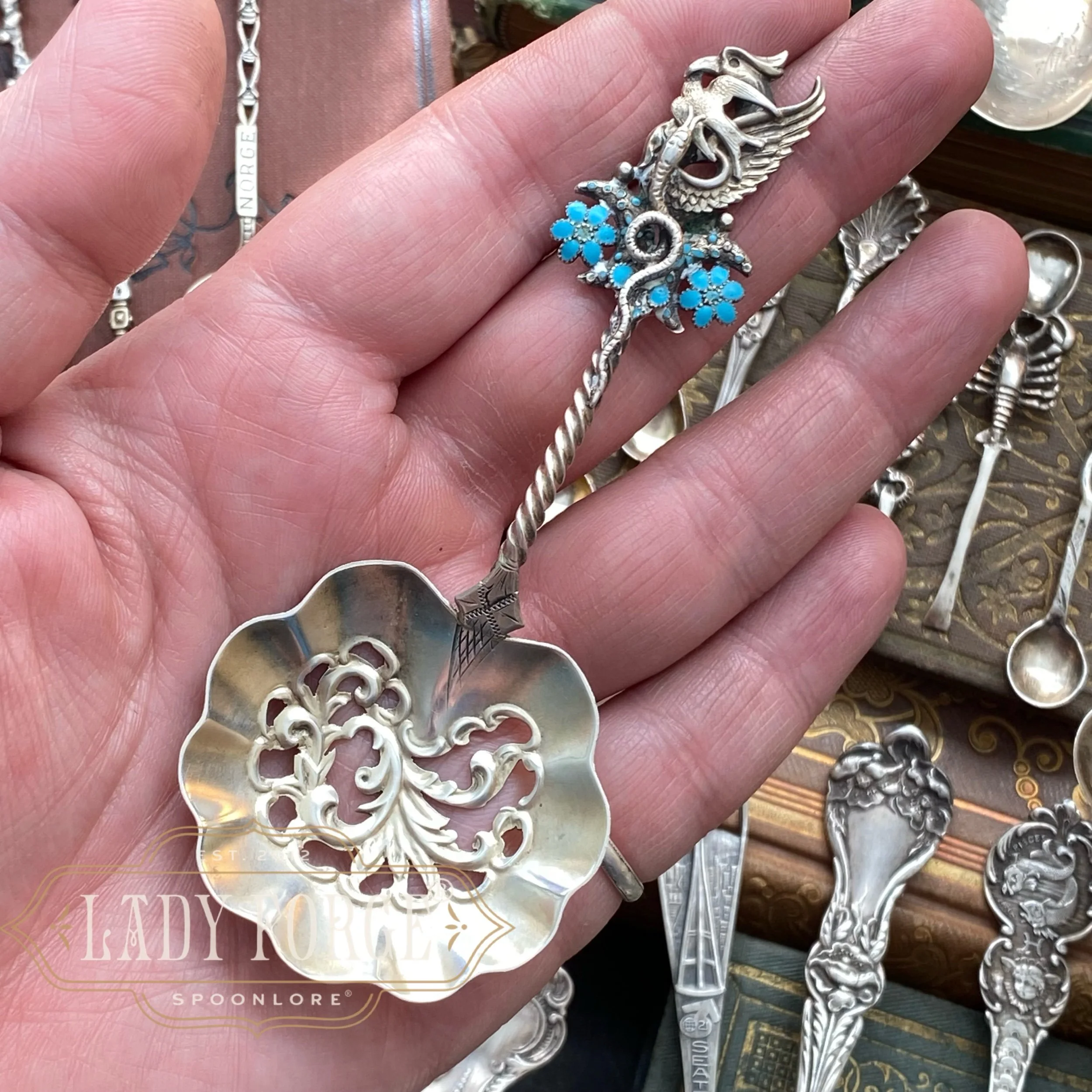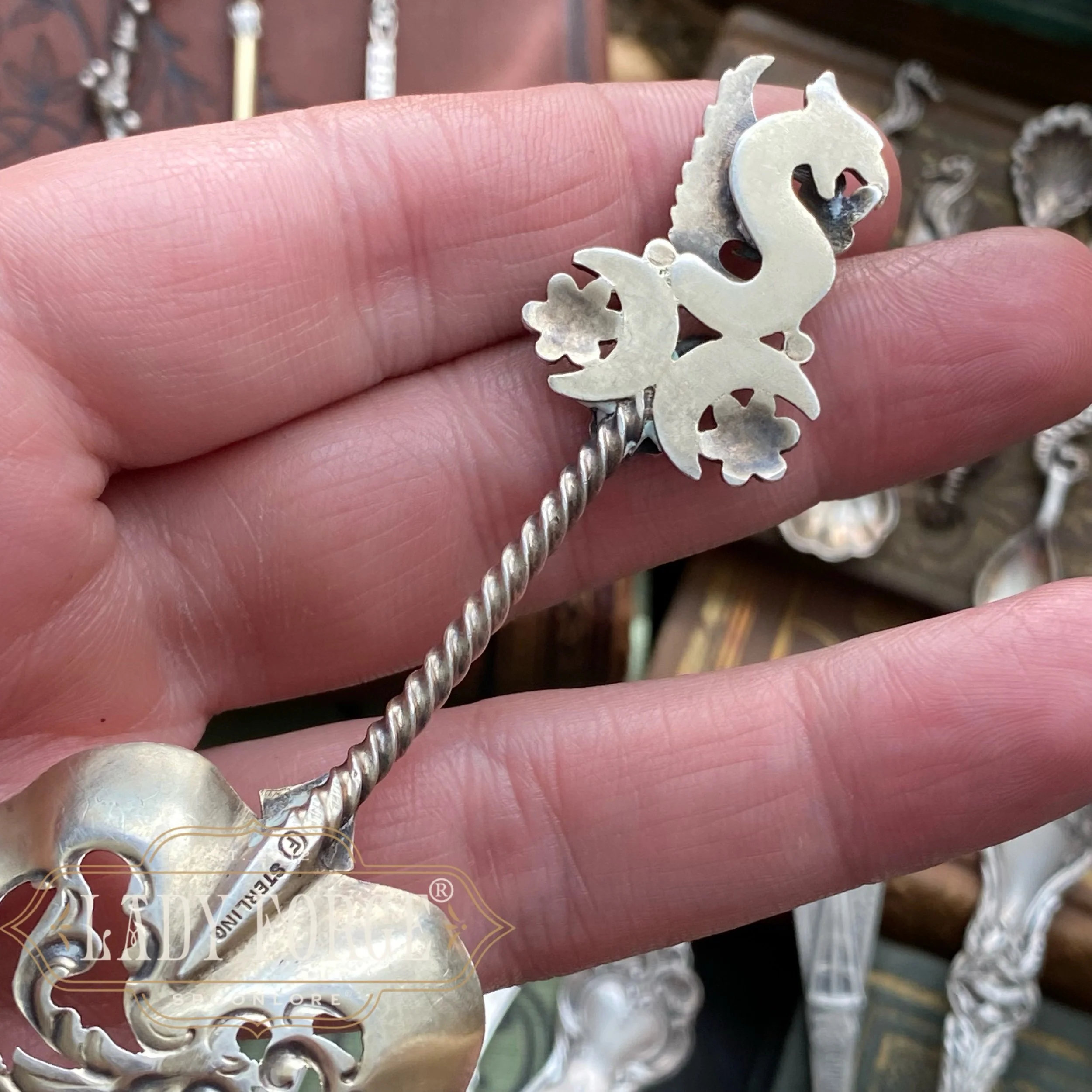 Marked simply Sterling, this late 19th-century spoon reflects the Victorian fascination with symbolism and storytelling in decorative arts. Its design brings together a collection of meaningful elements, each chosen with intention.