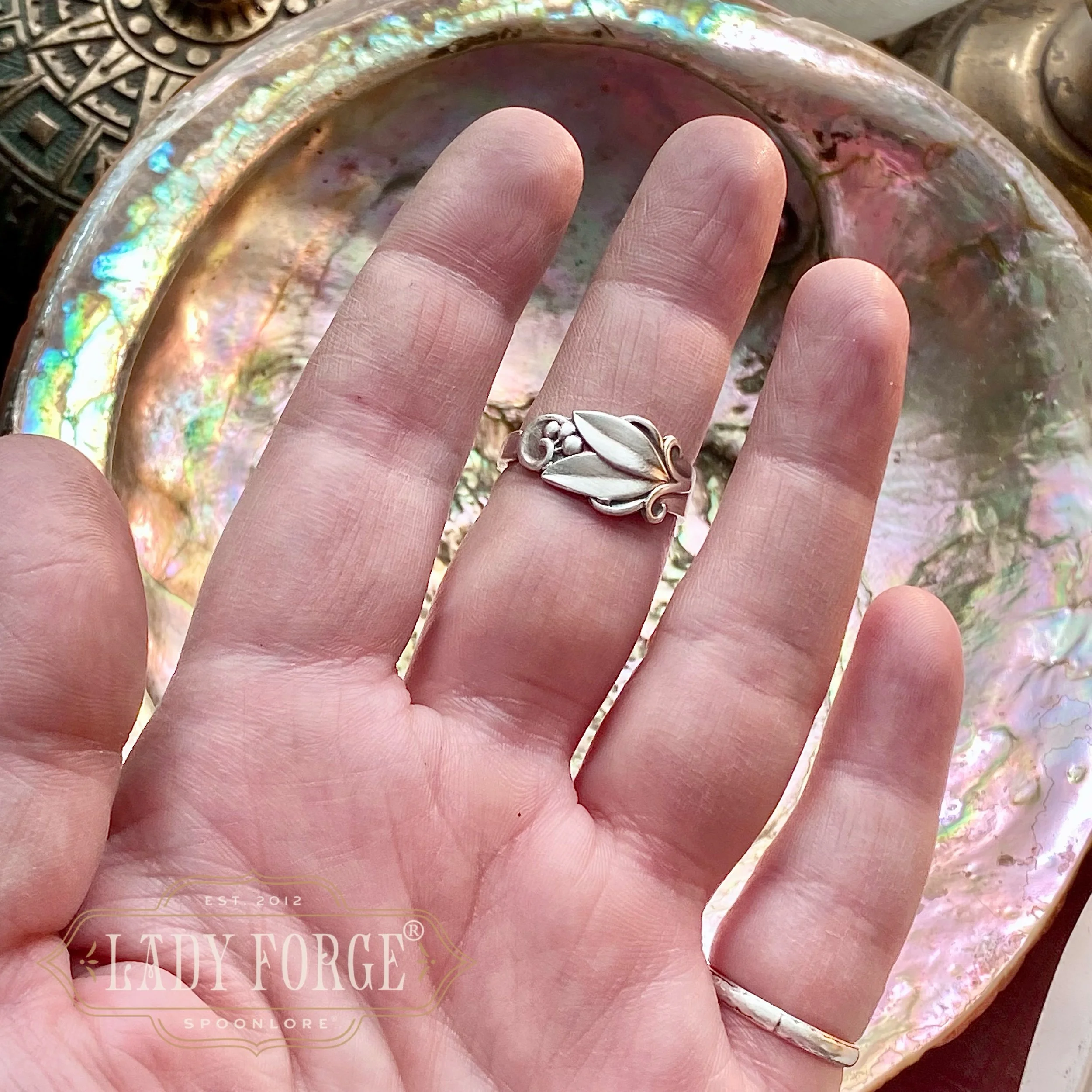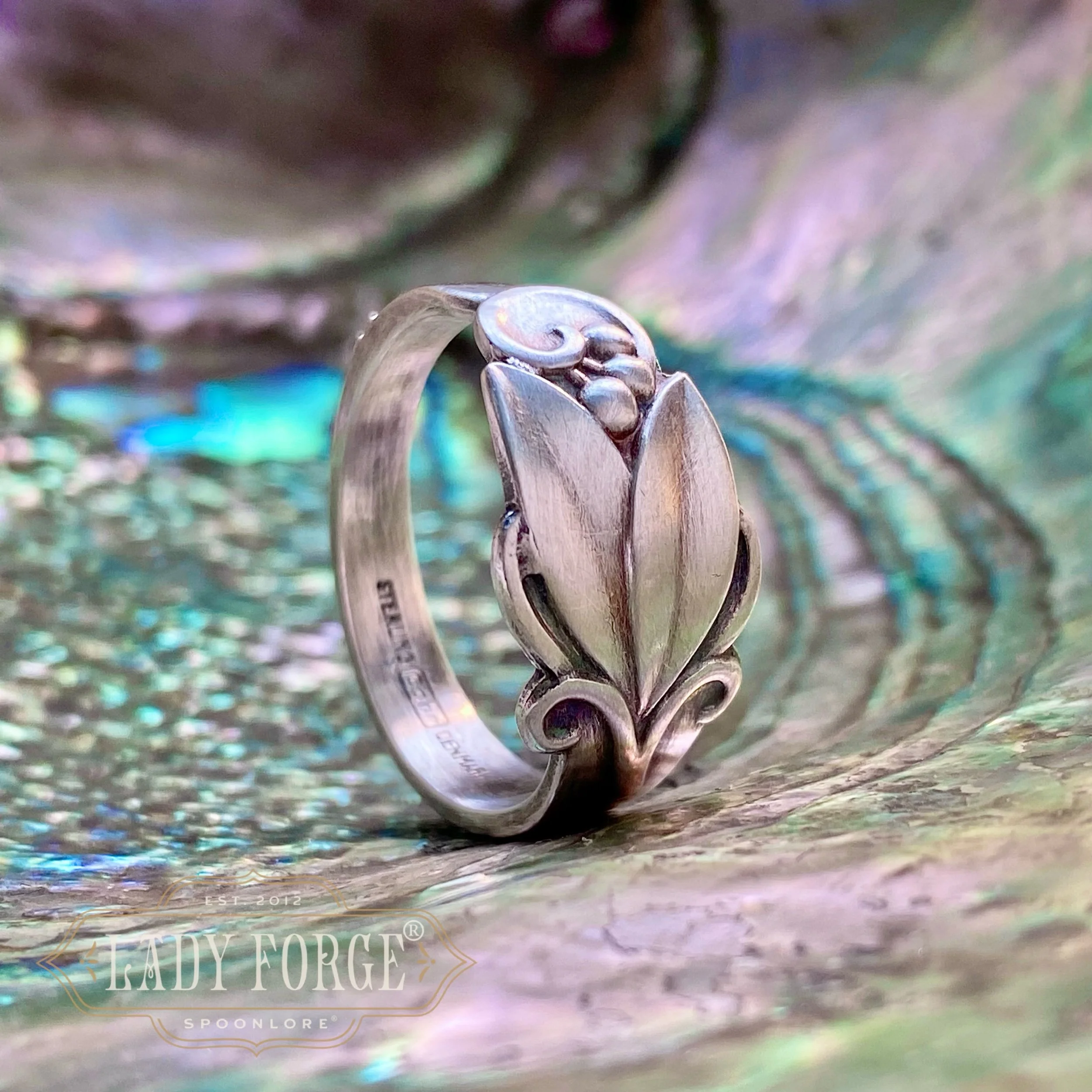 This sterling spoon ring was made from a floral pattern designed by Carl M. Cohr of Denmark between 1910-1950