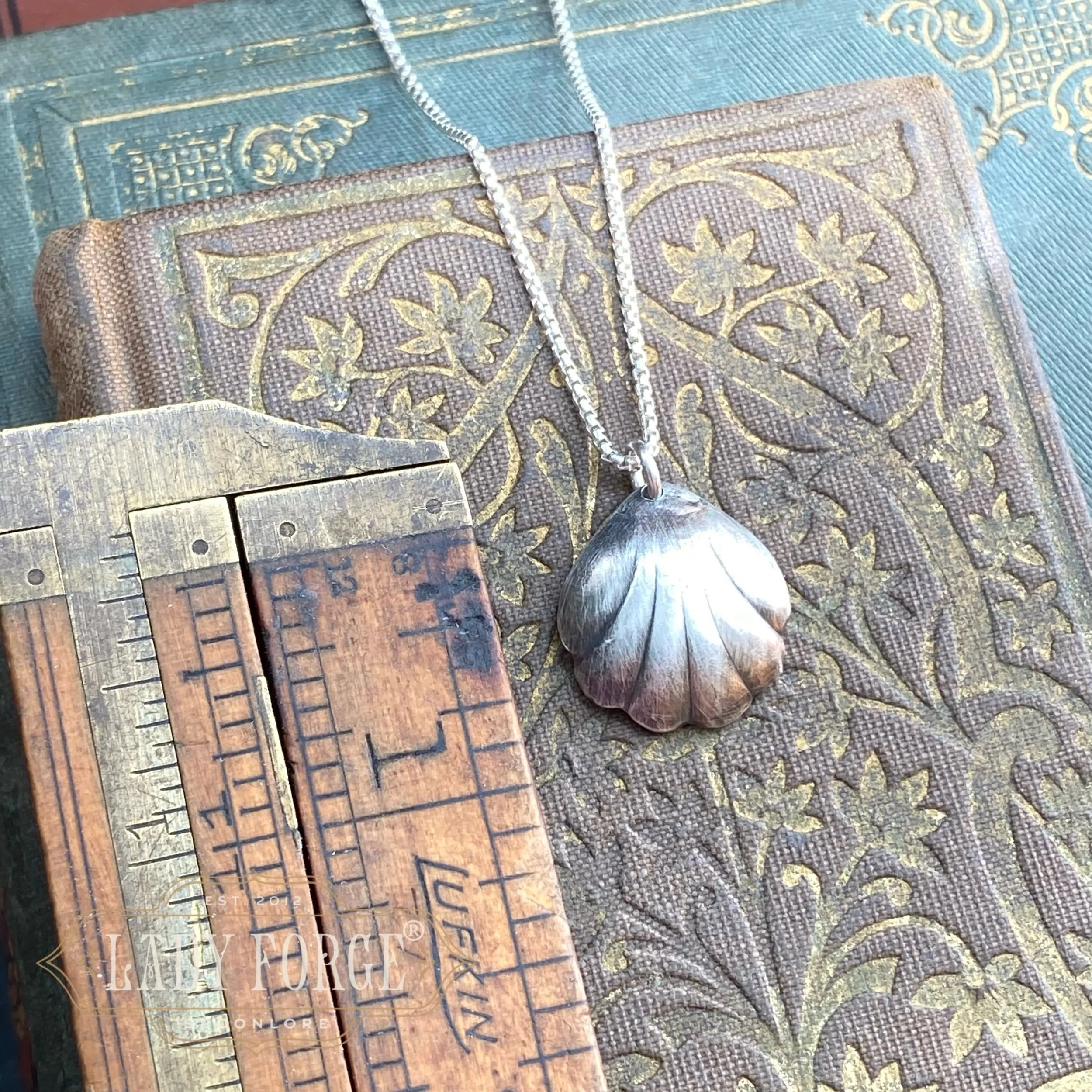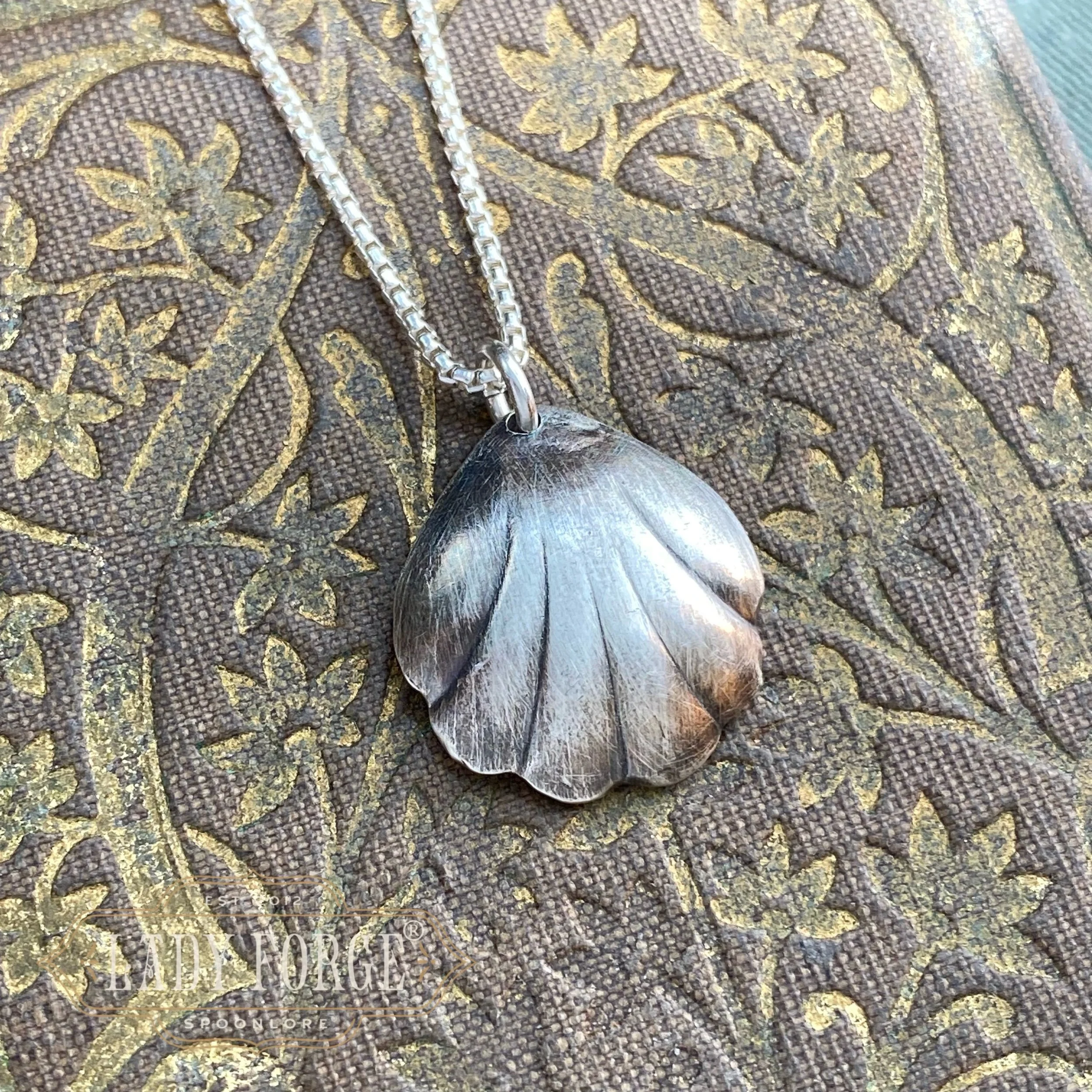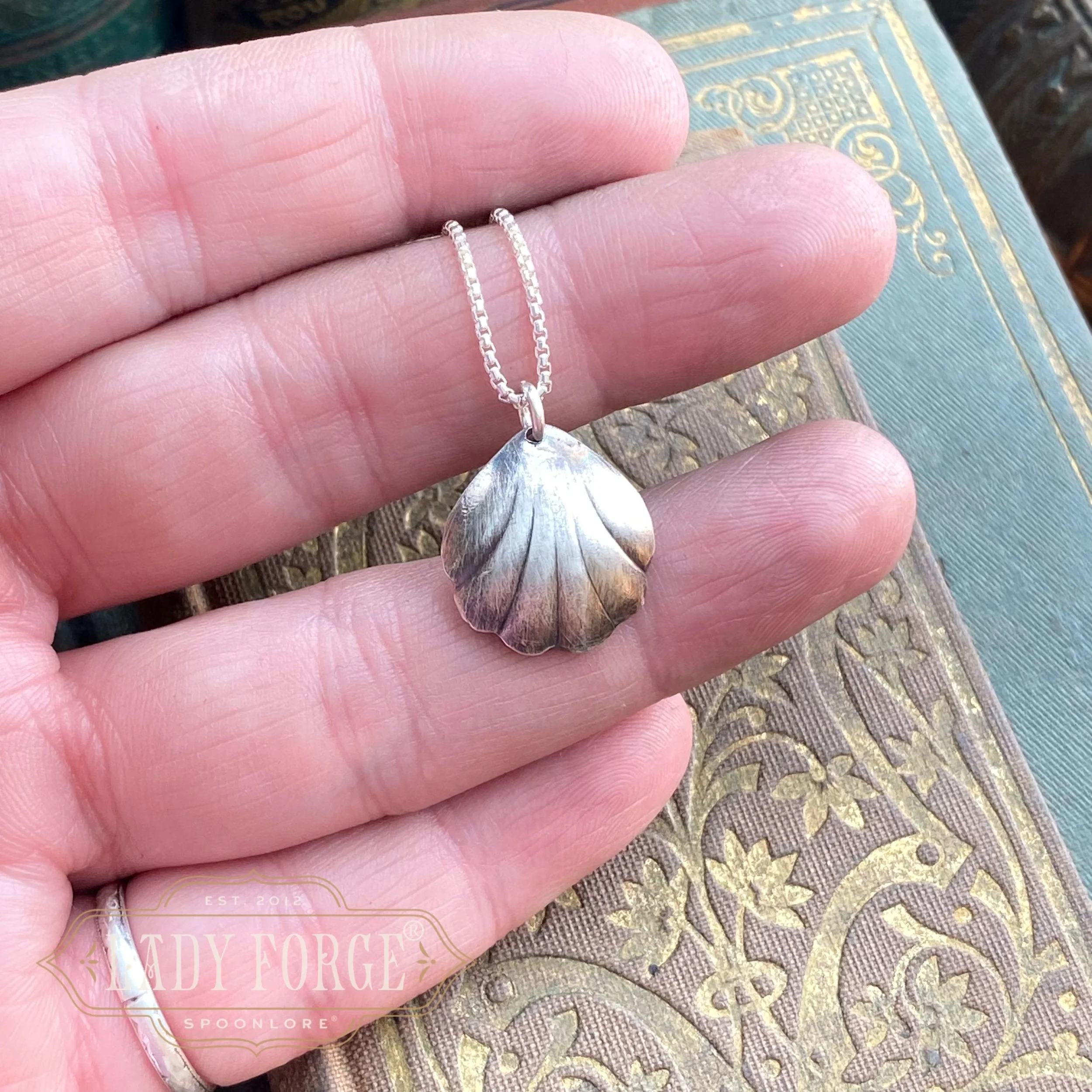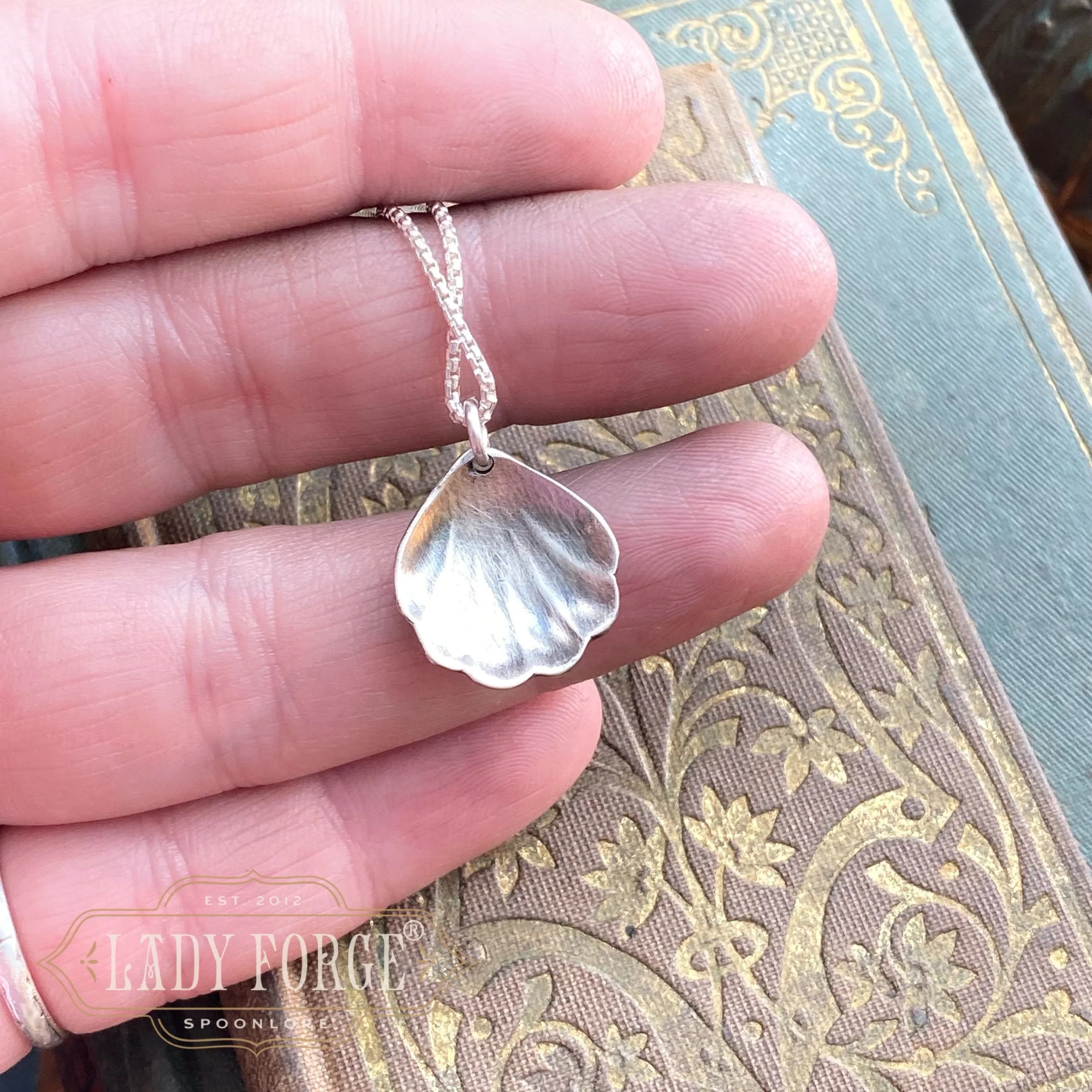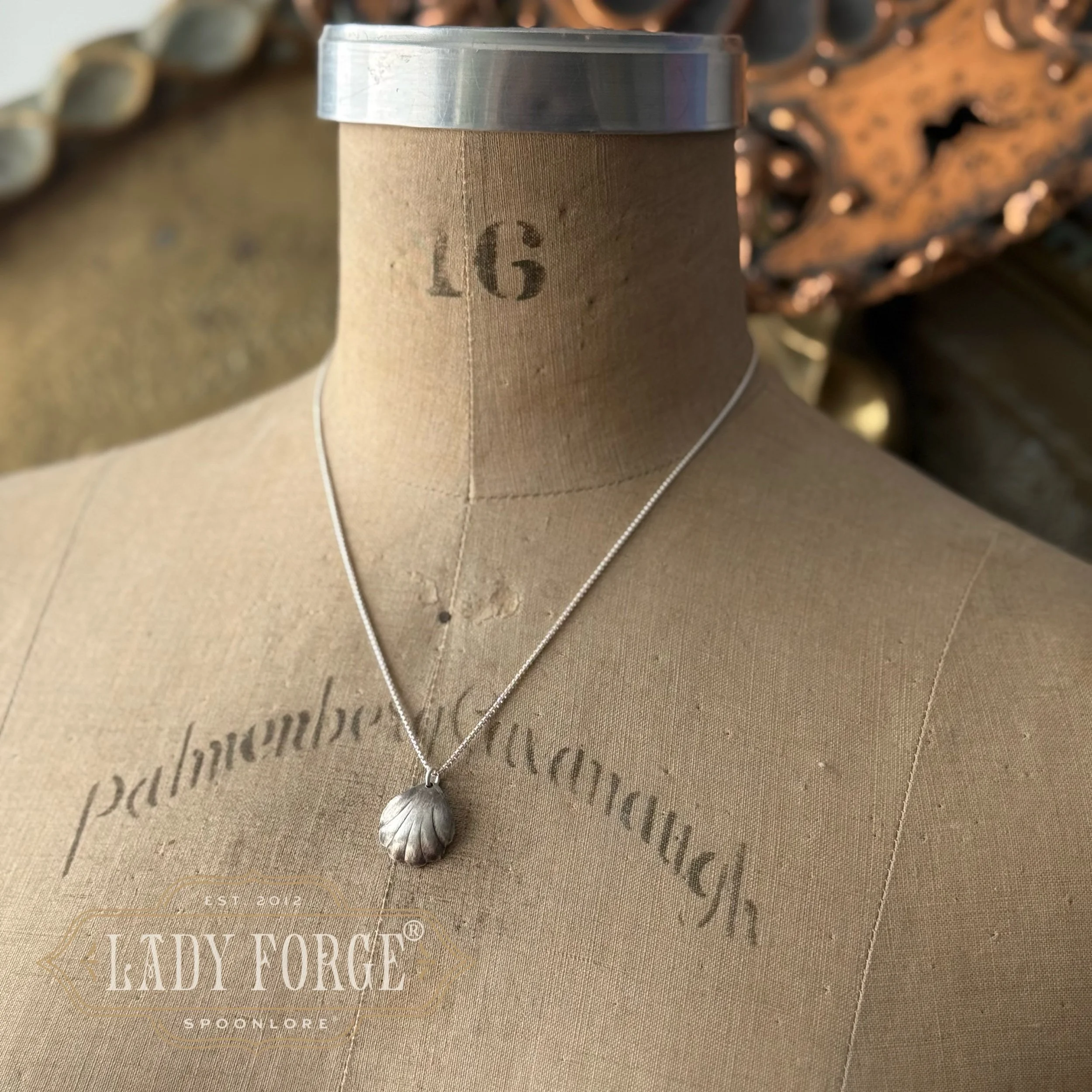 This sea shell necklace was made from a tiny antique sterling silver salt spoon likely designed between 1920–1960