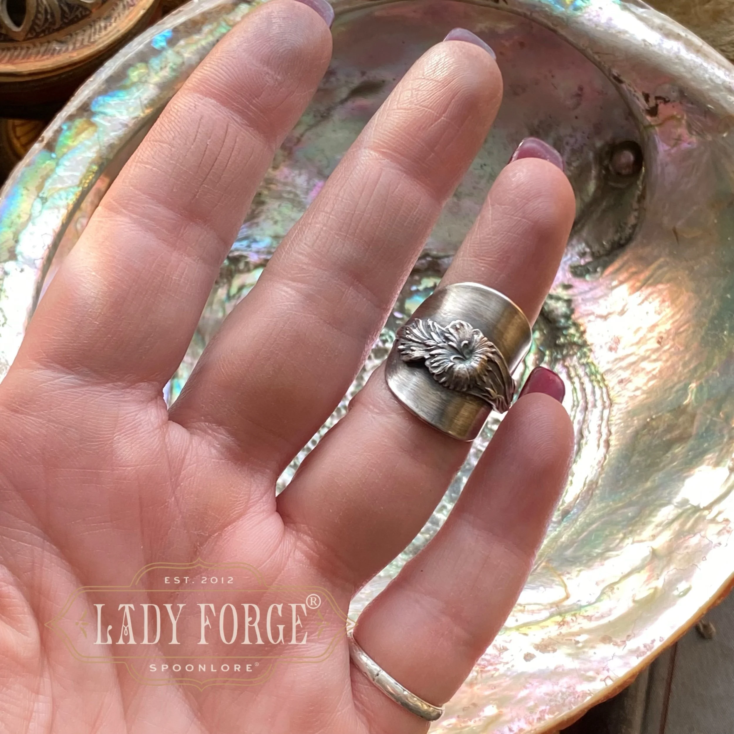 This sterling Dianthus spoon ring was made from the Floral series designed by the Watson Co. in 1903