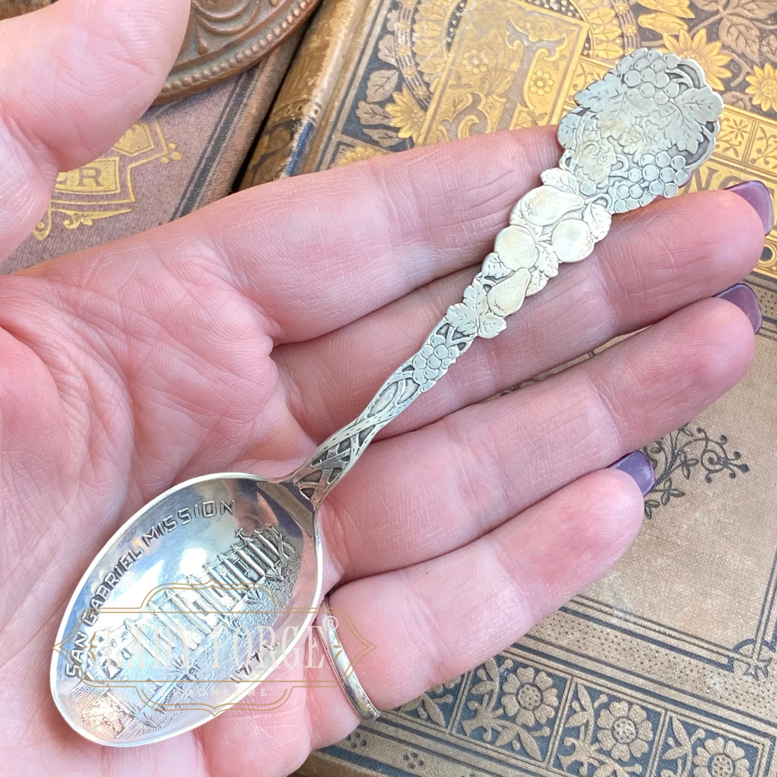This sterling spoon ring was made from the Fruit pattern designed by the Paye & Baker Co. between 1900-1915
