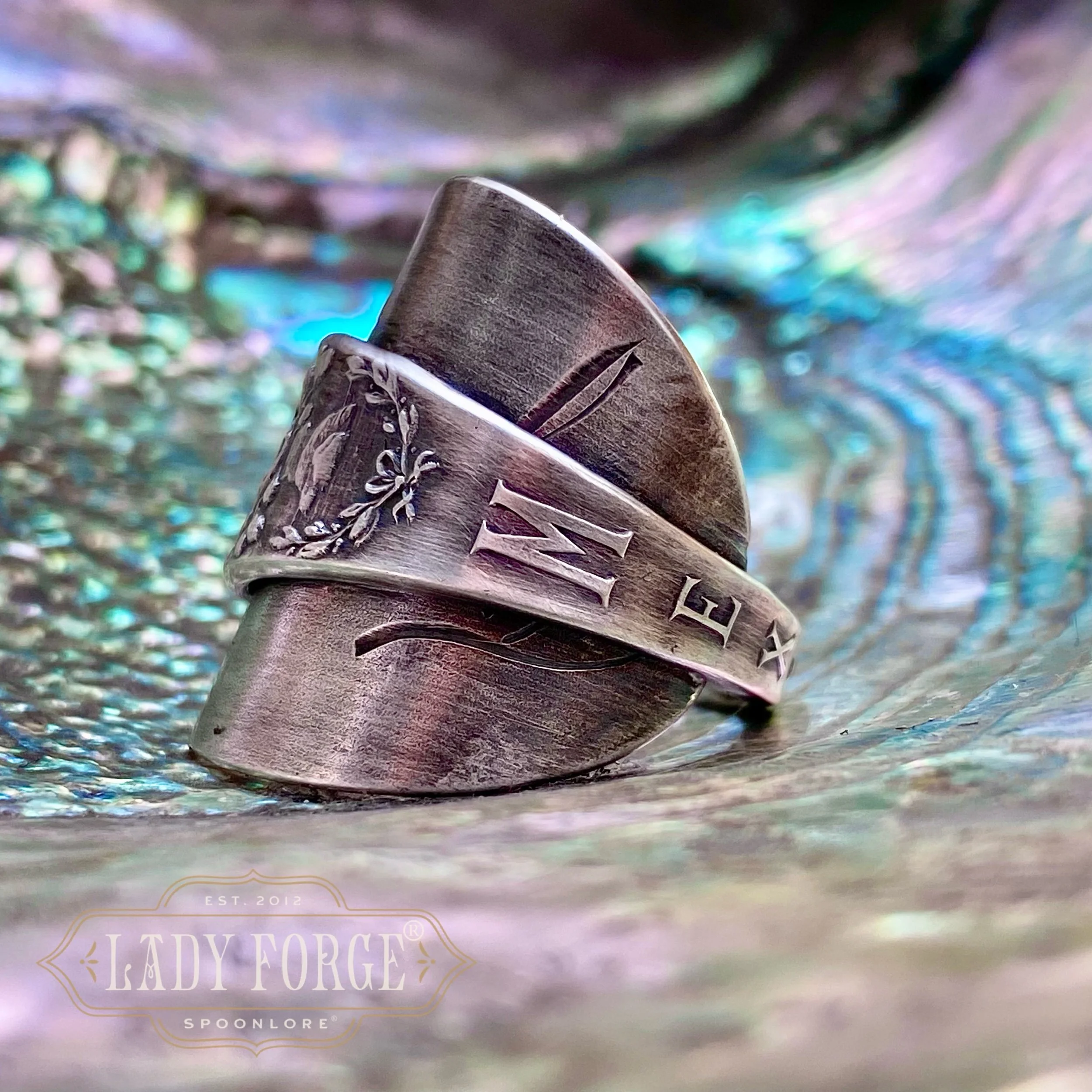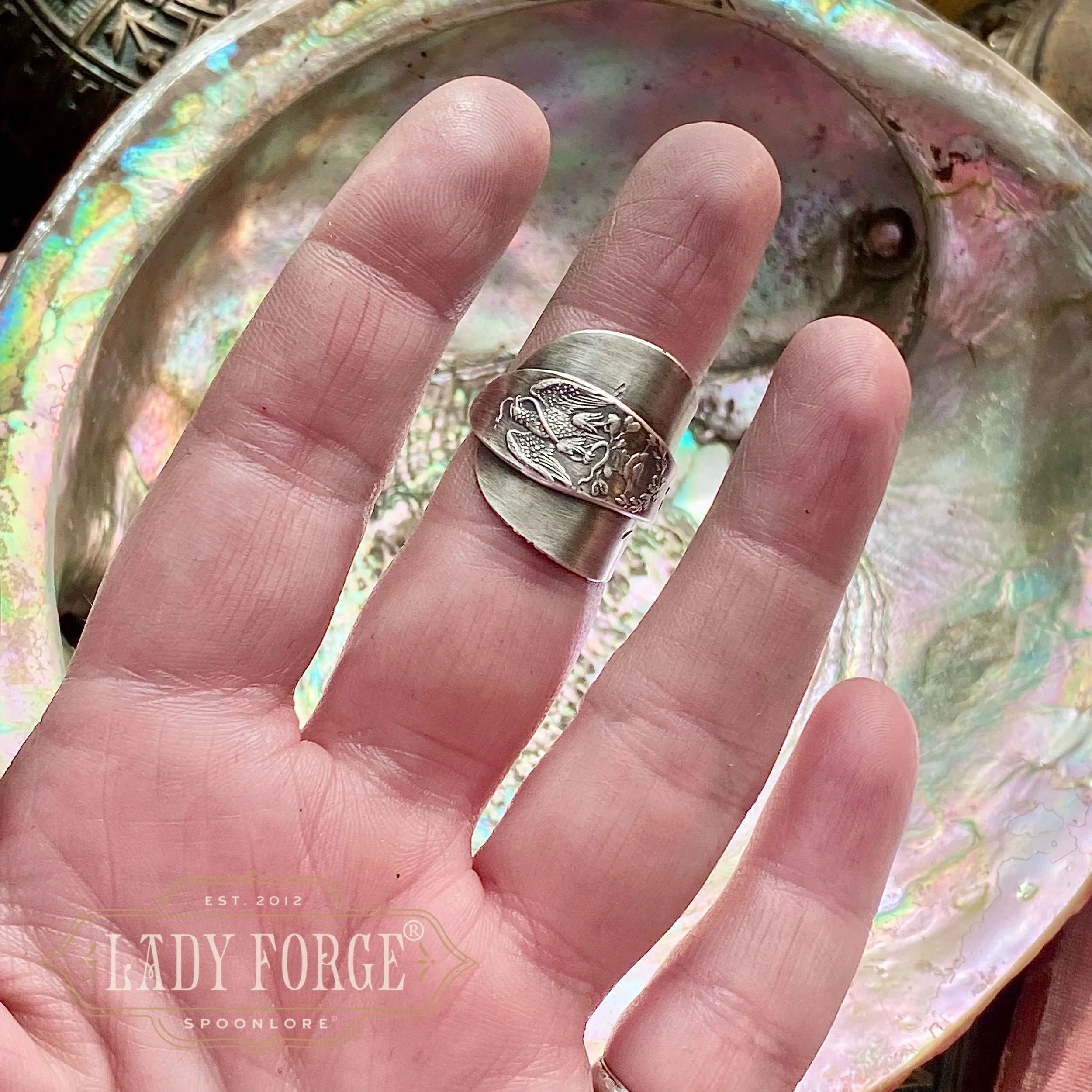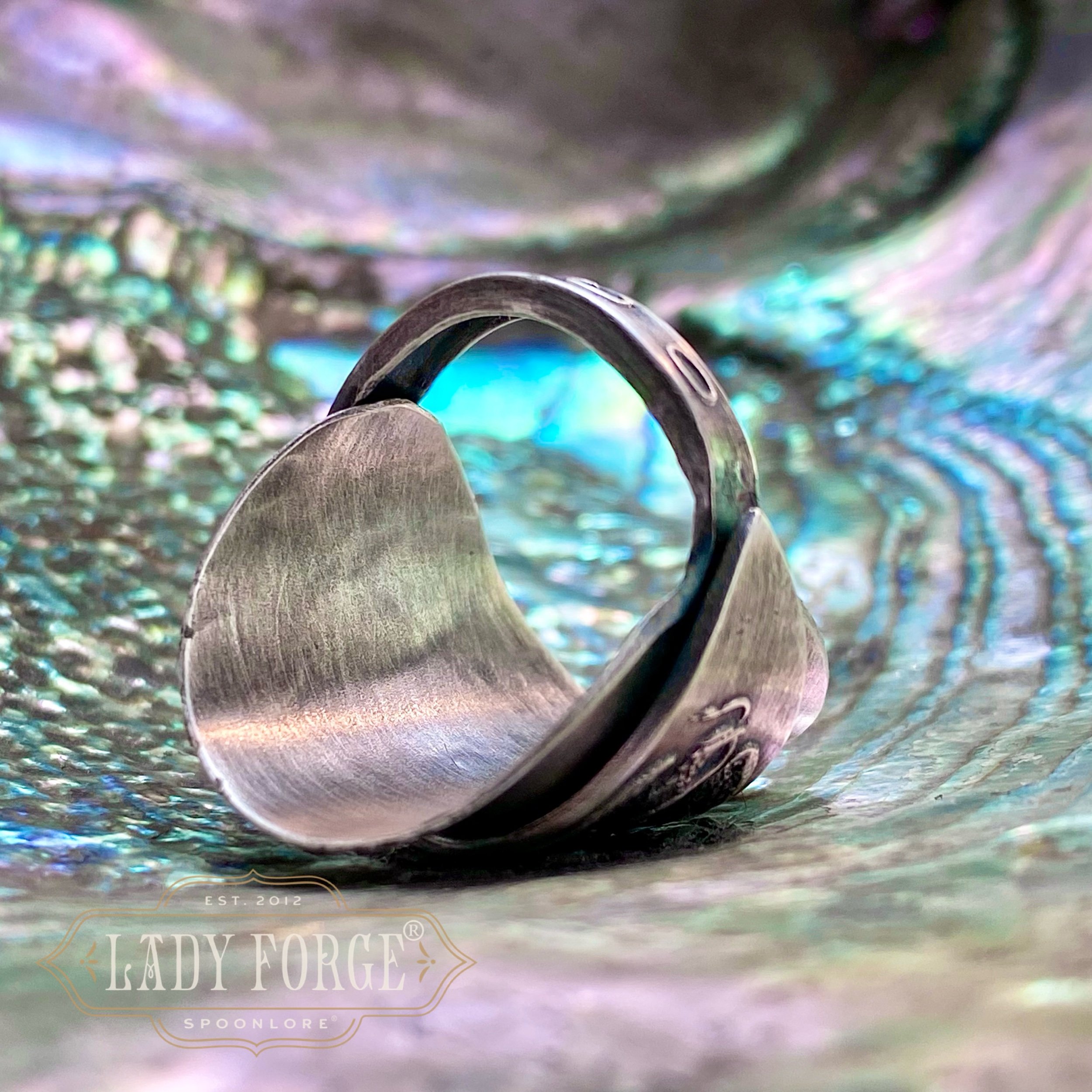 This sterling spoon ring was made from the Mexico pattern designed by the Manchester Co between 1890-1920