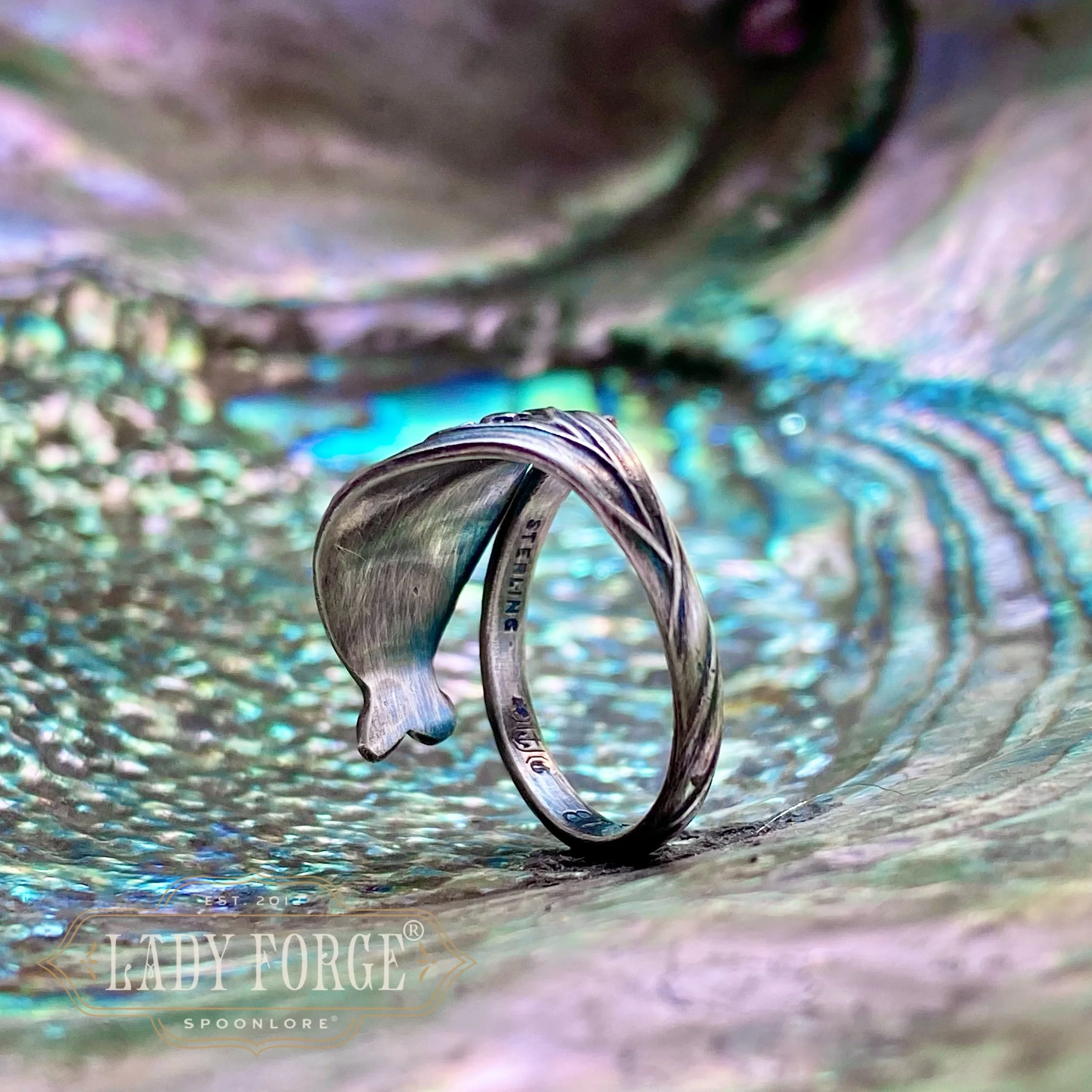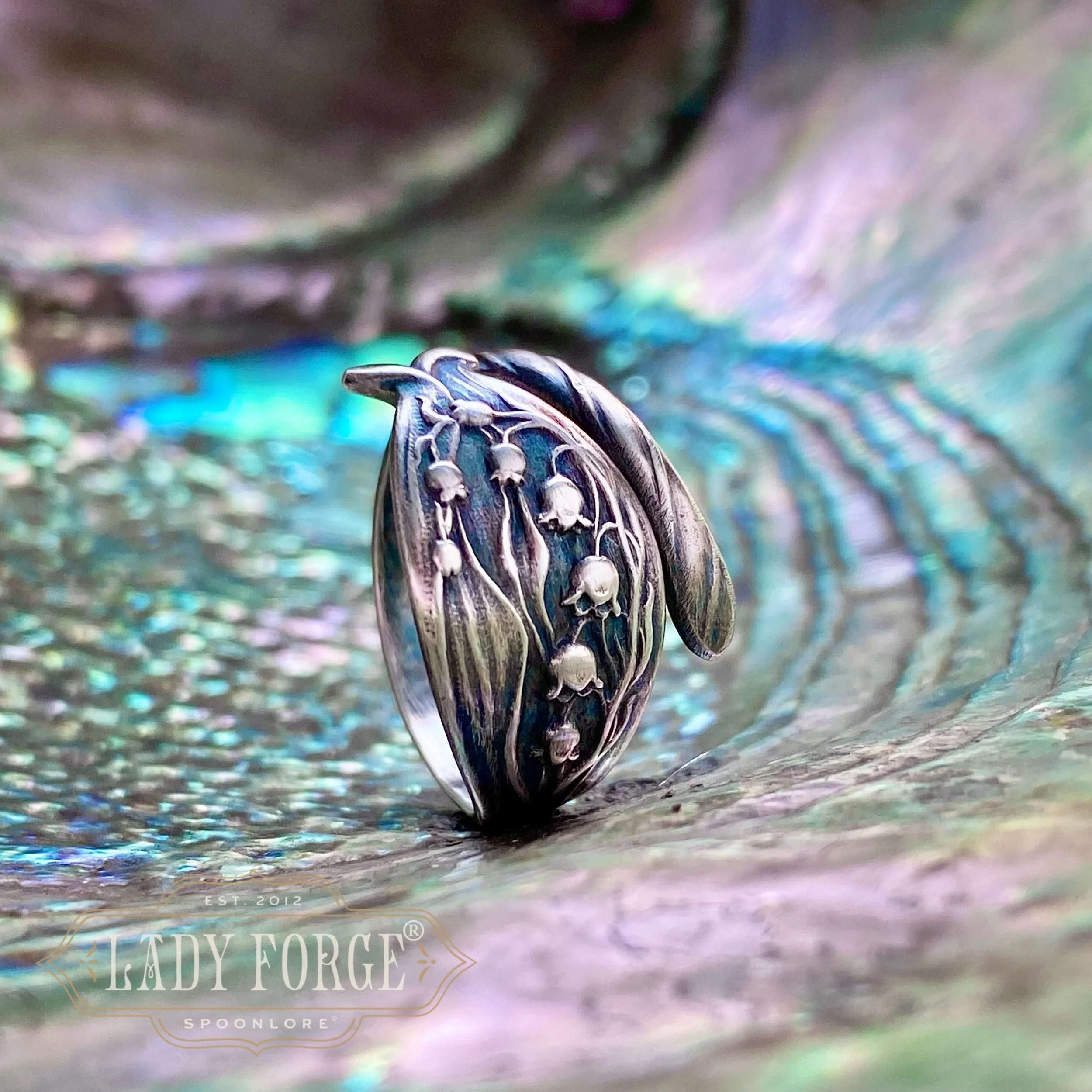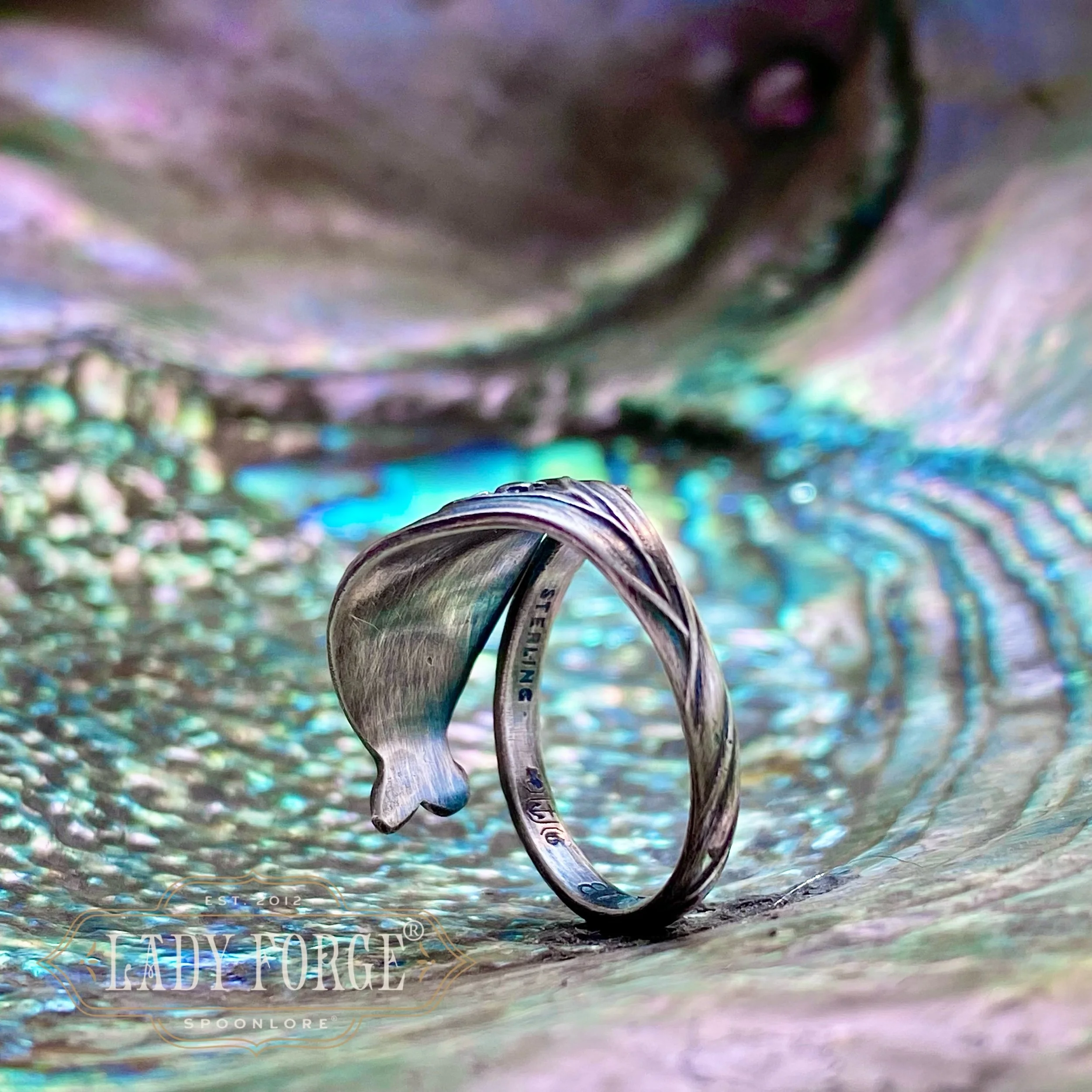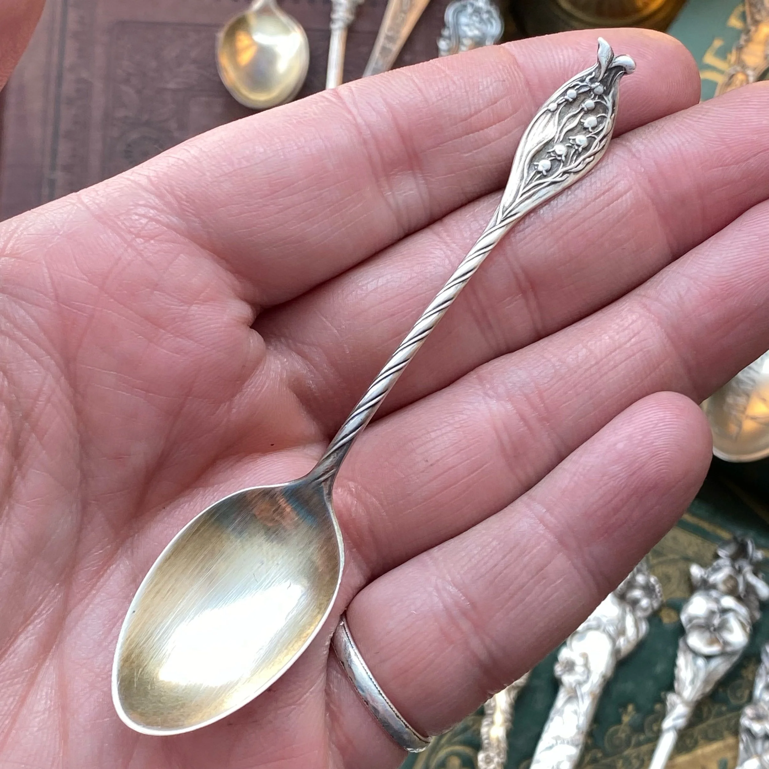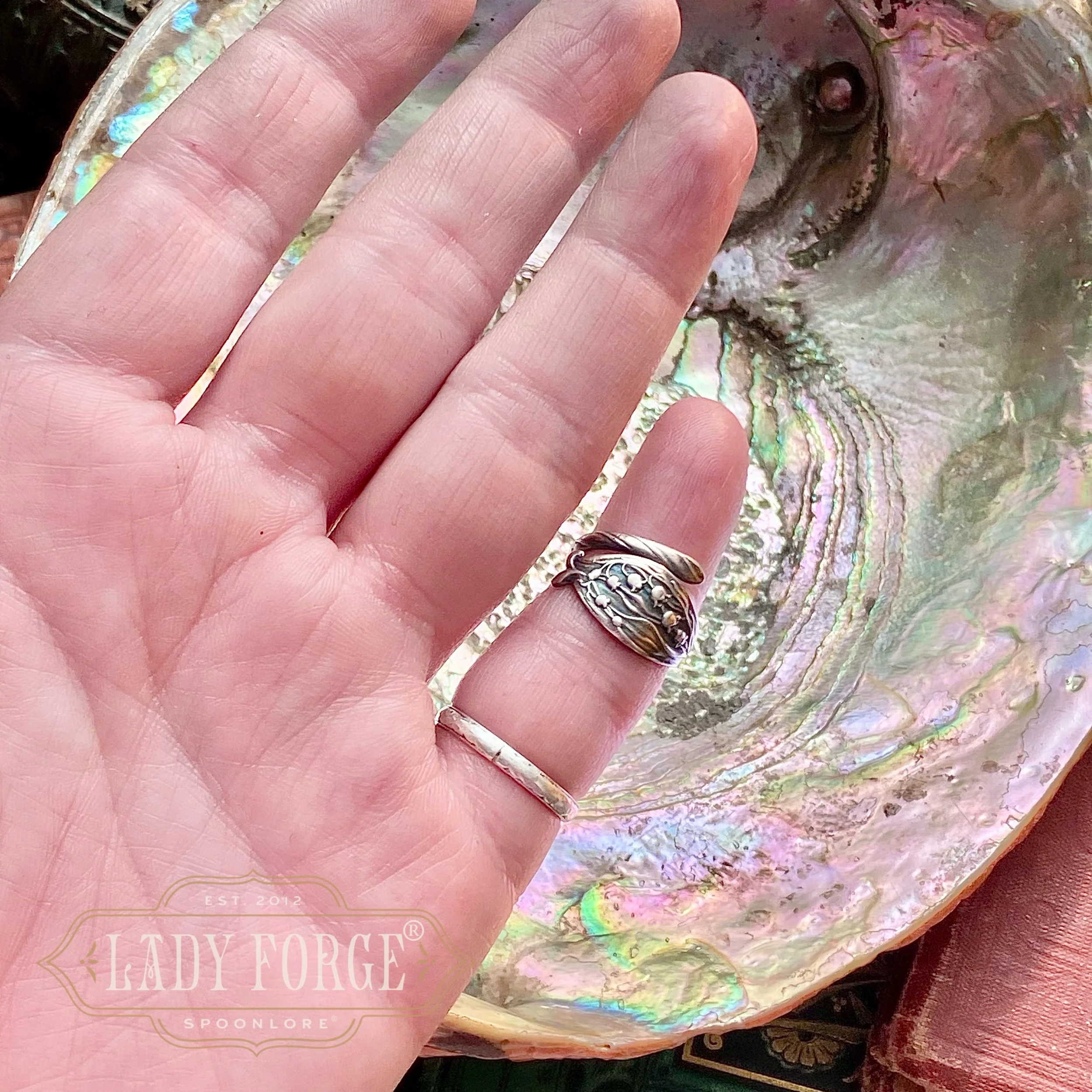 This sterling spoon ring was made from the No. 877 Lily of the Valley pattern designed by the Gorham Co in the 1880s