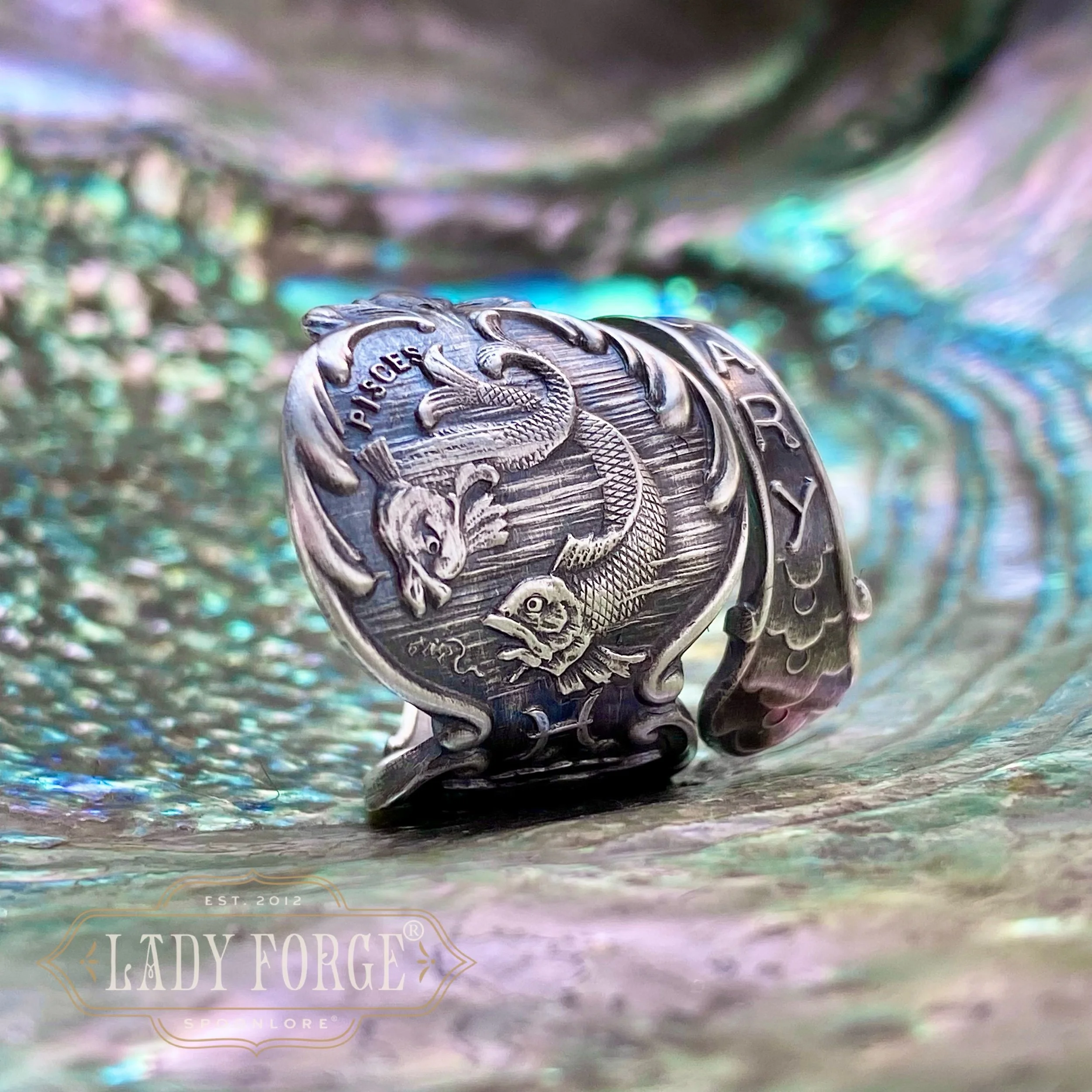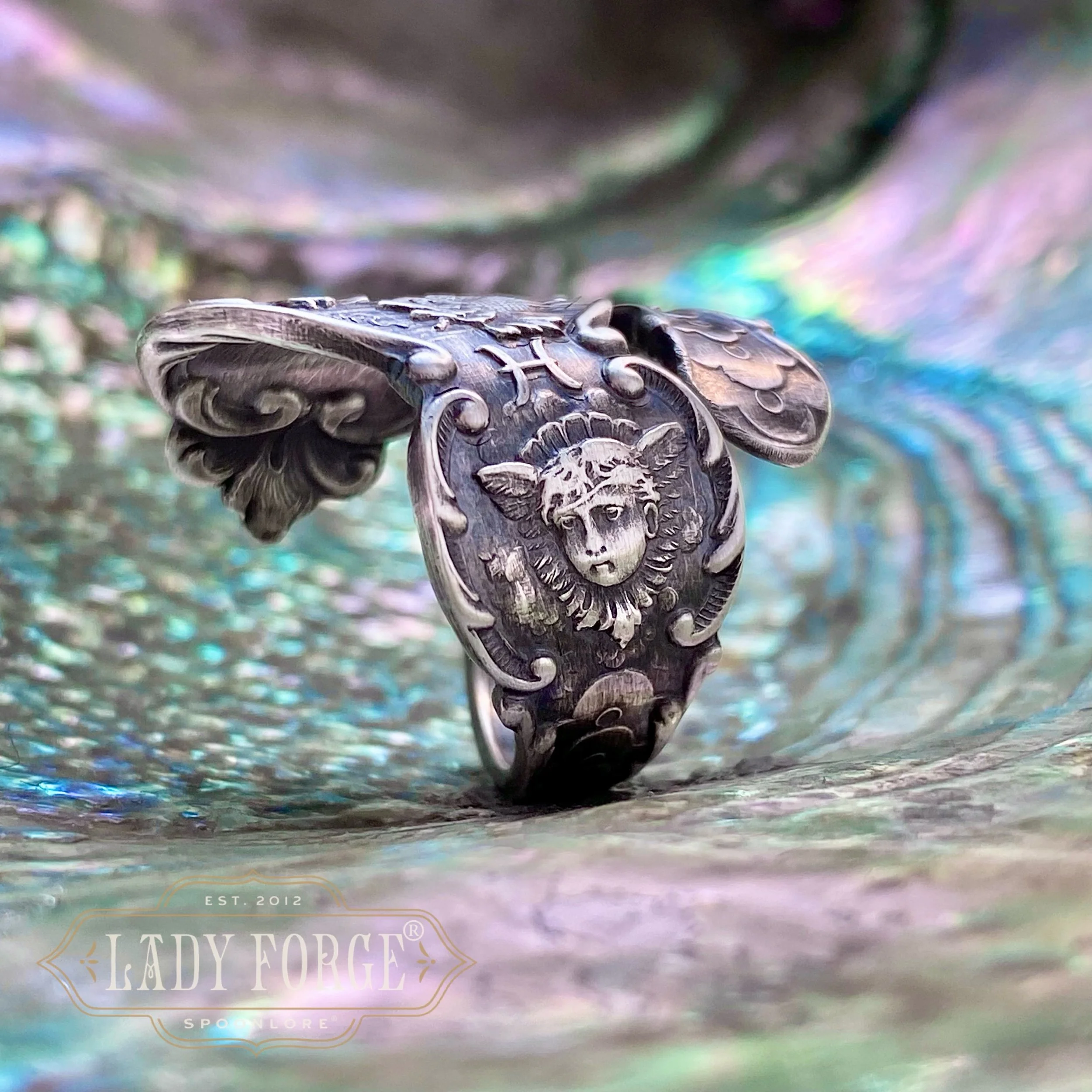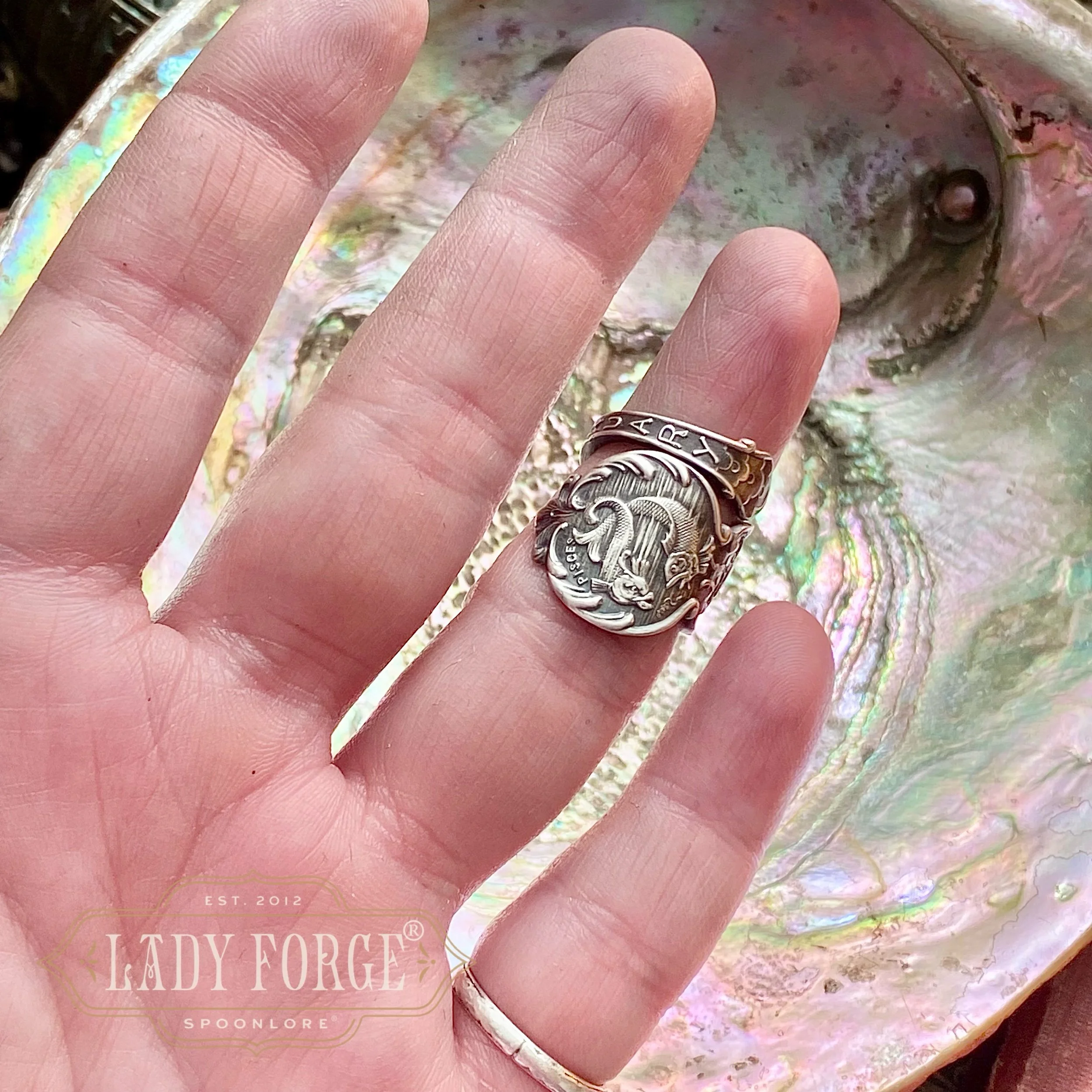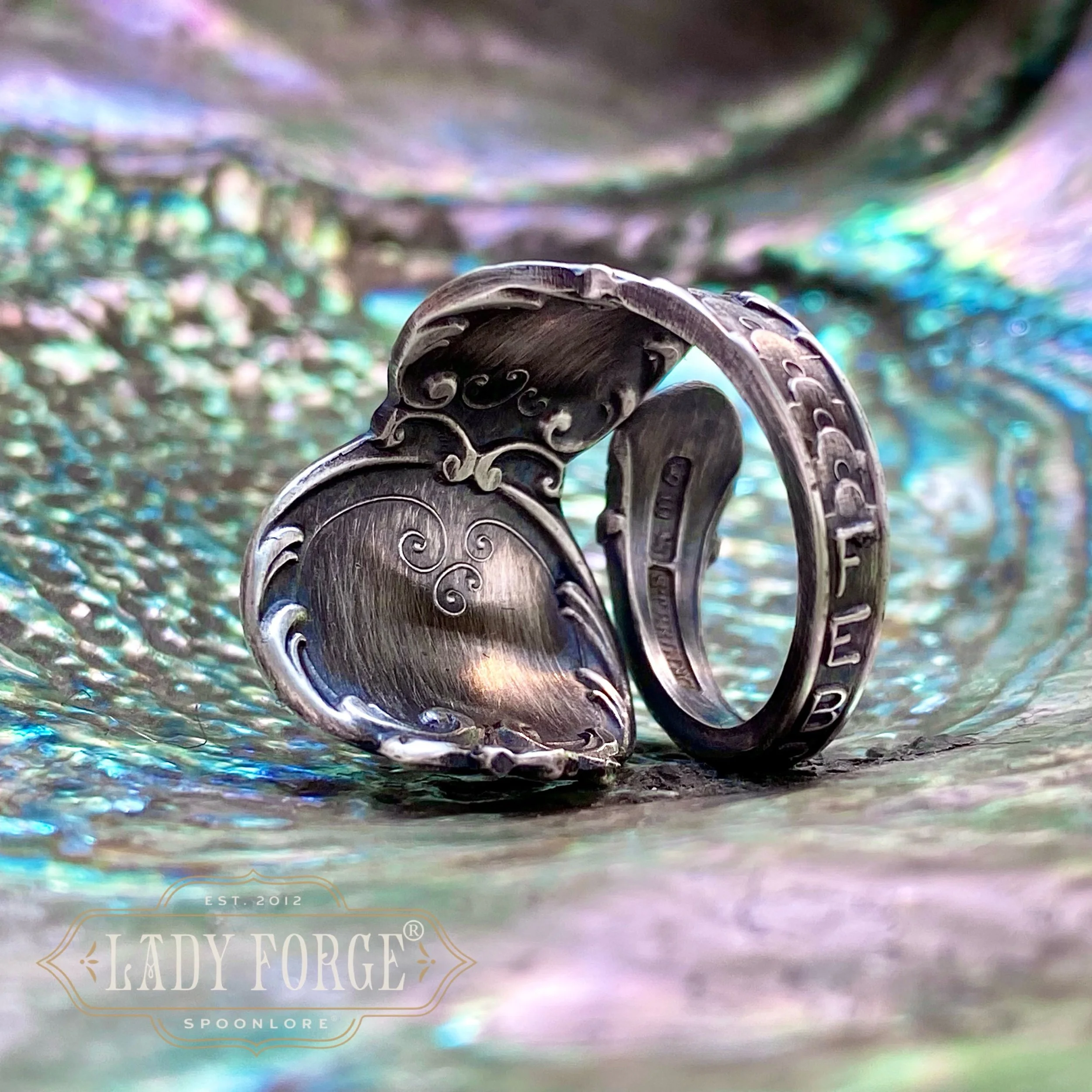 This sterling spoon ring was made from the Pieces pattern designed by the Watson Co between 1890-1910
