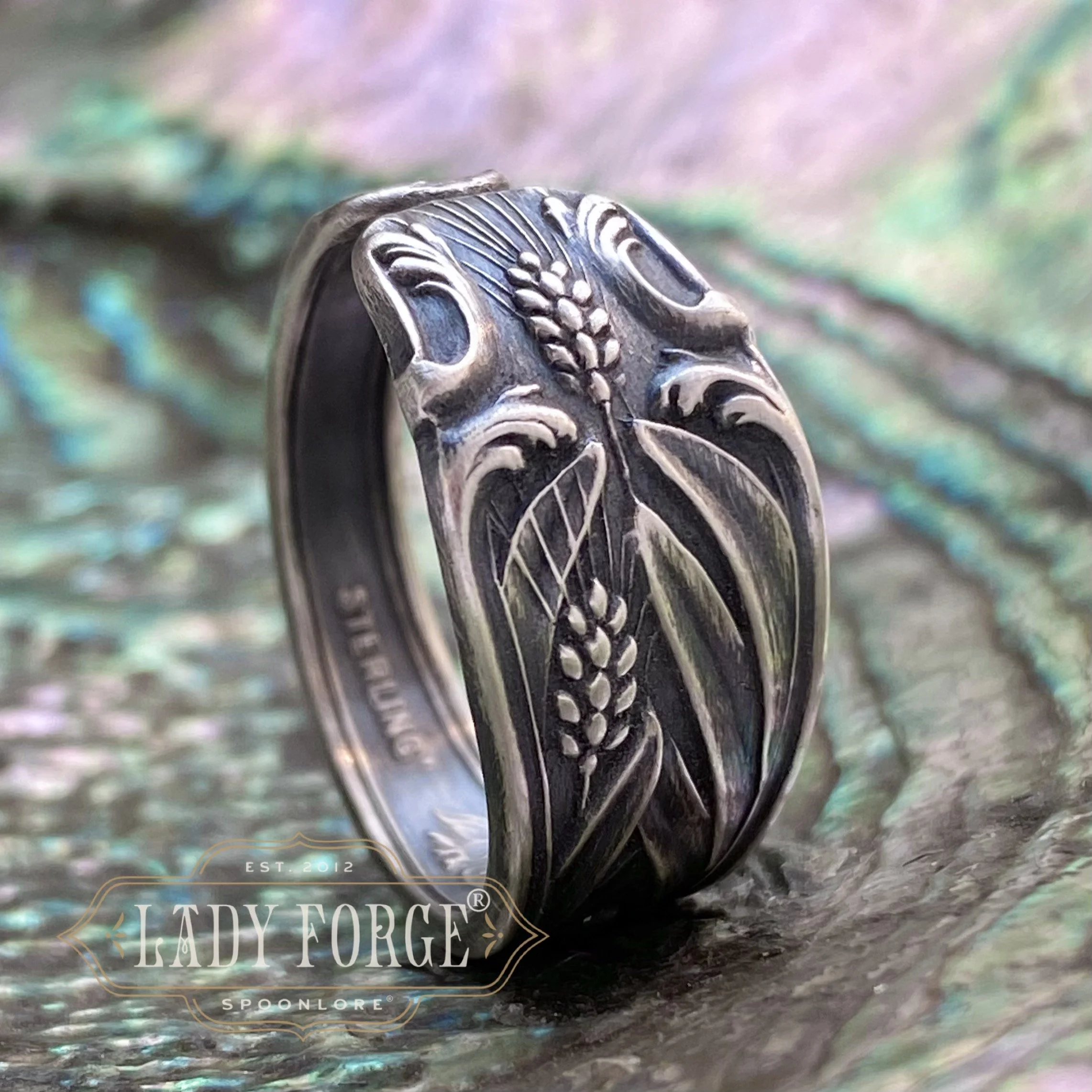 This sterling spoon ring was made from the Arkansas pattern designed by the Baker Manchester Co between 1890-1920